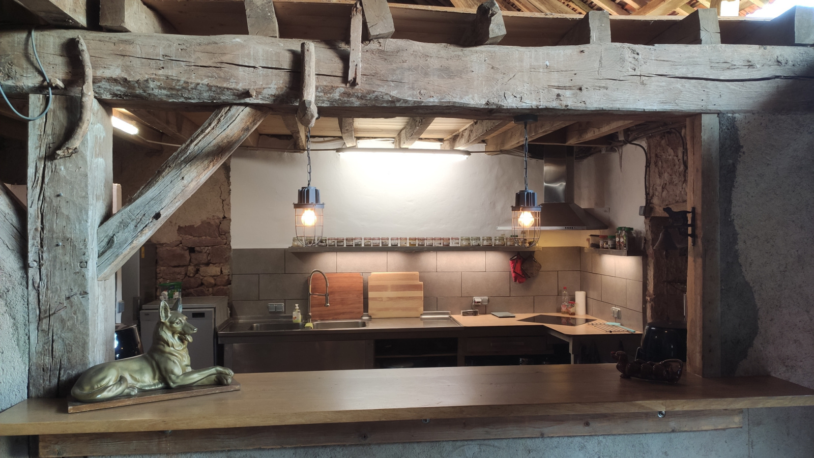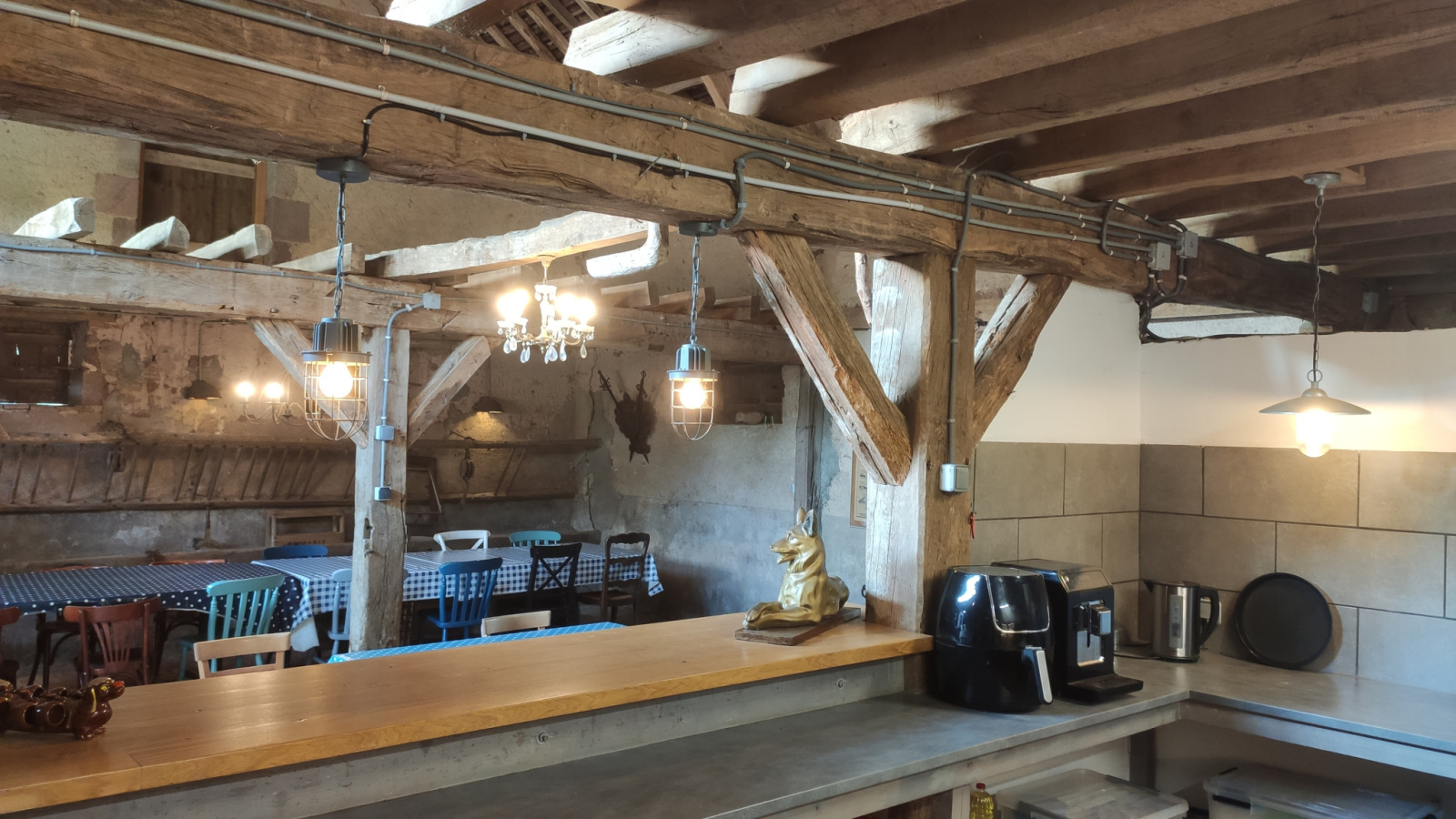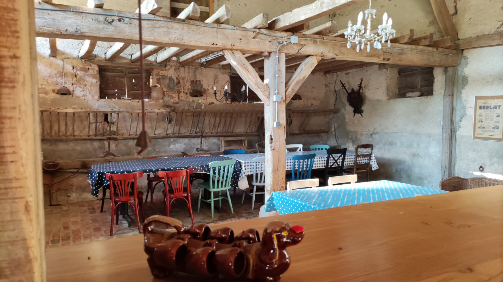 Dans la cour il y a une autre grange qui sert de table d'hôtes ; avec une cuisine avec double évier professionnel, four, cuisinière et 2 réfrigérateurs ; et une salle à manger pleine de charme. Ici, des repas sont servis plusieurs fois par semaine. Cela renforce la convivialité et est très apprécié par les invités.