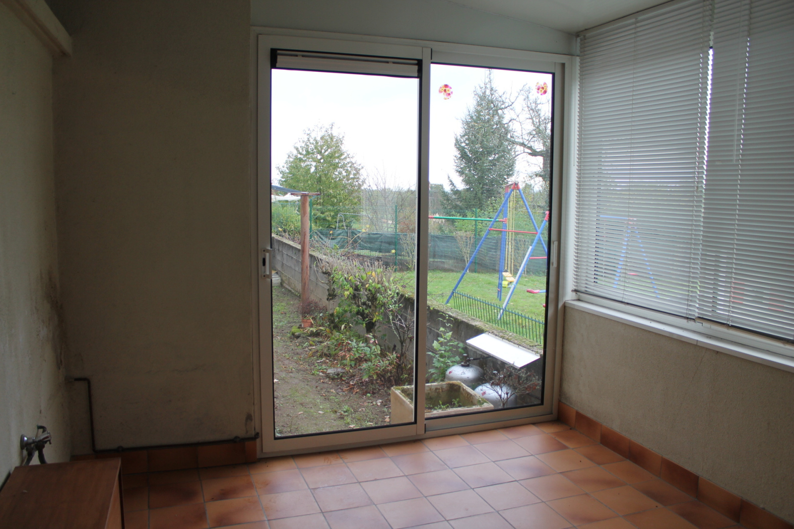 C'est également ici que se trouve la porte vers la véranda donnant accès à l'arrière de la maison avec une cave / remise et un passage vers le côté de la maison.