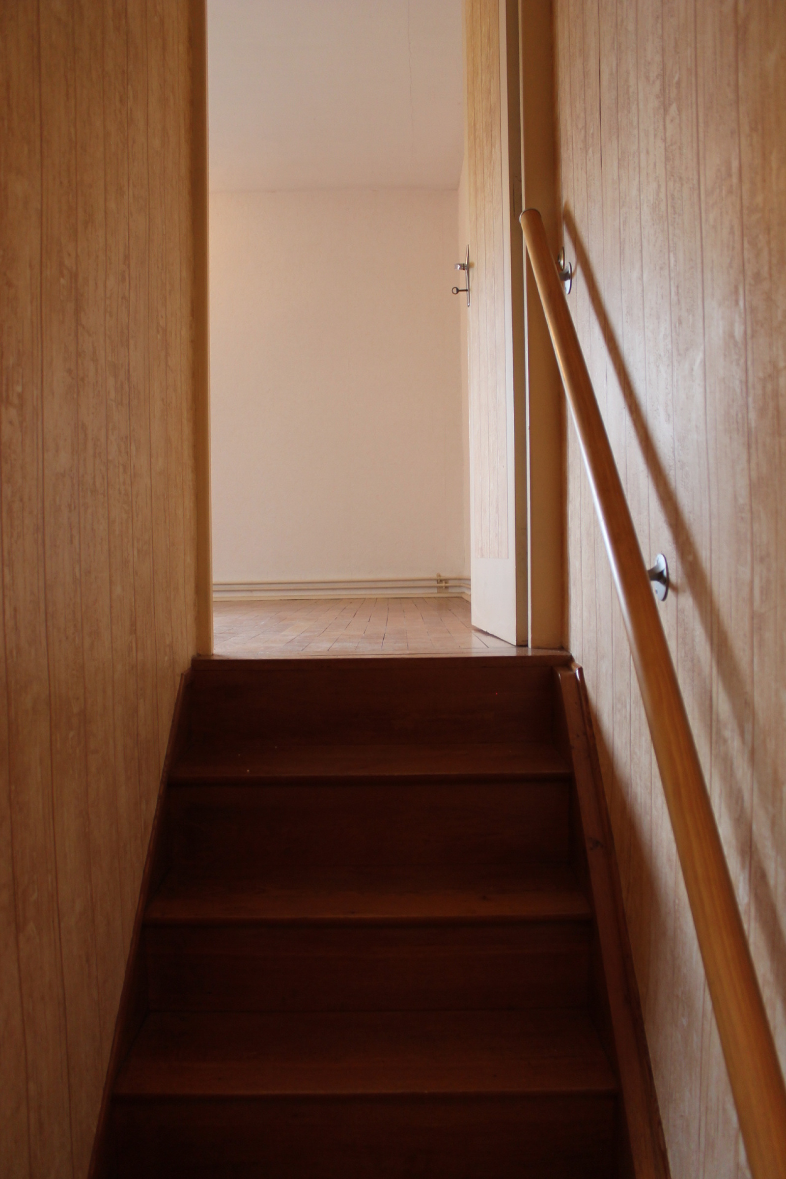 Si vous continuez, il y a un petit couloir avec une porte d'accès au garage attenant et un escalier tournant vers l'étage supérieur où il y a 1 chambre et un grenier qui pourrait être converti en une autre chambre.