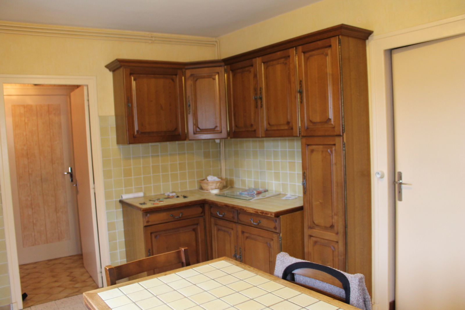 En passant la porte d'entrée, vous entrez dans le couloir avec sur votre droite la cuisine, derrière elle se trouve une buanderie avec accès à la salle de bain avec baignoire et douche et des toilettes séparées.