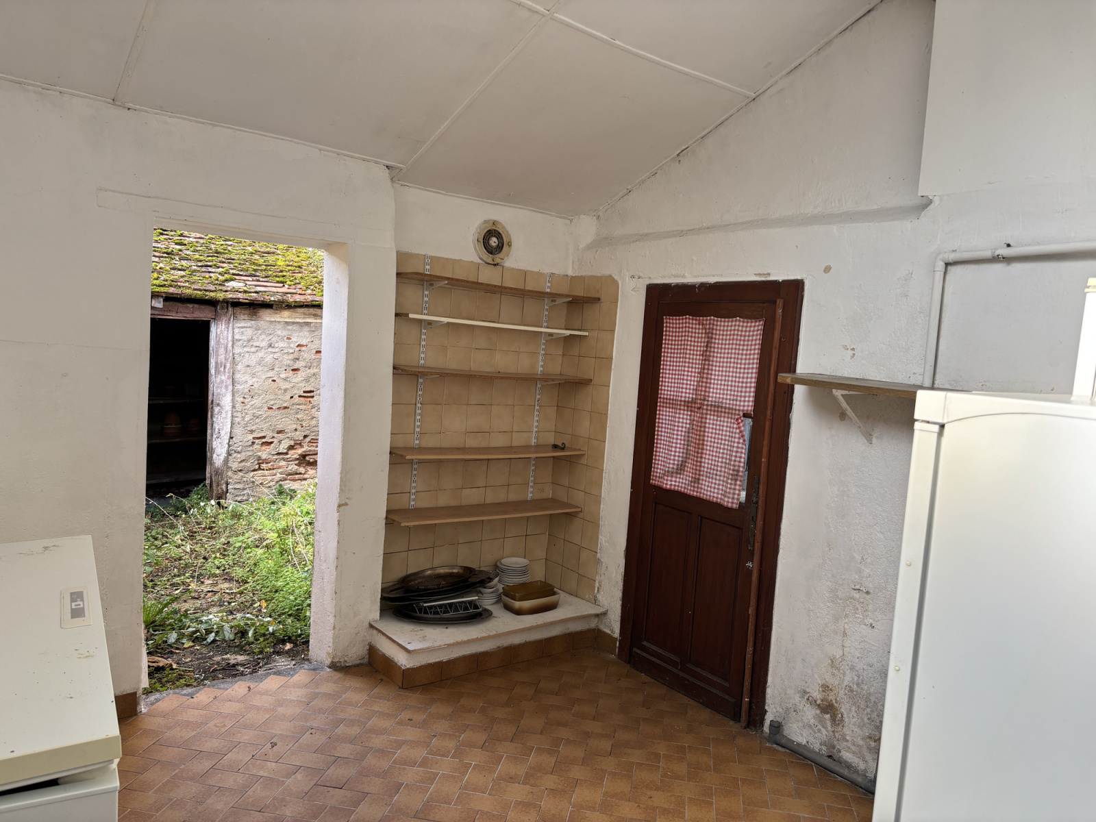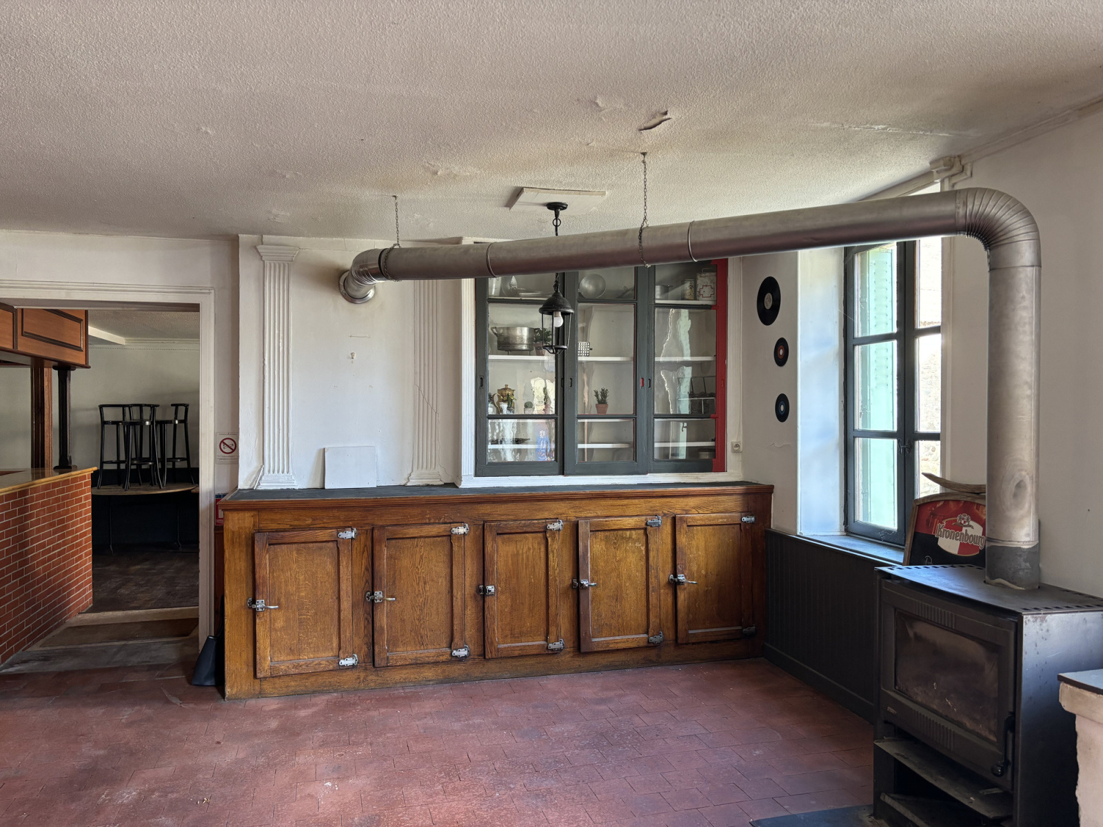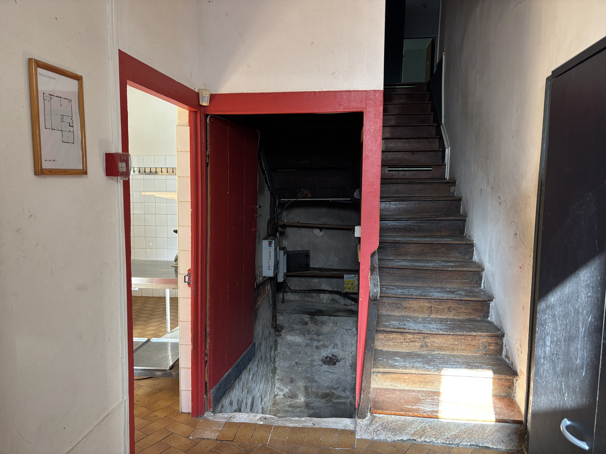 La propriété dispose de plusieurs entrées. Au rez-de-chaussée se trouve un vaste espace de restauration de 58 m² avec un bar. Une porte donne accès à la cour intérieure depuis cette pièce. Il y a également une cuisine, une arrière-cuisine, une pièce supplémentaire pouvant servir de deuxième entrée, des toilettes et une buanderie donnant également accès à la cour intérieure.