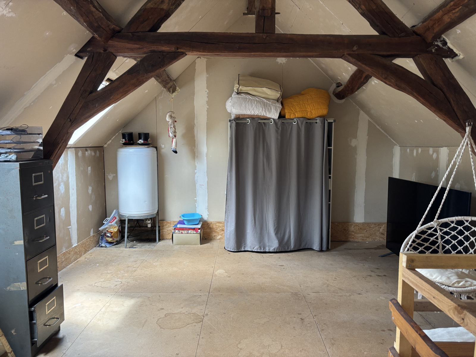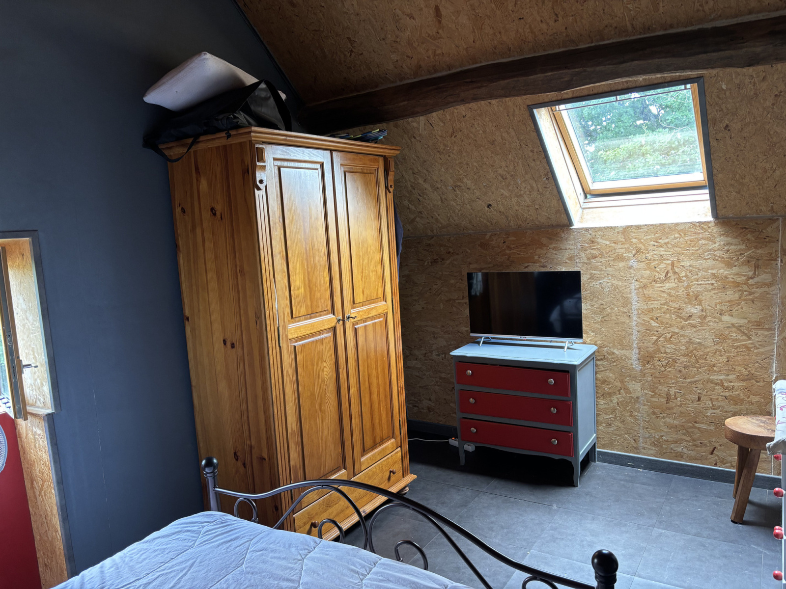À l'étage supérieur se trouve un grand palier (ancienne chambre) où la rénovation doit encore être terminée, et à gauche de celui-ci, une deuxième chambre.