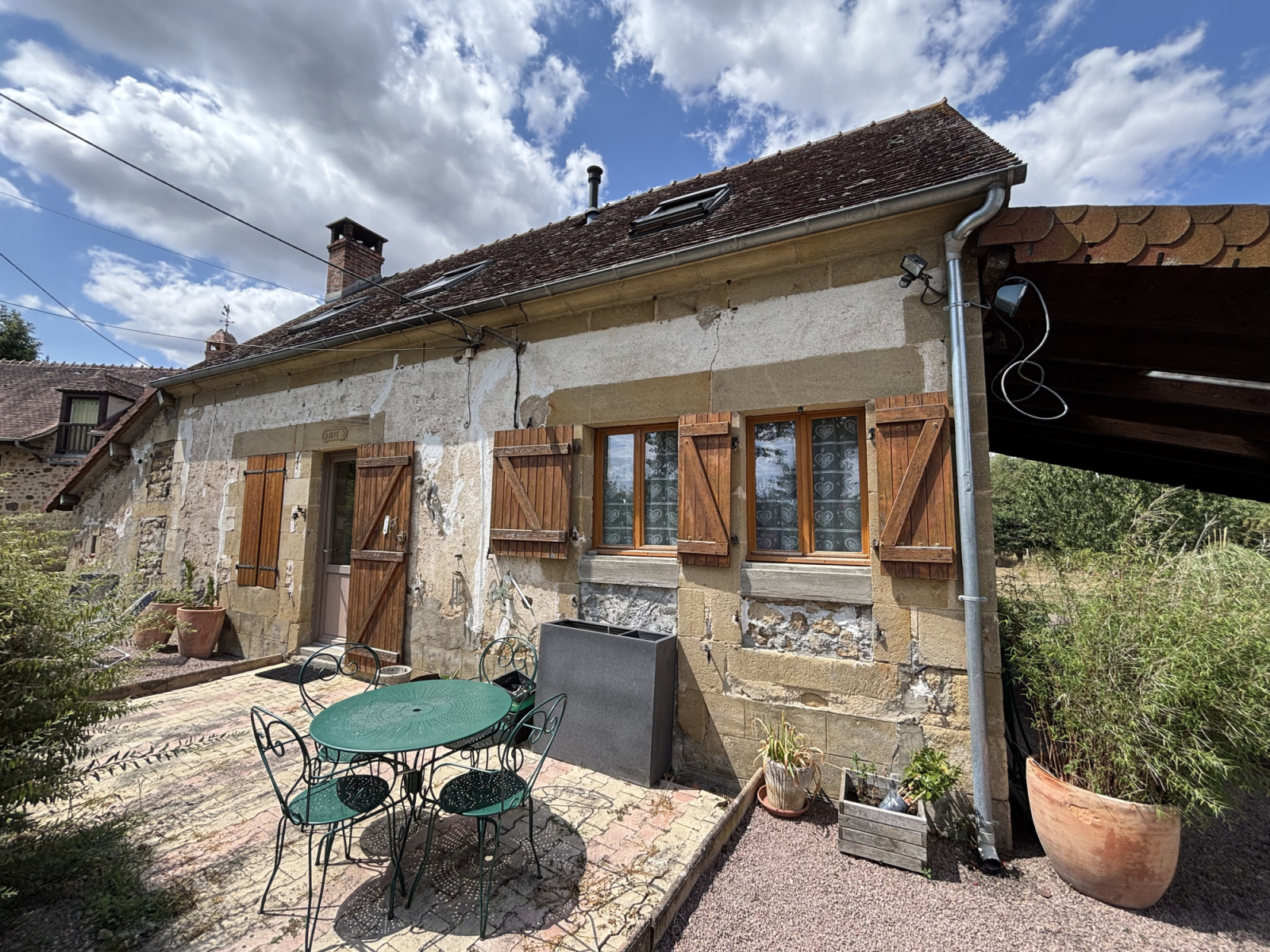 La maison dispose de volets en bois, d'un toit en bon état et est située dans un environnement calme, entouré de champs.