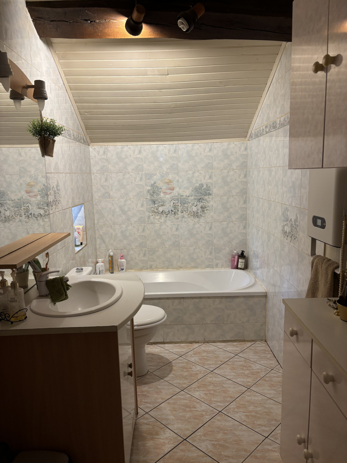 Depuis la salle à manger, une porte à gauche mène à la salle de bains avec baignoire, toilettes et lavabo, et une autre porte mène à une chambre qui sert actuellement de salon.