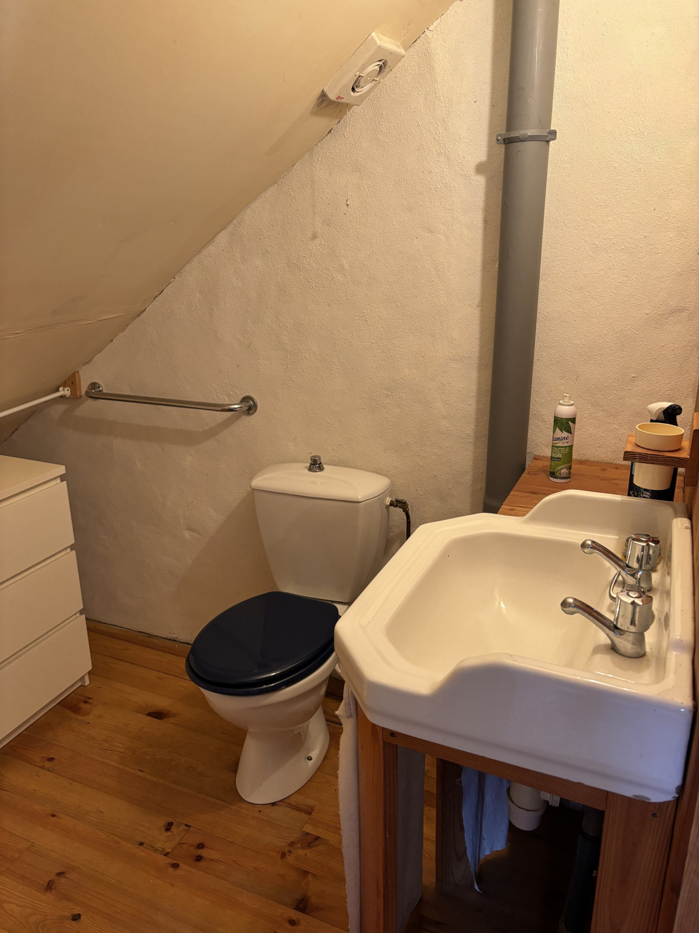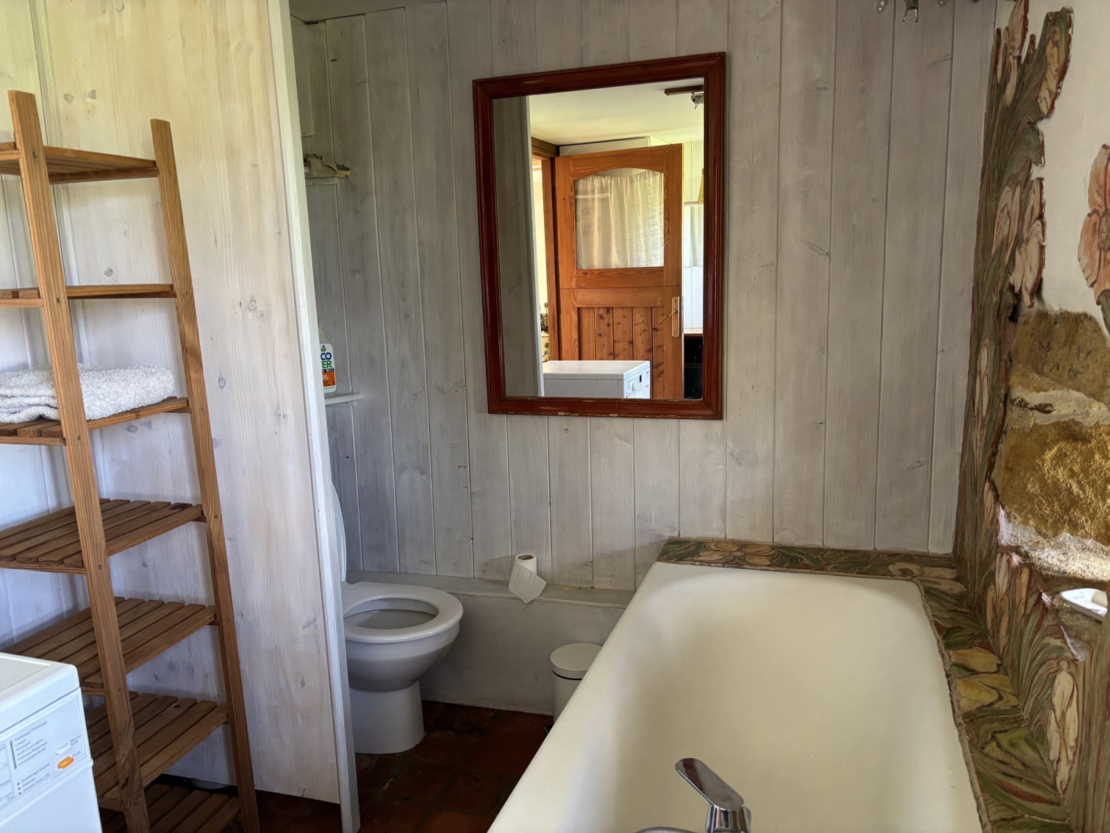 Depuis la cuisine, on accède à la salle de bains équipée de toilettes, d'un lavabo, d'une baignoire et d'un branchement pour une machine à laver.