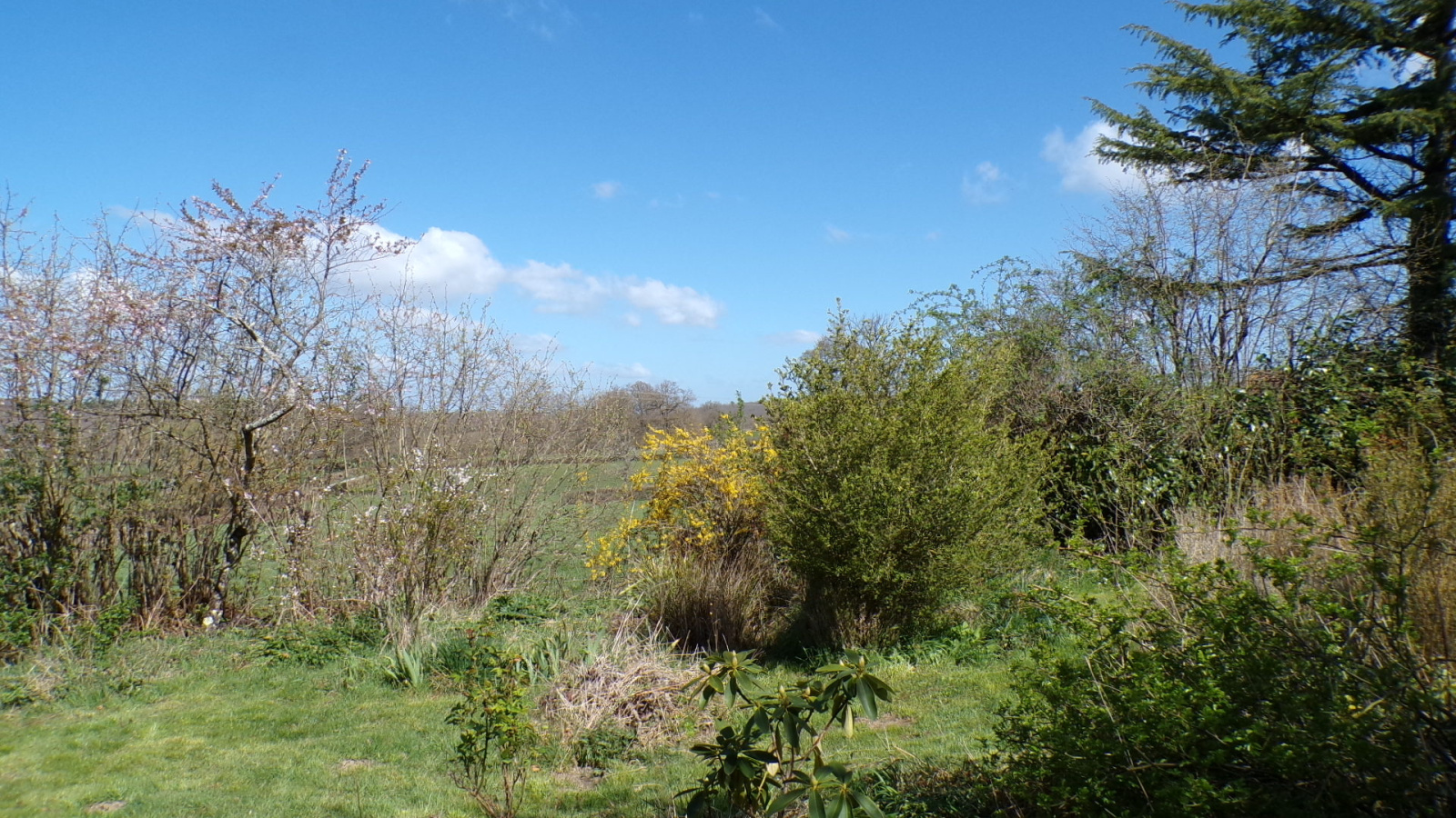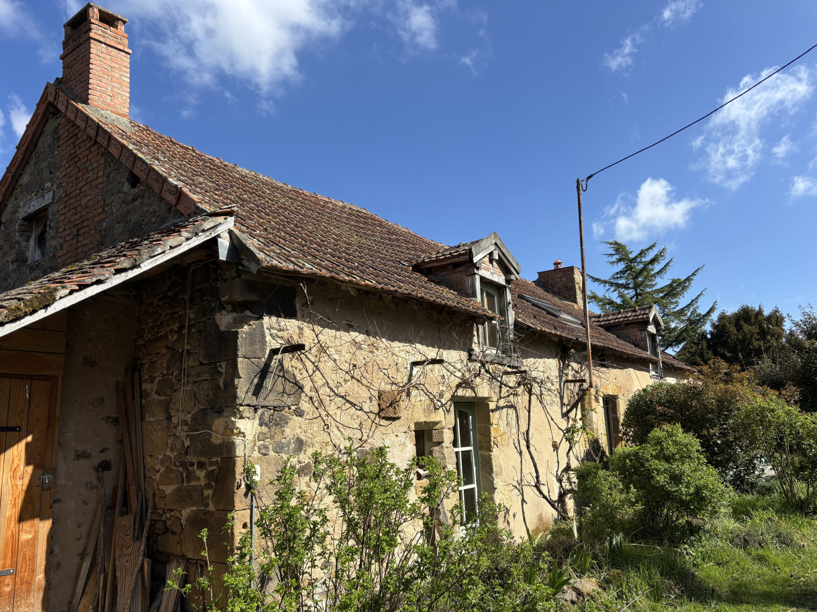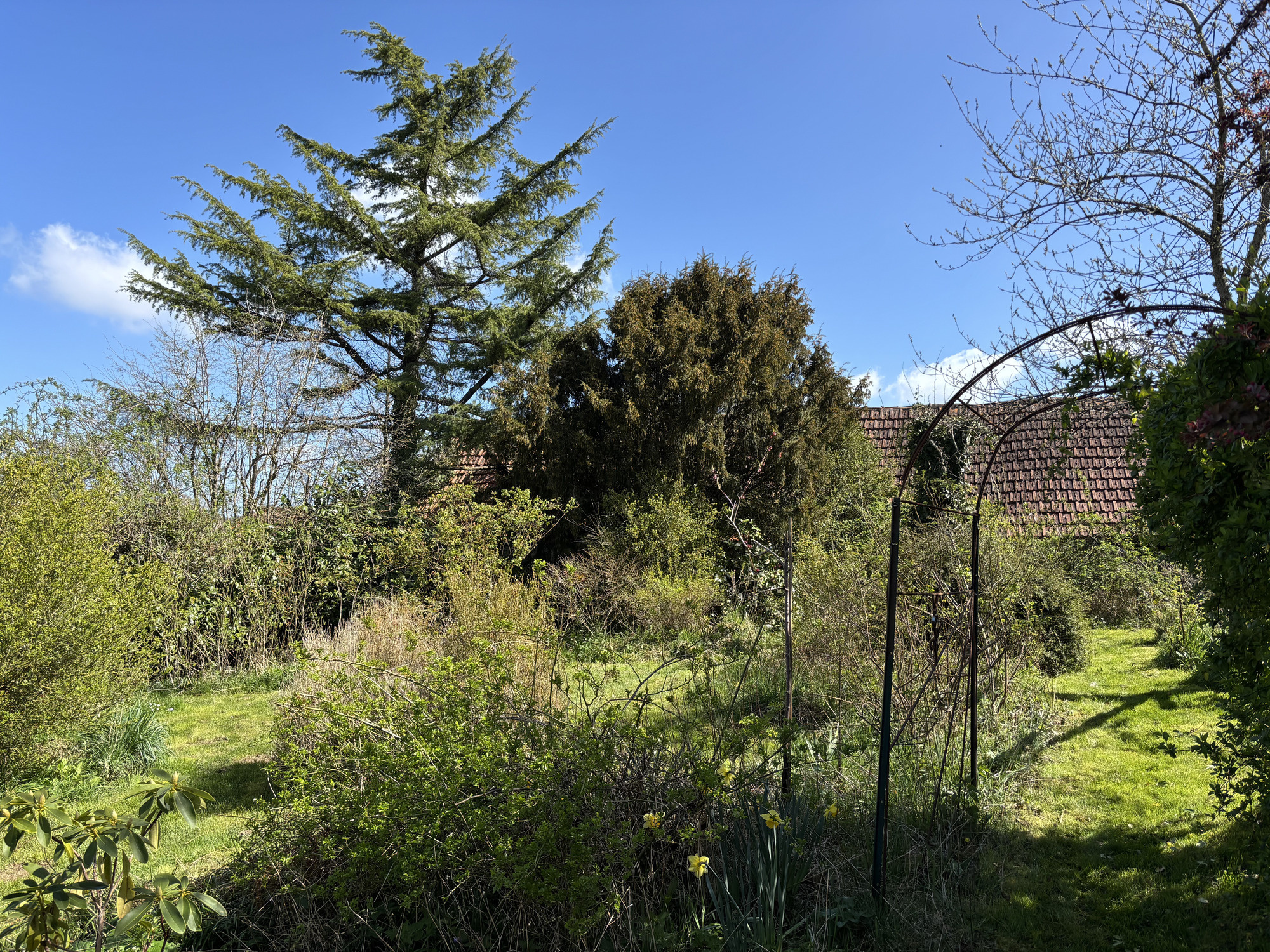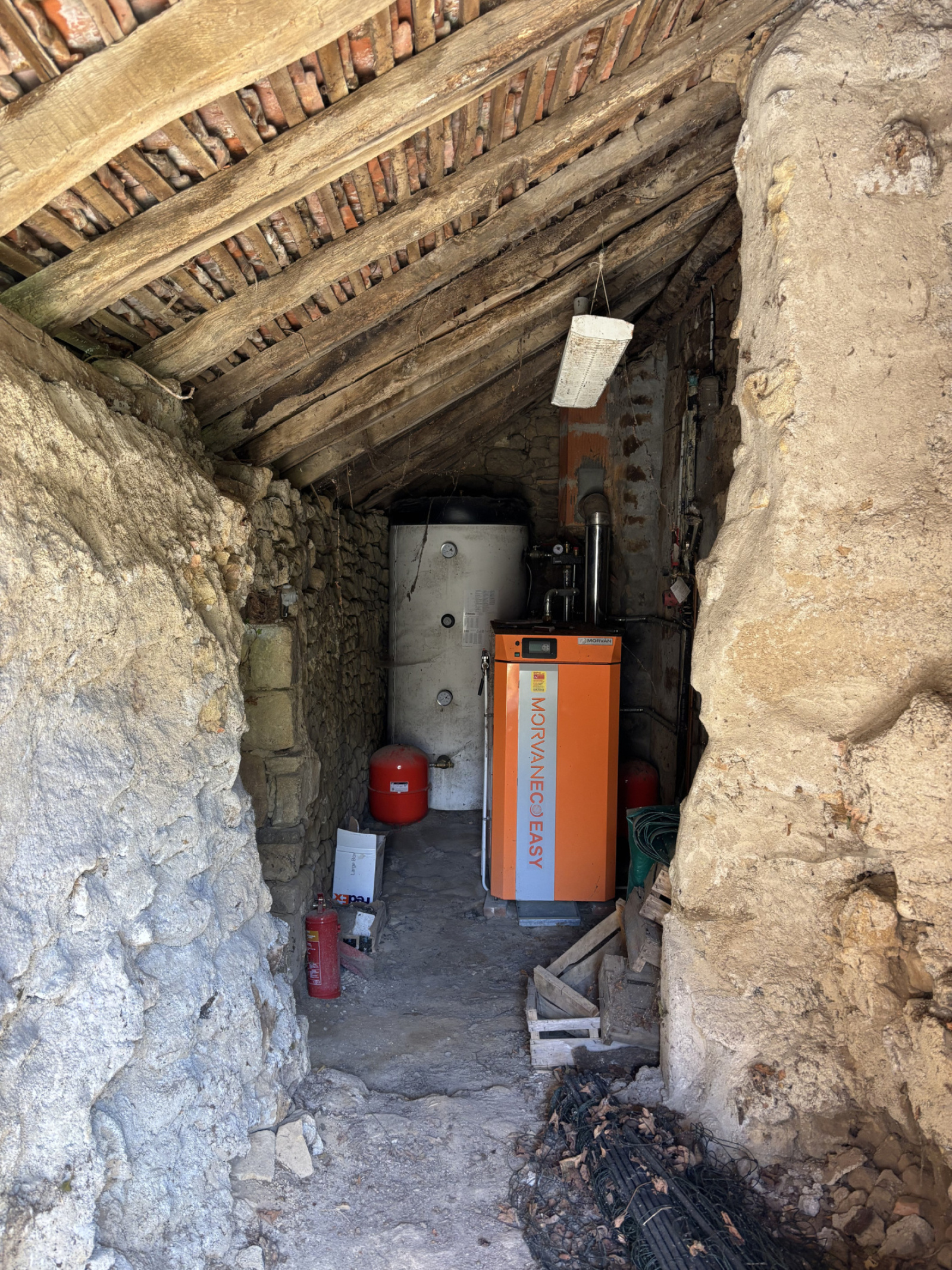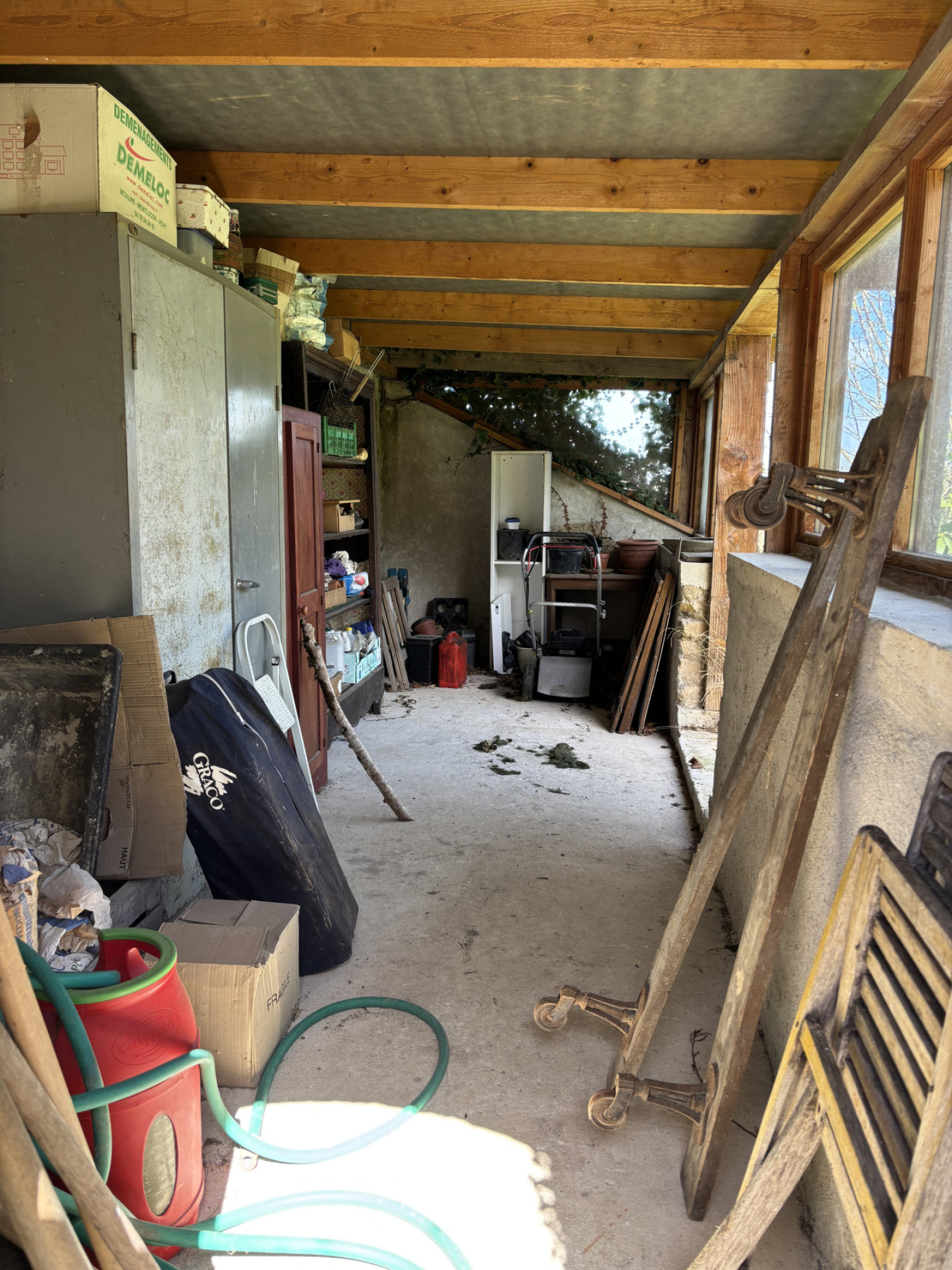 À gauche de la maison se trouvent deux granges, dont l'une abrite la chaudière à bois. À droite de la maison se trouve une petite extension ouverte sur le jardin, actuellement utilisée comme espace de stockage pour les outils de jardin, mais qui pourrait être convertie en atelier ou en une belle cuisine extérieure.