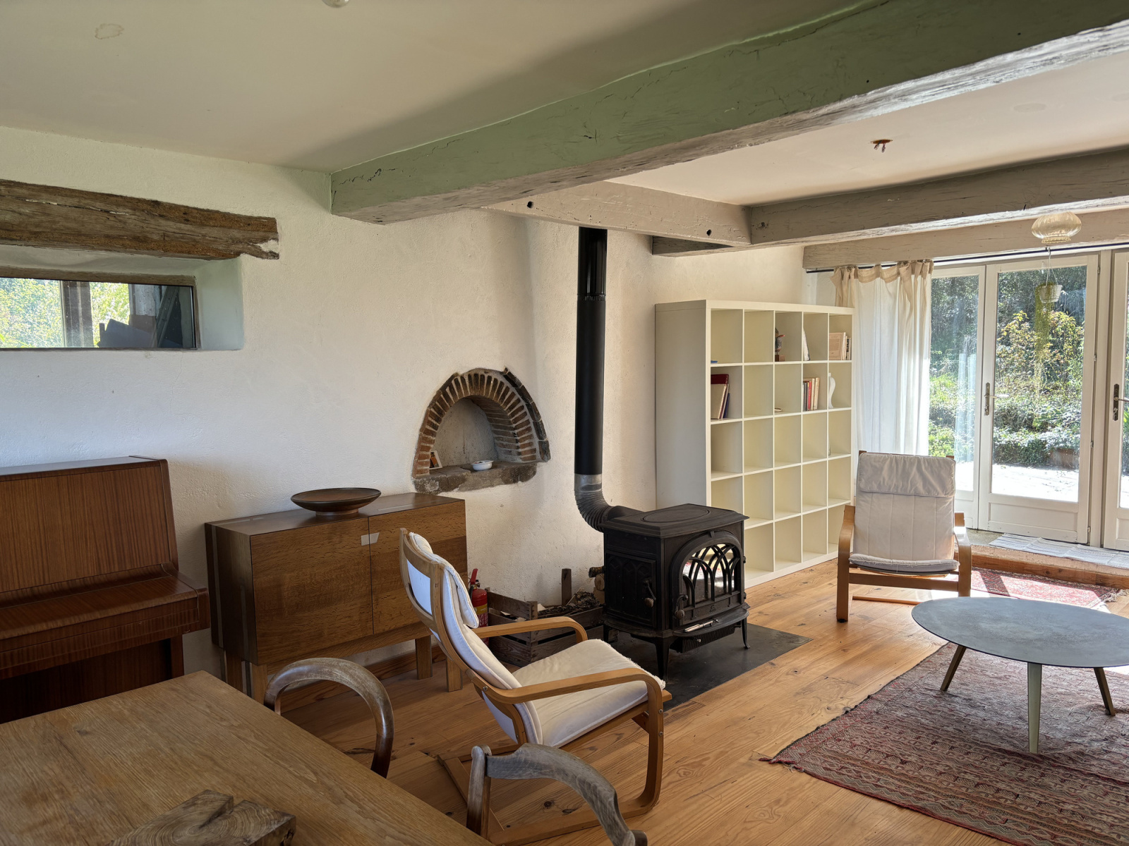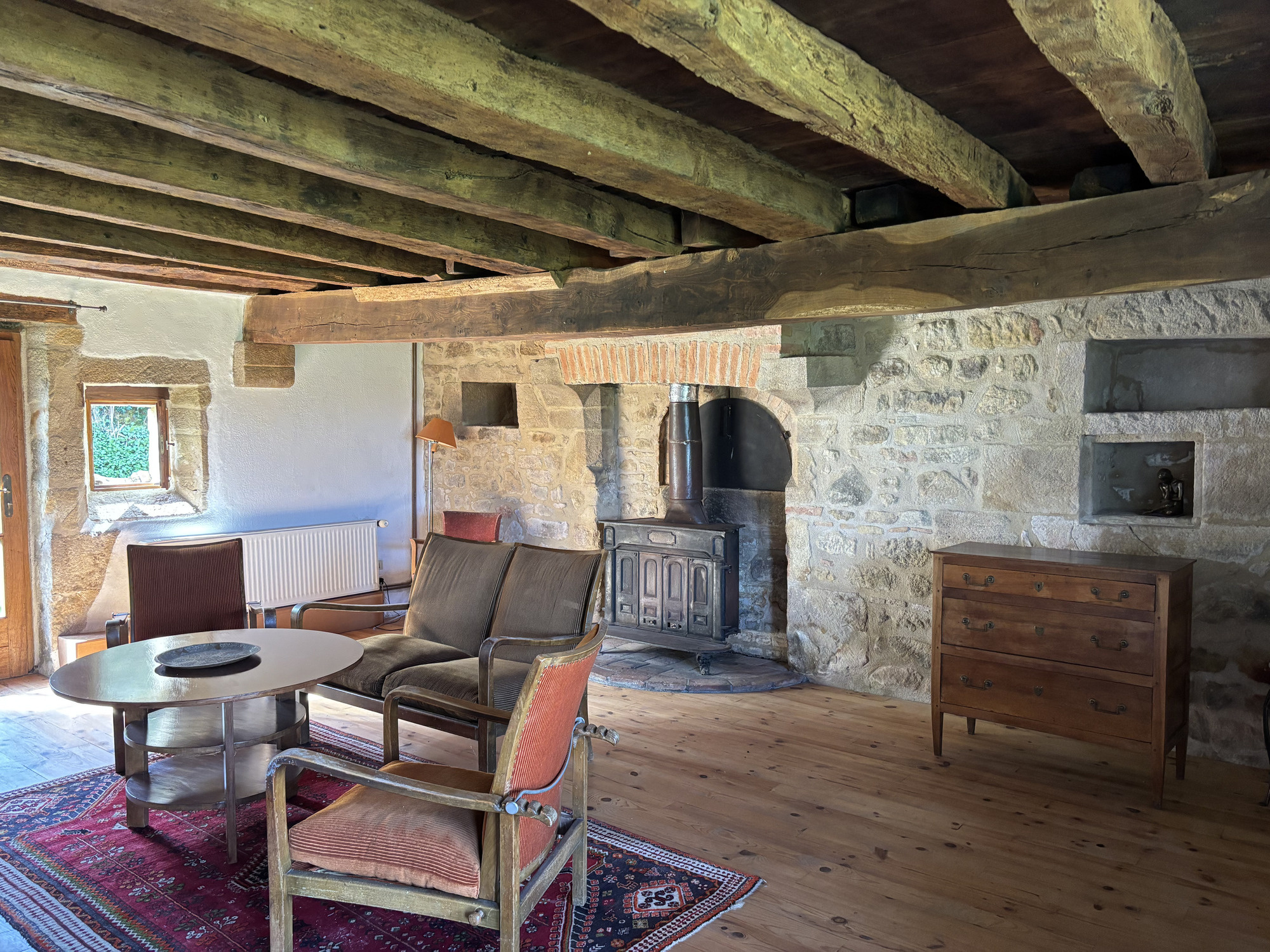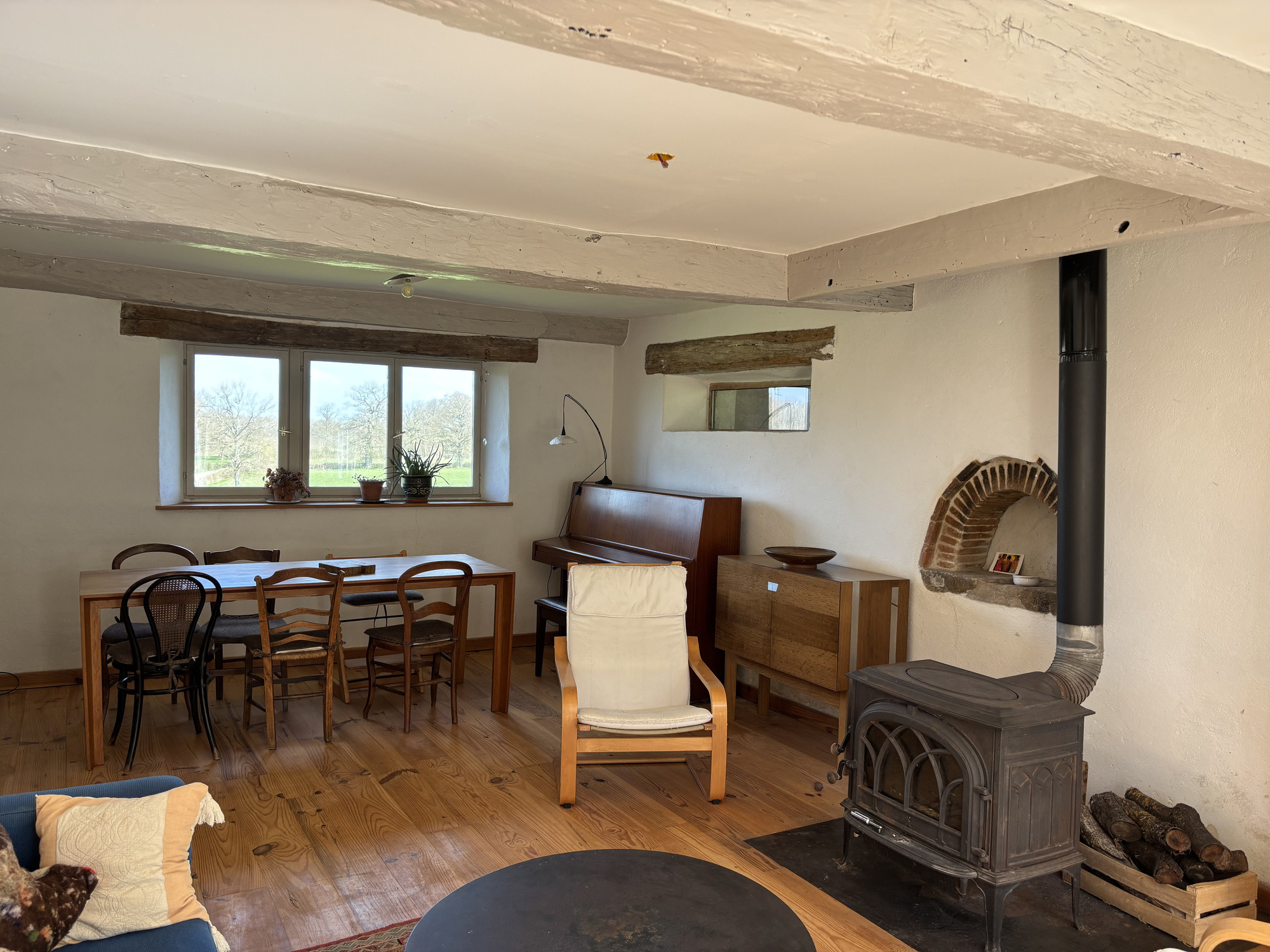 À gauche de la cuisine, un passage mène à un premier espace de vie spacieux. Vous y trouverez la deuxième porte d'entrée, une porte arrière et plusieurs fenêtres offrant une belle vue dégagée sur le bocage bourbonnais préservé et la lisière de la forêt. L'espace est caractérisé par un poêle à bois, un ancien four à pain, un mur en pierre et des poutres apparentes.