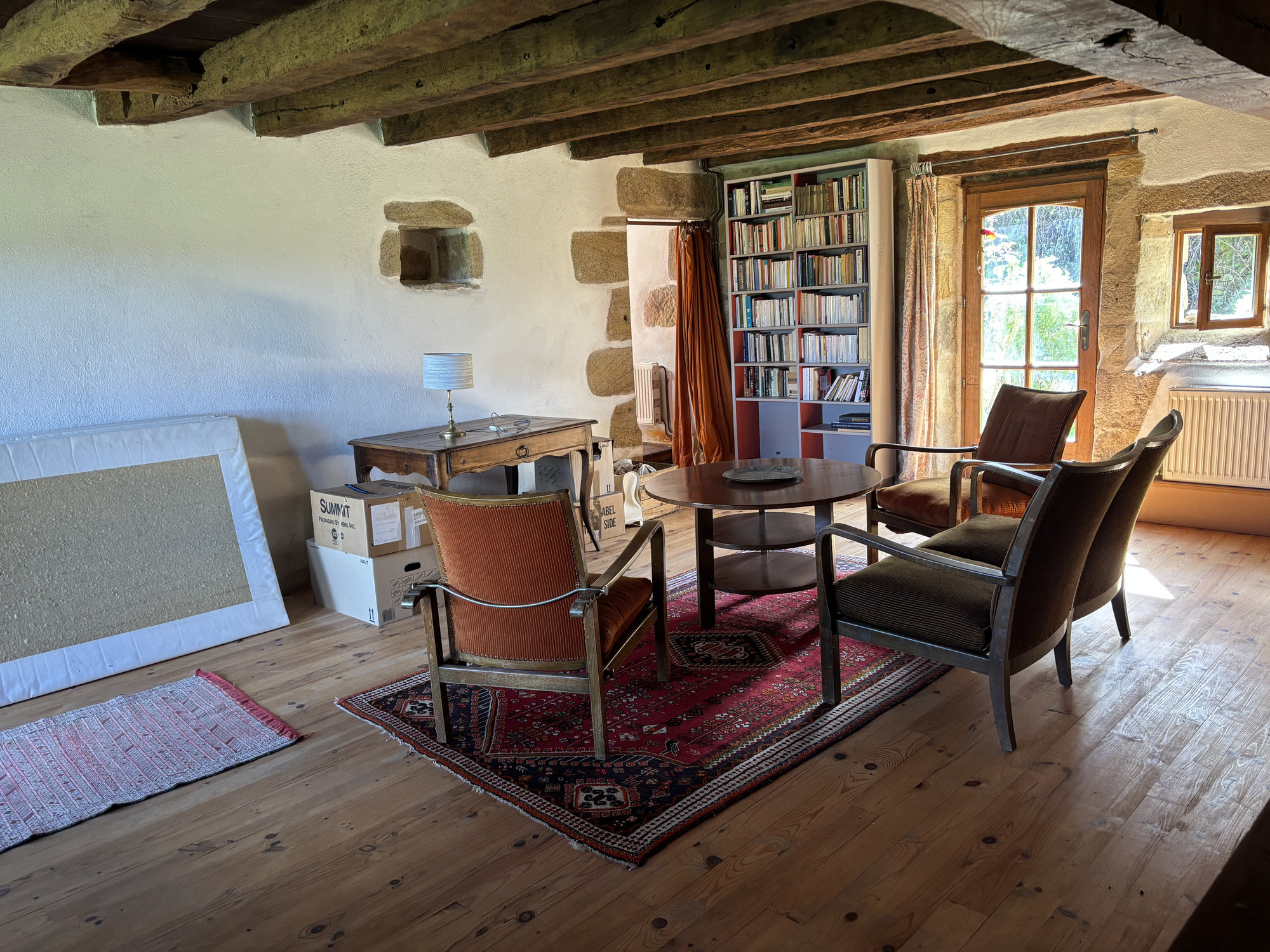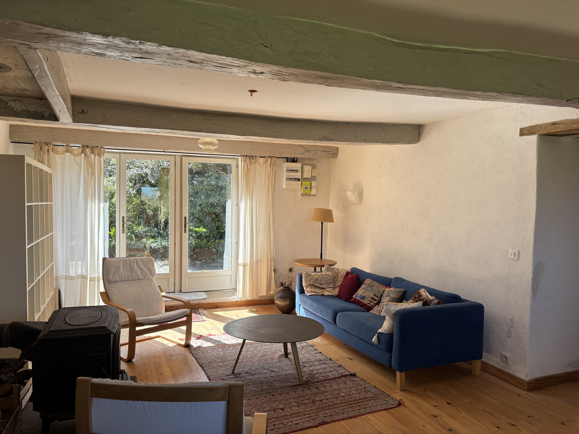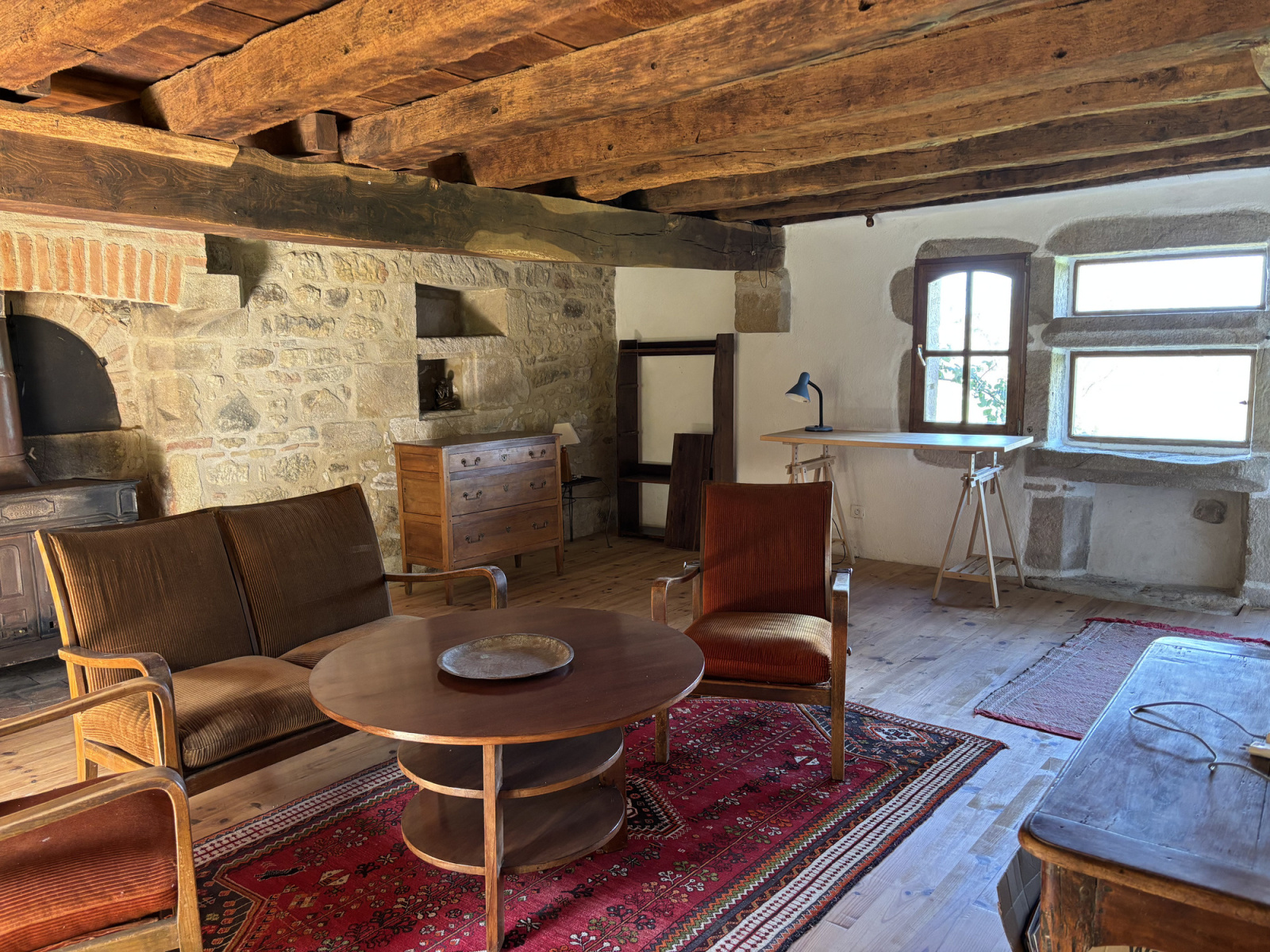 À gauche de la cuisine, un passage mène à un premier espace de vie spacieux. Vous y trouverez la deuxième porte d'entrée, une porte arrière et plusieurs fenêtres offrant une belle vue dégagée sur le bocage bourbonnais préservé et la lisière de la forêt. L'espace est caractérisé par un poêle à bois, un ancien four à pain, un mur en pierre et des poutres apparentes.