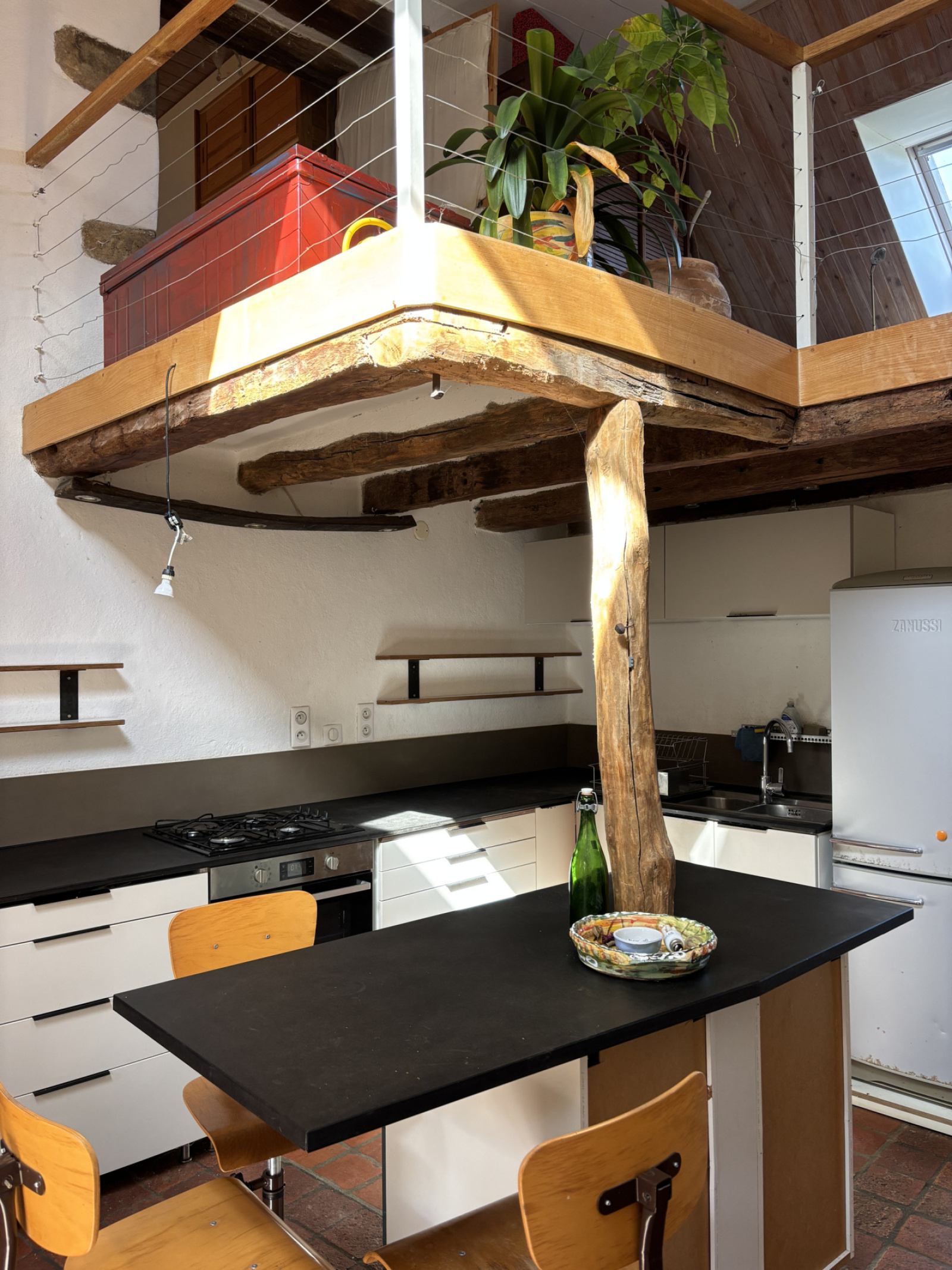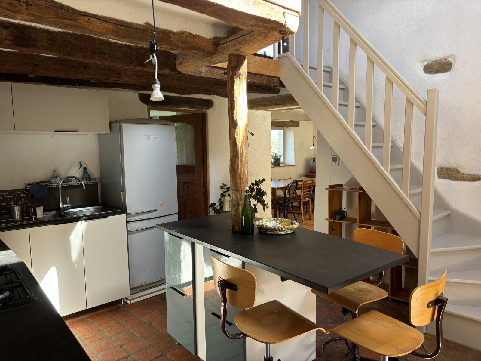 La maison a deux entrées. La première mène directement à la cuisine lumineuse. Celle-ci est équipée d'un sol en tomettes, d'une plaque de cuisson au gaz et d'un îlot de cuisine.