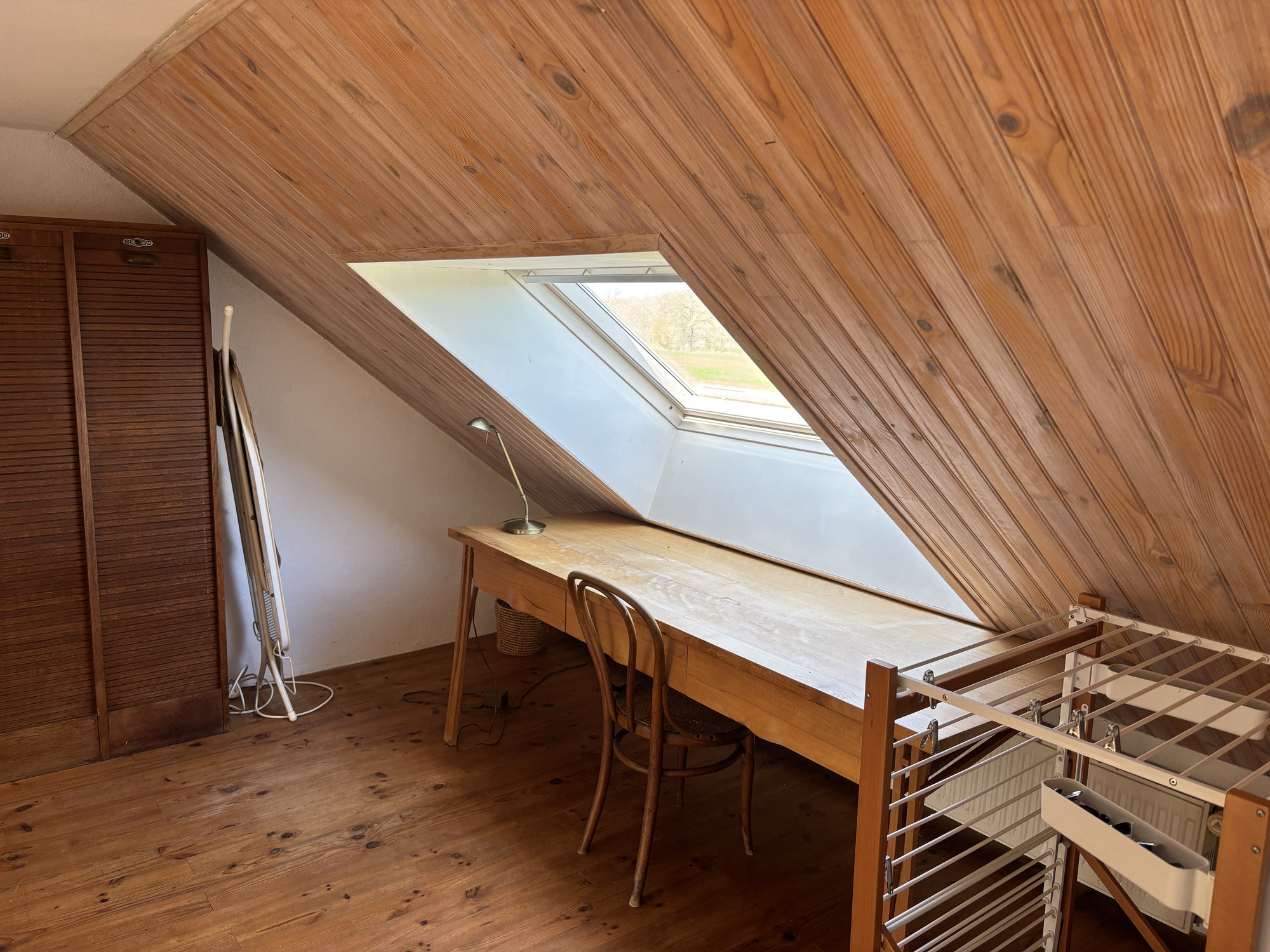 On accède au premier étage par un escalier situé dans la cuisine. La mezzanine est aménagée en bureau. À droite se trouve une chambre spacieuse et lumineuse. À gauche se trouve la deuxième chambre, également spacieuse et lumineuse, et équipée d’un cabinet de toilettes.