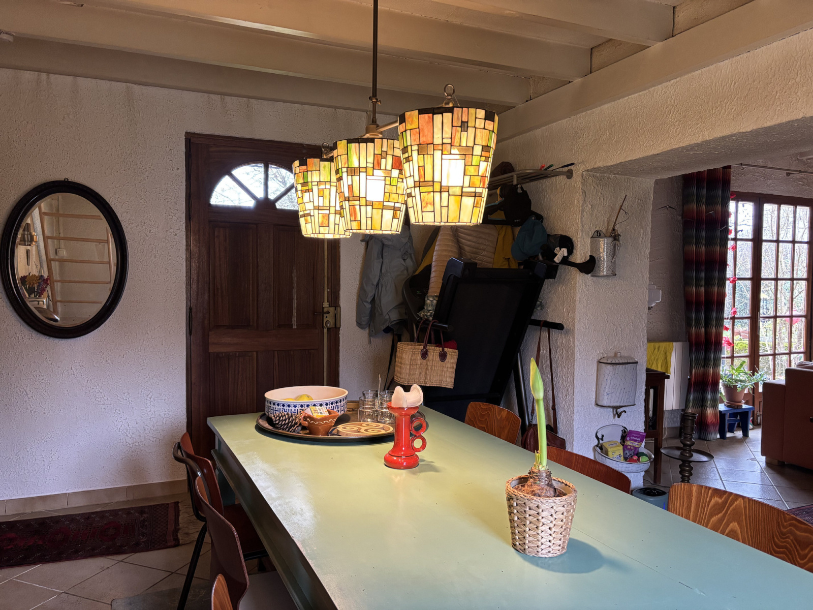 L'escalier de meunier dans la salle à manger mène à l'étage supérieur, où se trouve une grande pièce ouverte avec un mur en pierre, un coin bureau, des placards, un radiateur et une lucarne. Cette pièce donne accès à la deuxième chambre, très spacieuse et lumineuse, qui dispose également d'un radiateur et d'une lucarne.