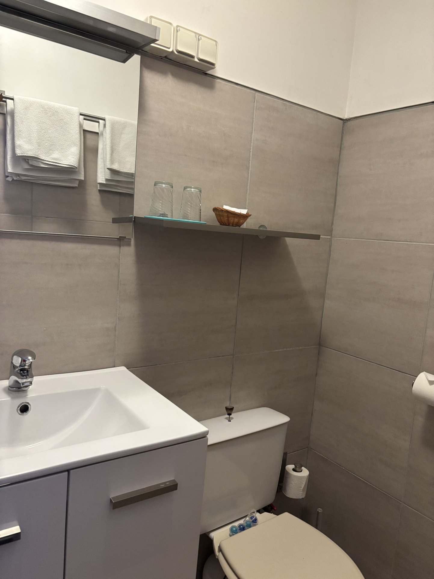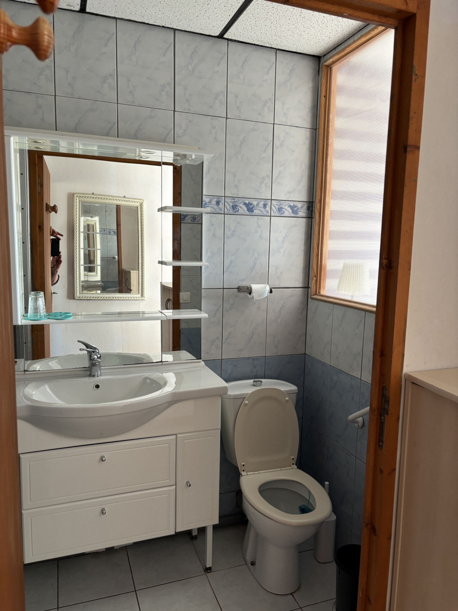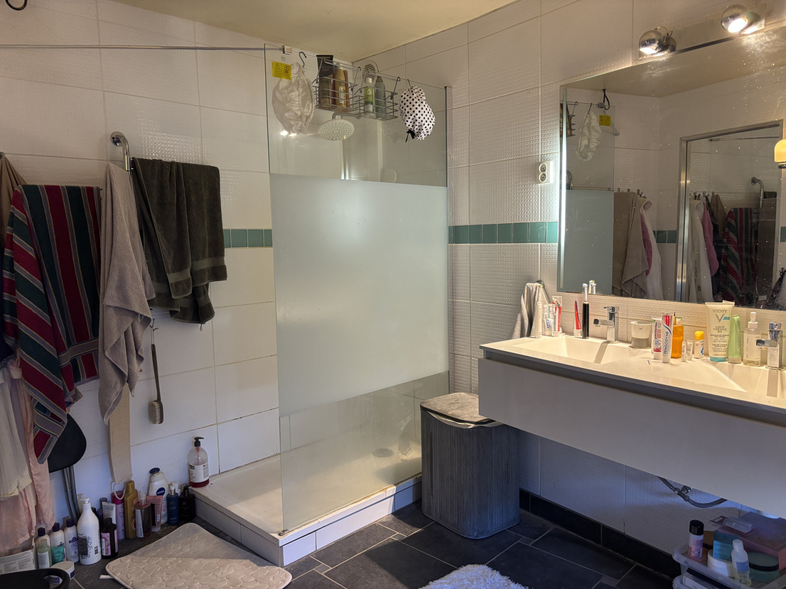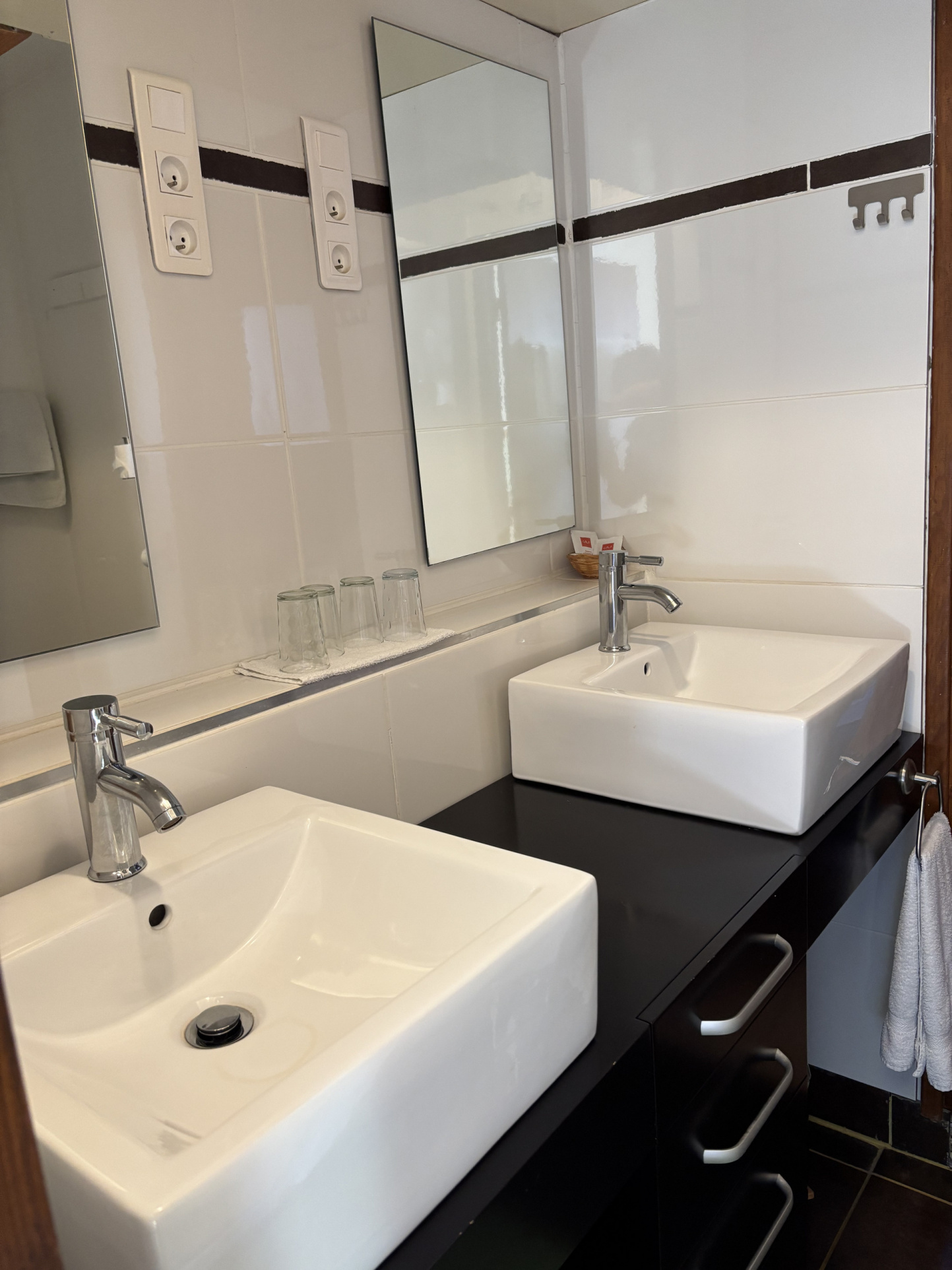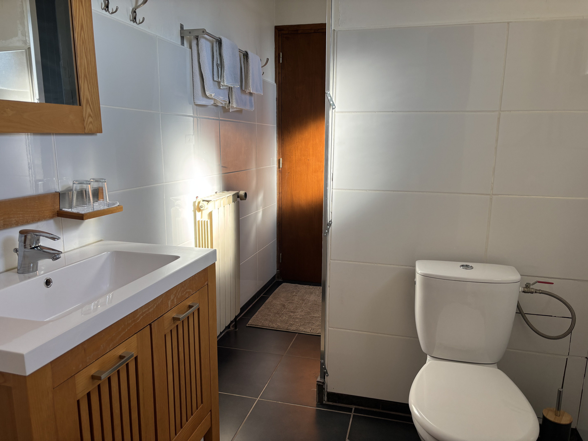 À droite : deux chambres séparées partageant une salle de bain équipée de toilettes, double lavabo et cabine de douche, louées comme chambre familiale.