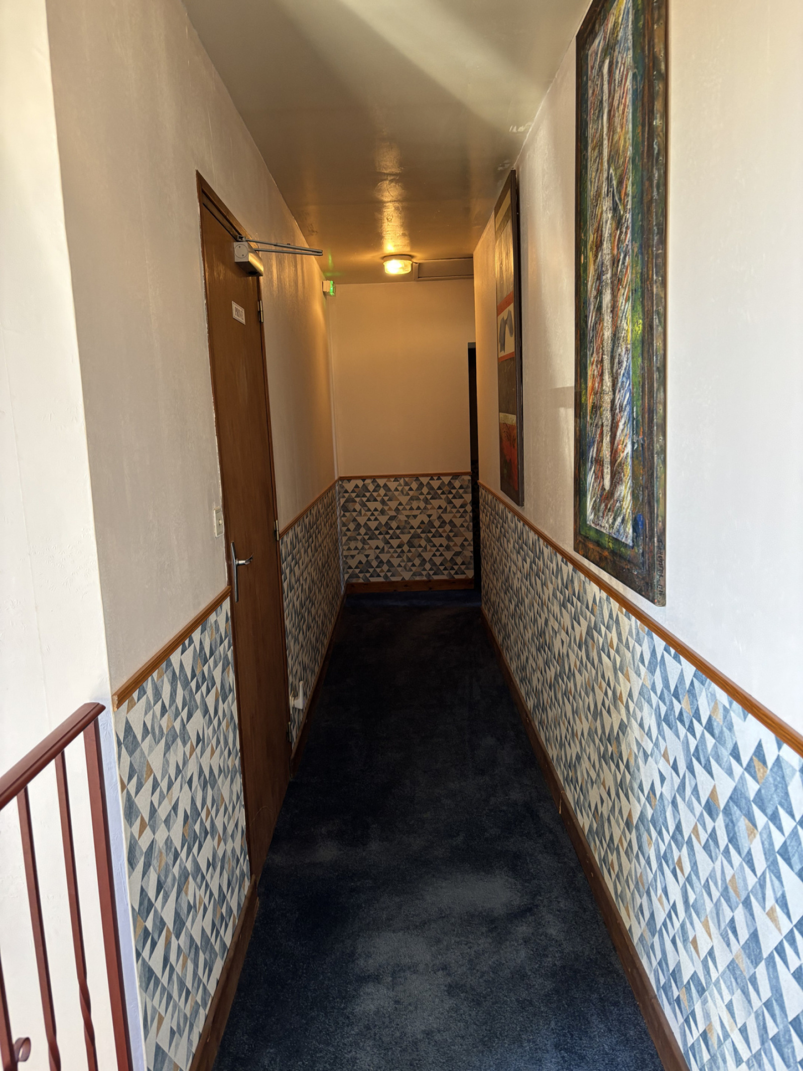 Depuis la salle à manger, une porte à gauche mène à l’espace chambres. Au rez-de-chaussée se trouve une chambre PMR avec salle de bain privative (toilettes, lavabo, cabine de douche) et une terrasse privée. Depuis le couloir, il y a une porte indépendante permettant aux clients d’aller et venir librement, ainsi qu’un escalier menant à l’étage.