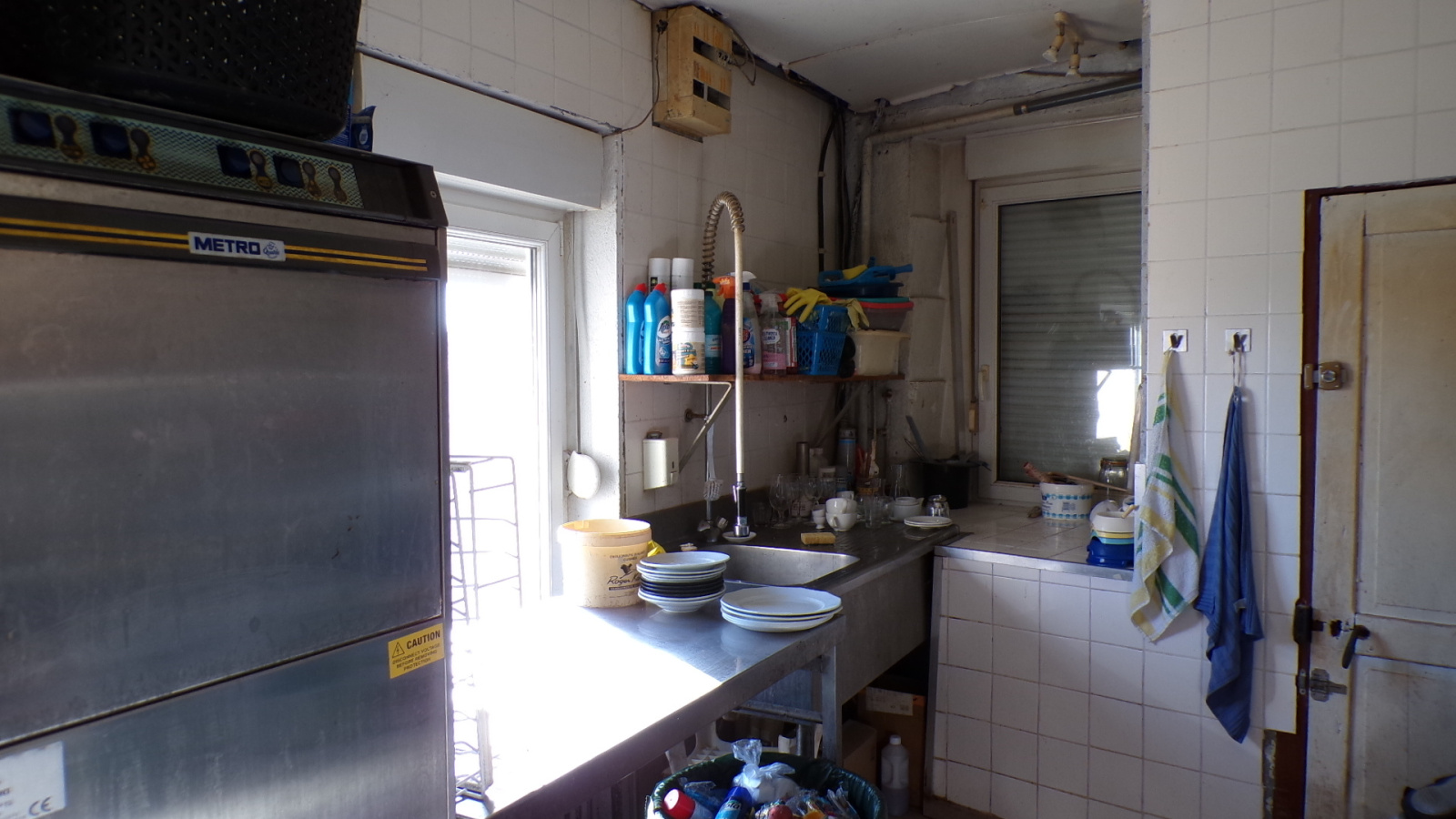 Ce couloir mène à l’espace plonge, équipé de raccordements pour machines à laver et lave-vaisselle. Il sert également comme espace de stockage et il y a une porte vers l’une des caves
