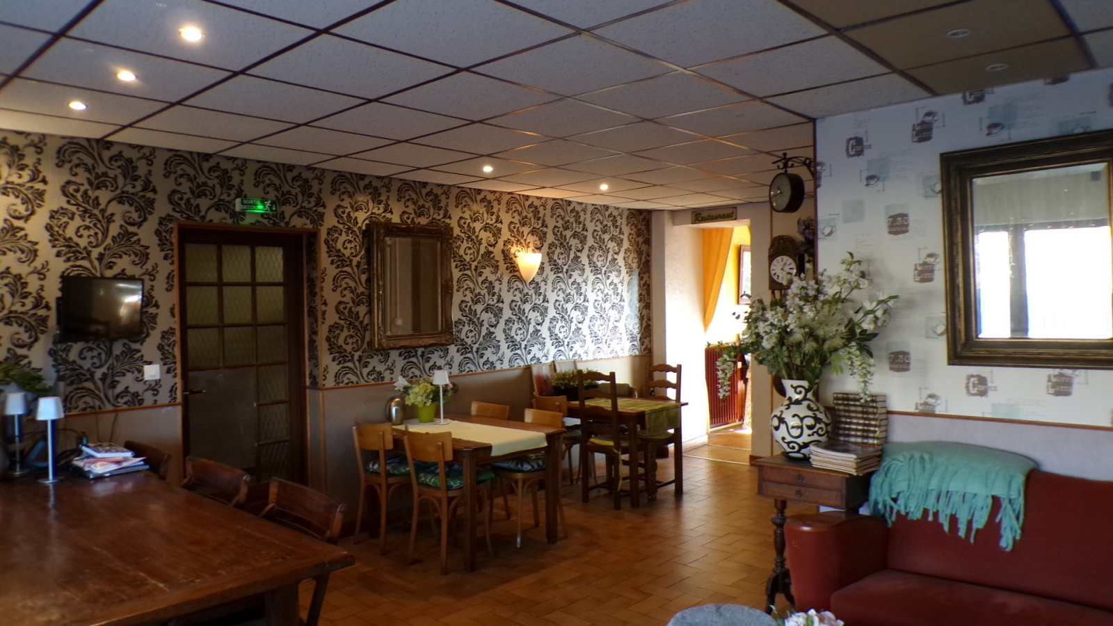 À gauche de l’entrée, un passage mène à la salle à manger où le petit-déjeuner est servi, avec un coin salon pour les invités. Vous y trouverez également des toilettes pour dames/PMR (Personne à Mobilité Réduite) et des toilettes pour hommes.
