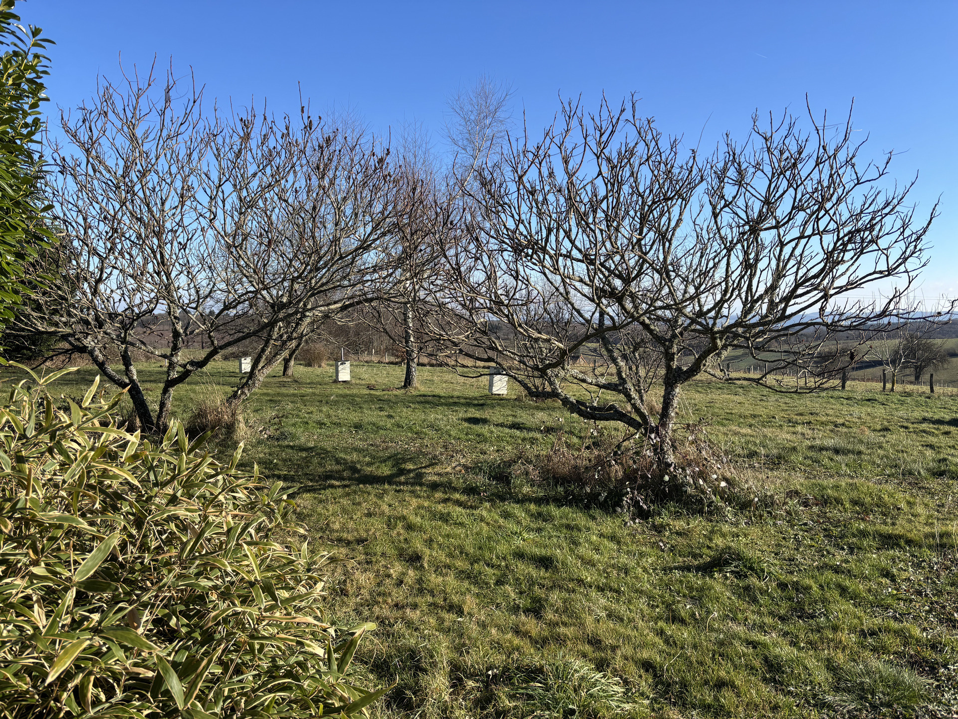 Depuis la porte de la cuisine, vous accédez au jardin. Ici se trouvent une porte vers une cave, une entrée pour le terrain, et deux granges de stockage.