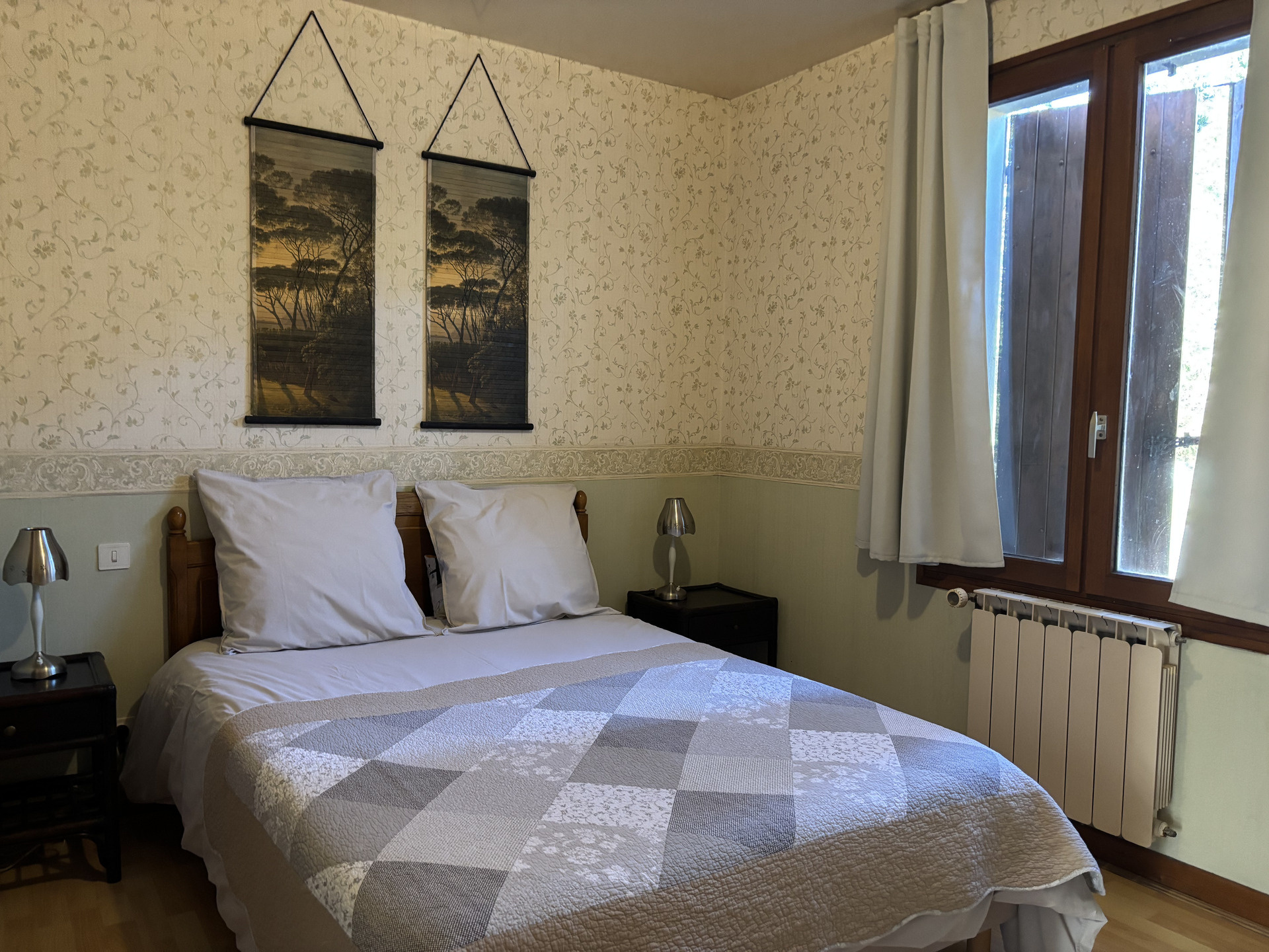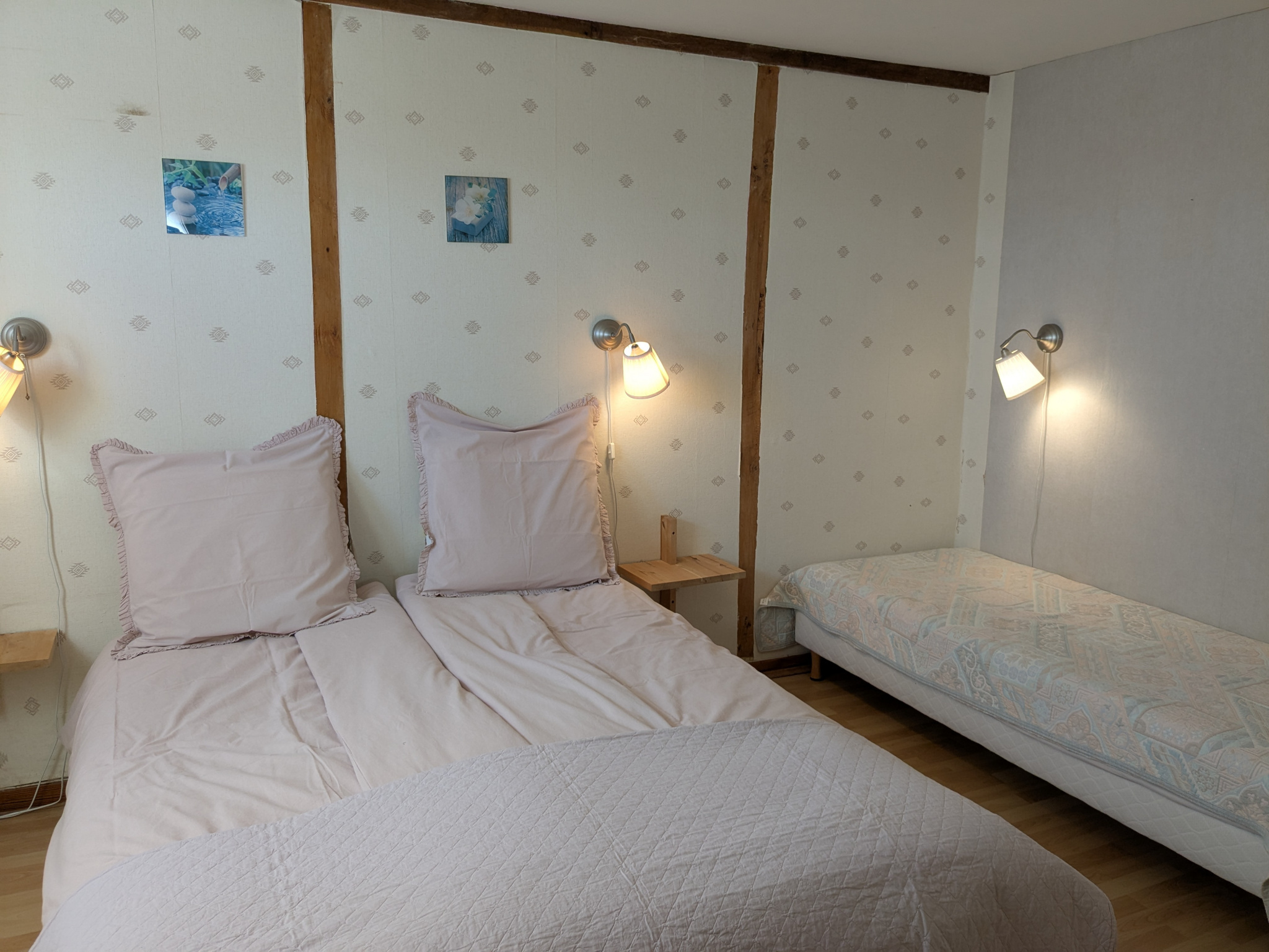 En face de l’escalier : une chambre double avec salle de bain privative (toilettes, lavabo, douche).
