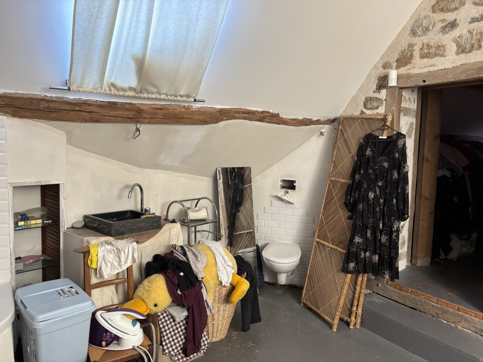 Depuis la pièce de vie, un escalier mène à l'étage supérieur, où un palier spacieux donne accès aux chambres. À gauche se trouve une chambre qui pourrait éventuellement être agrandie en ajoutant une partie du palier à l'espace. A droite, un passage mène à une pièce utilisée comme chambre avec un grenier ouvert pour du rangement, et il y a un couloir vers une chambre spacieuse et lumineuse avec un mur en pierre, une baignoire d'angle, un lavabo et des toilettes privées.