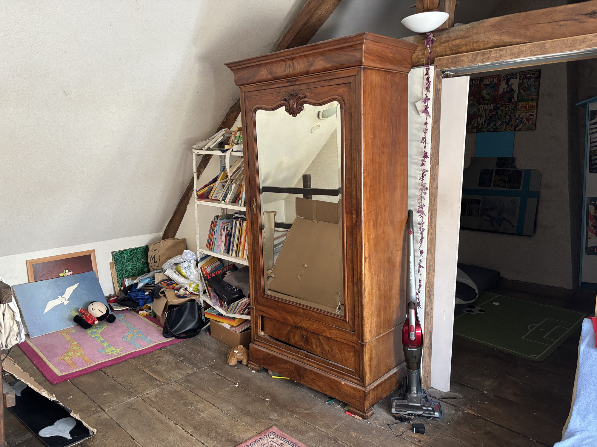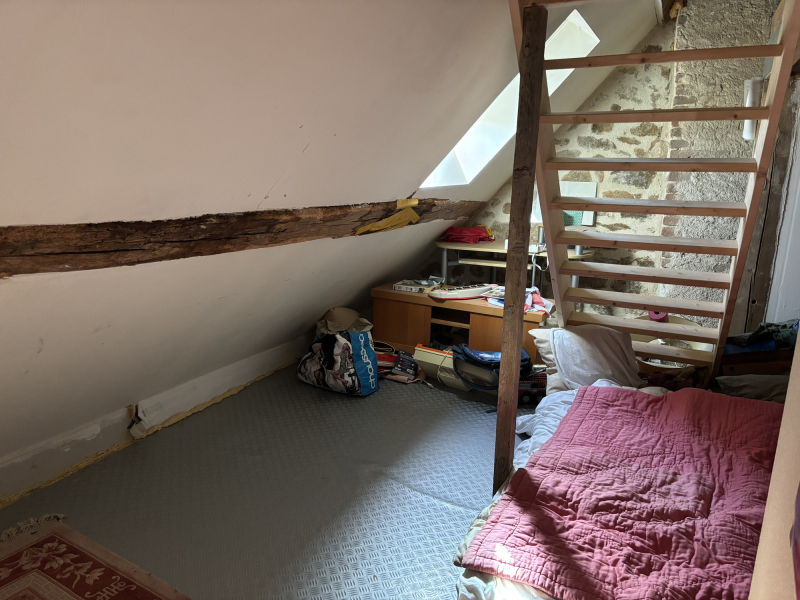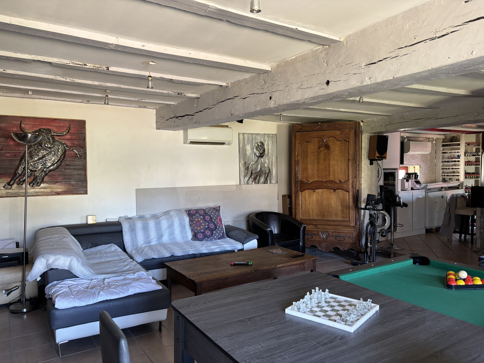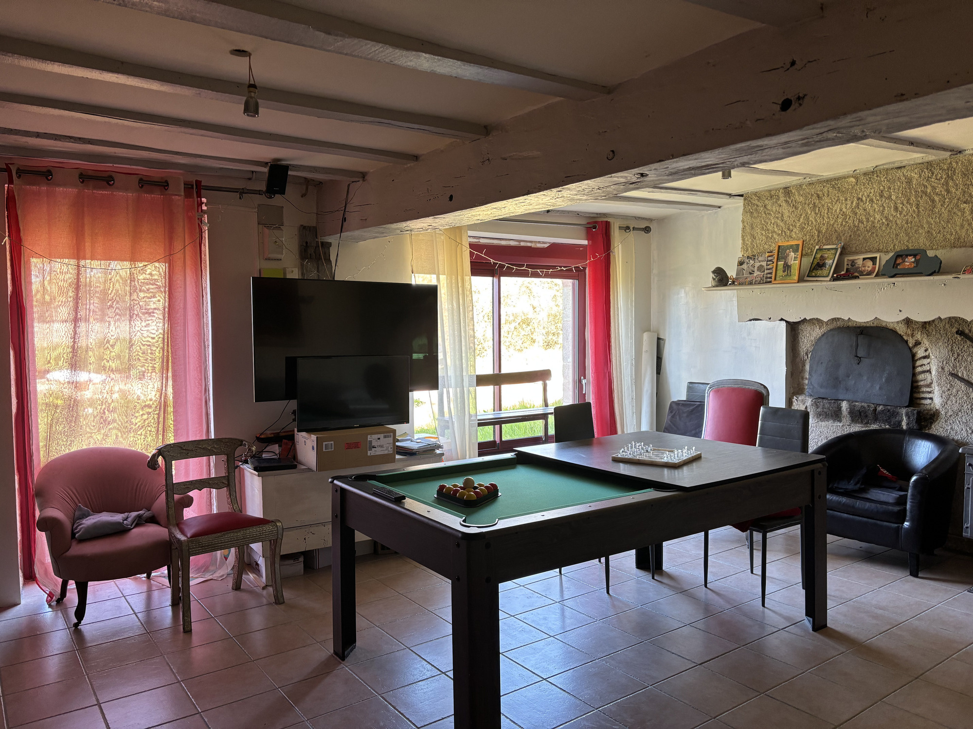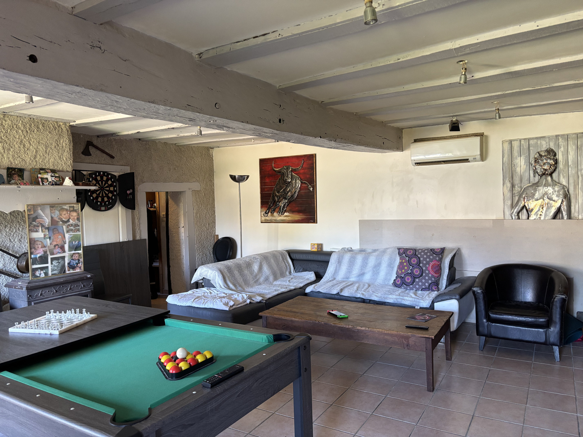 Sur la droite, un passage ouvert avec quelques marches mène à une pièce spacieuse, actuellement utilisée comme salle de jeux, mais qui peut parfaitement servir de chambre supplémentaire.