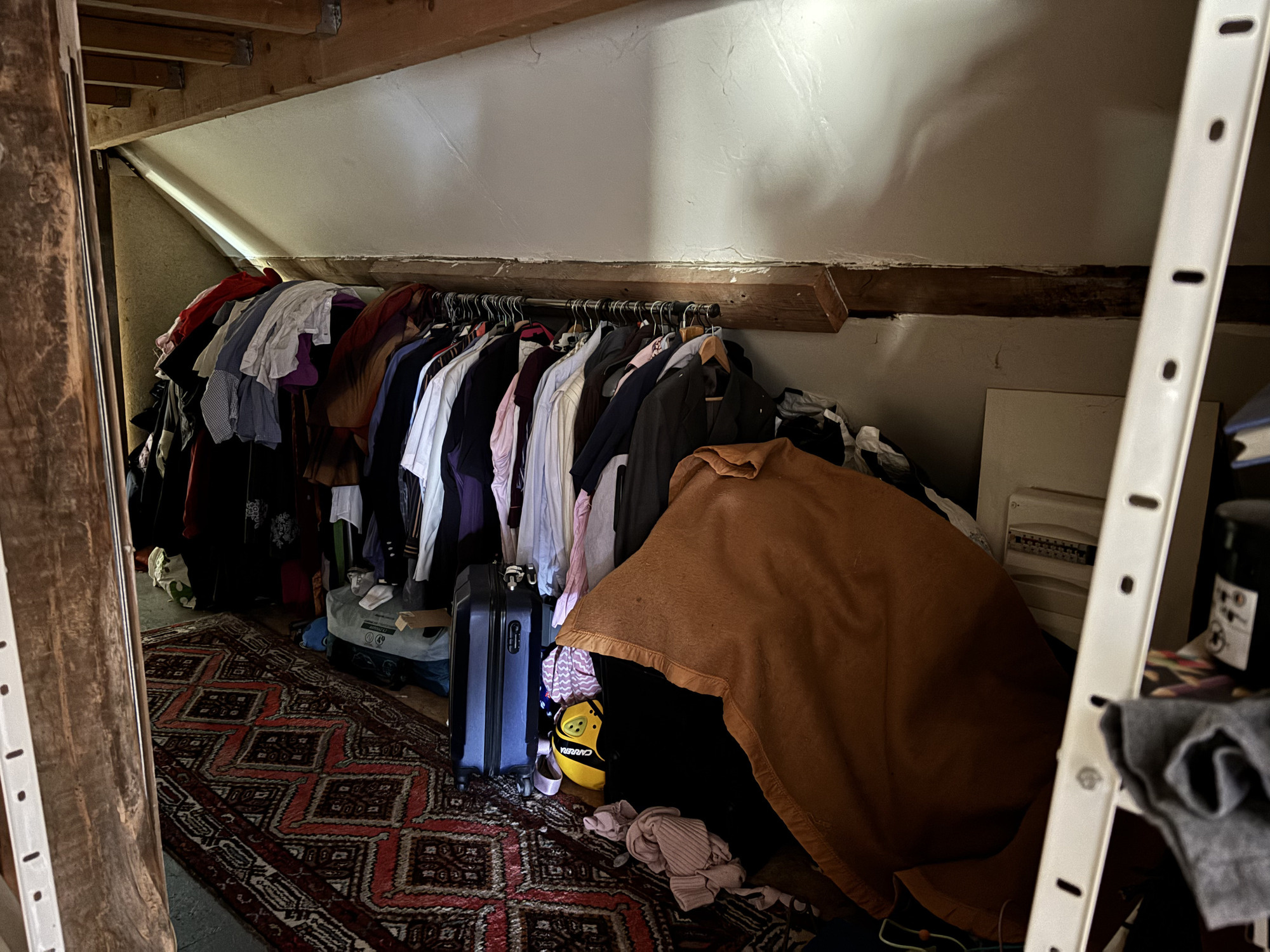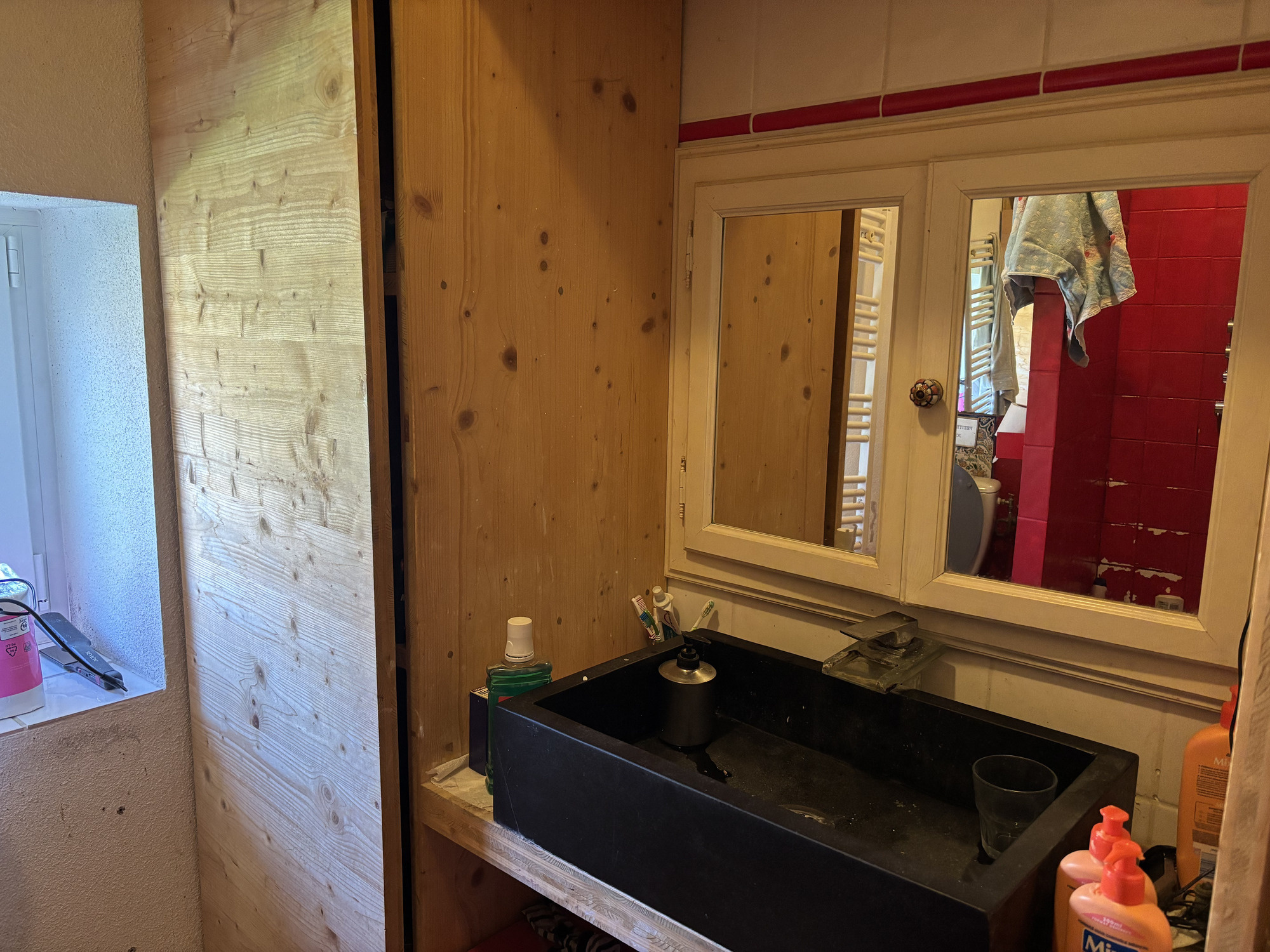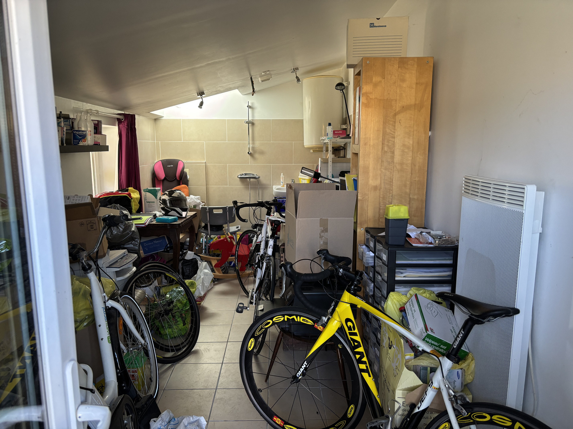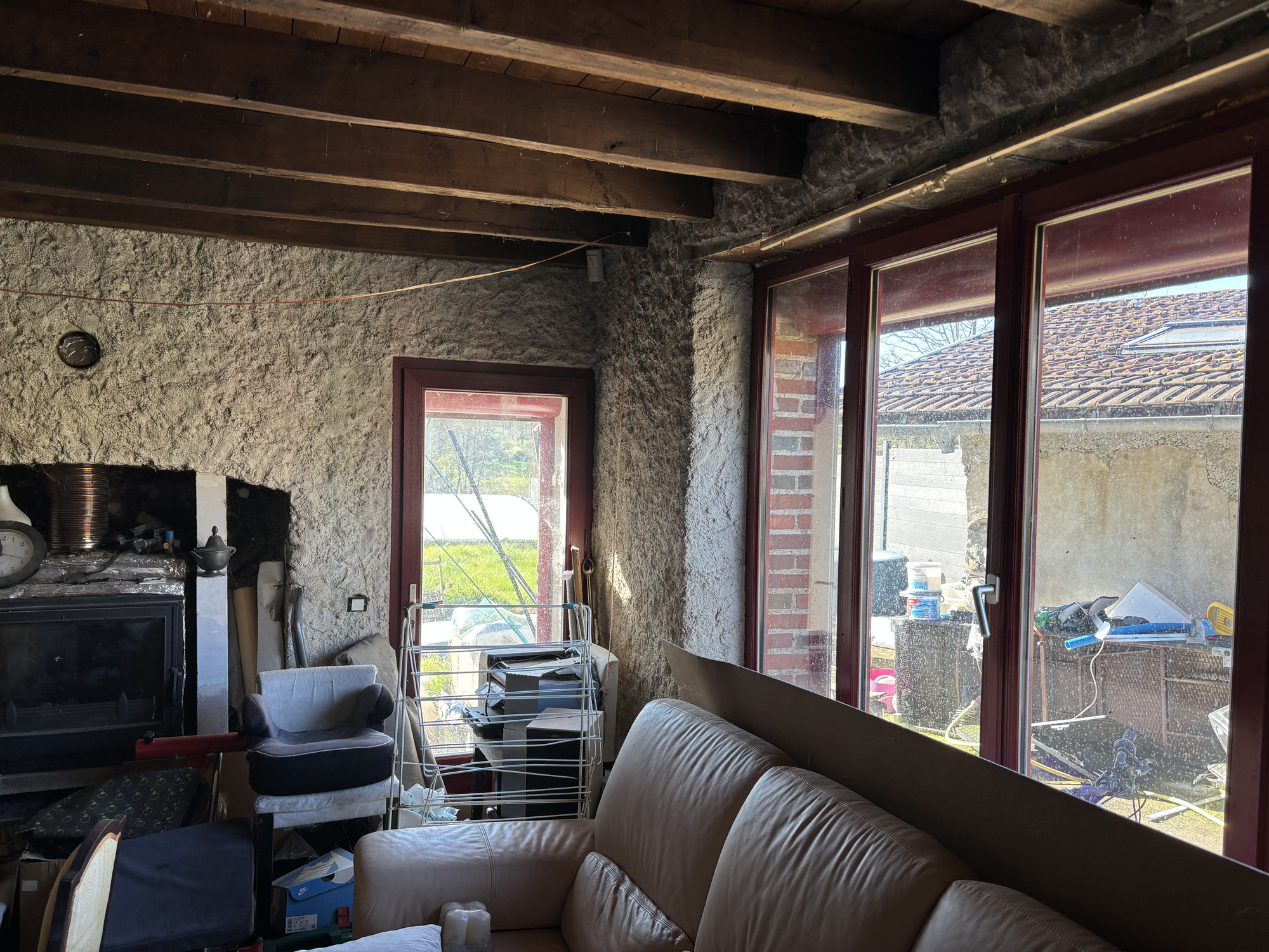 À gauche de la cuisine, une grande ouverture donne accès à l'espace de vie spacieux avec un coin salon et un coin repas. On y trouve un poêle à bois (actuellement inutilisé) et de cette pièce on accède à la salle d’eau avec wc, douche, lavabo et radiateur sèche-serviettes.
