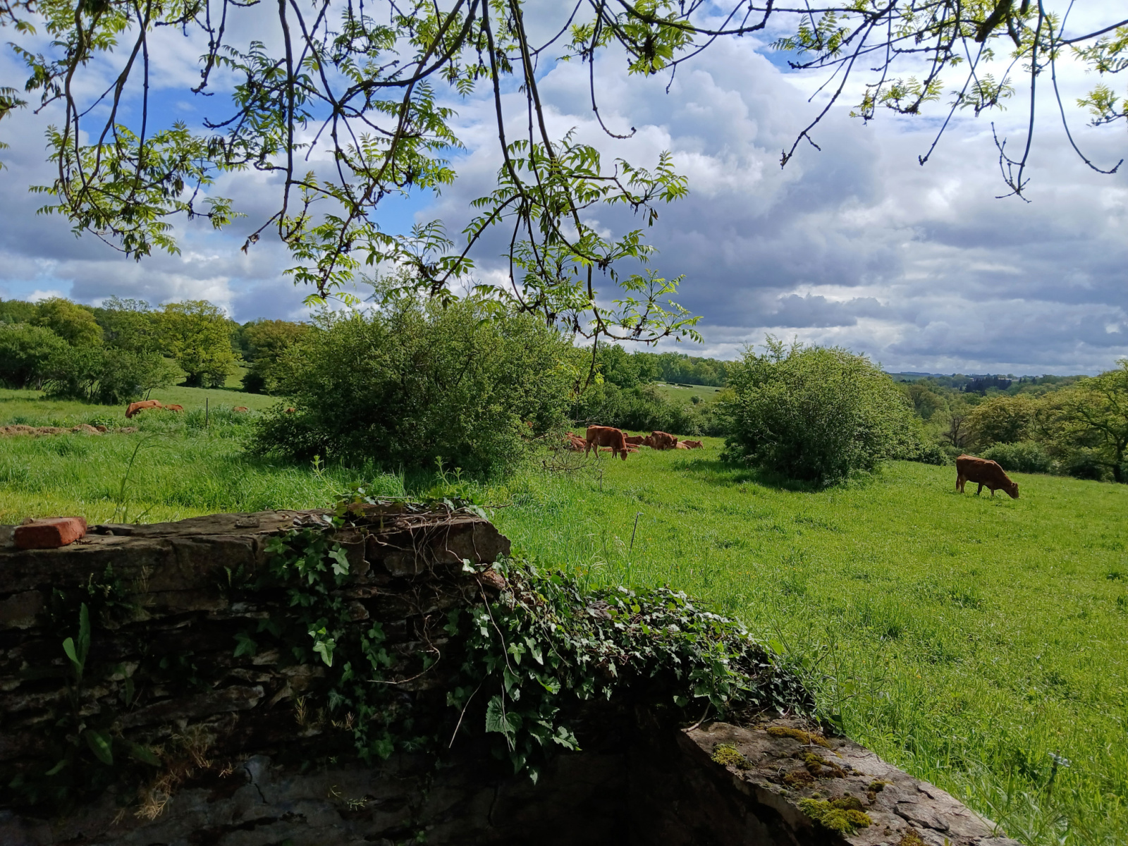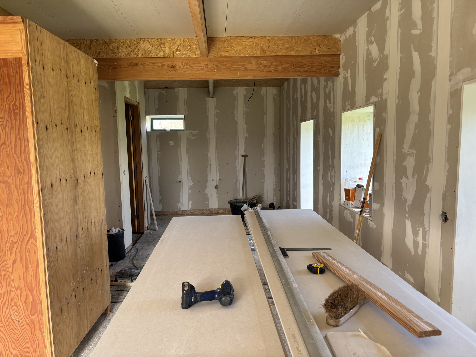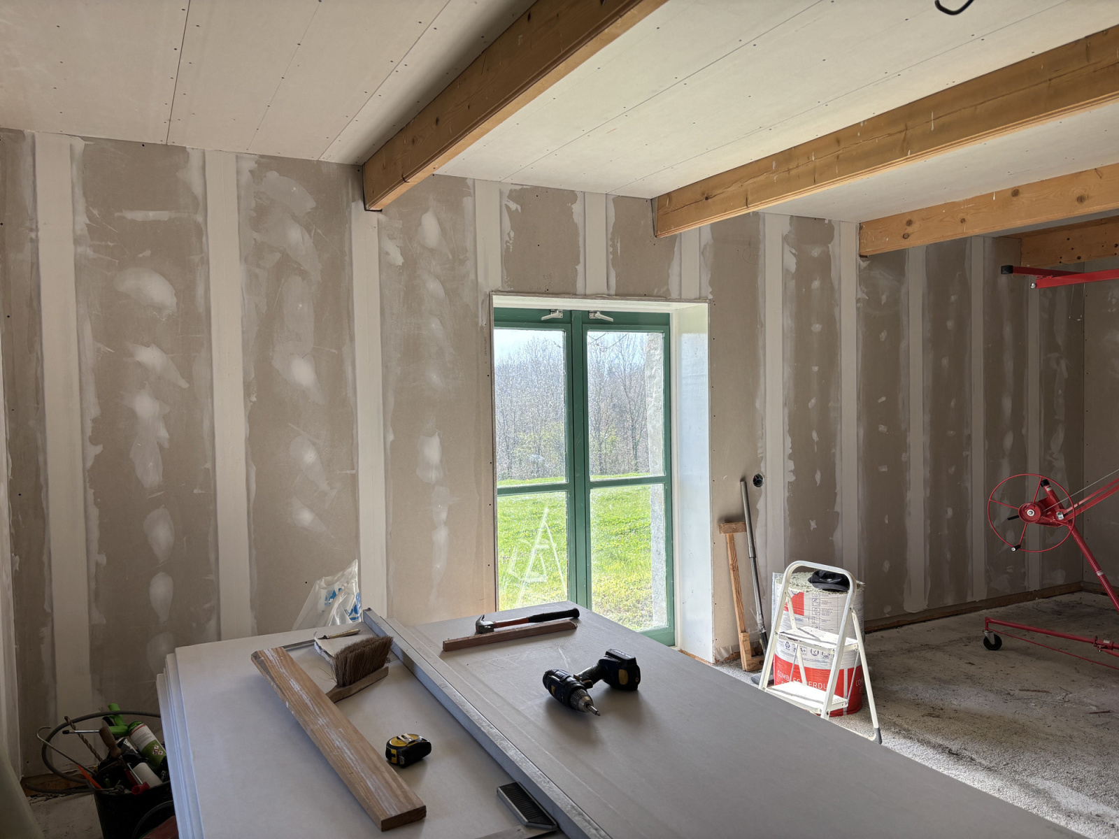 Dans la partie gauche du bâtiment, vous entrez dans une zone encore en cours de rénovation. Vous pénétrez dans un grand espace de vie lumineux offrant les mêmes belles vues sur les champs. L'espace ouvert se compose d'une cuisine, d'un coin repas et d'un espace salon. Ici, tout est en double vitrage et les murs sont isolés.