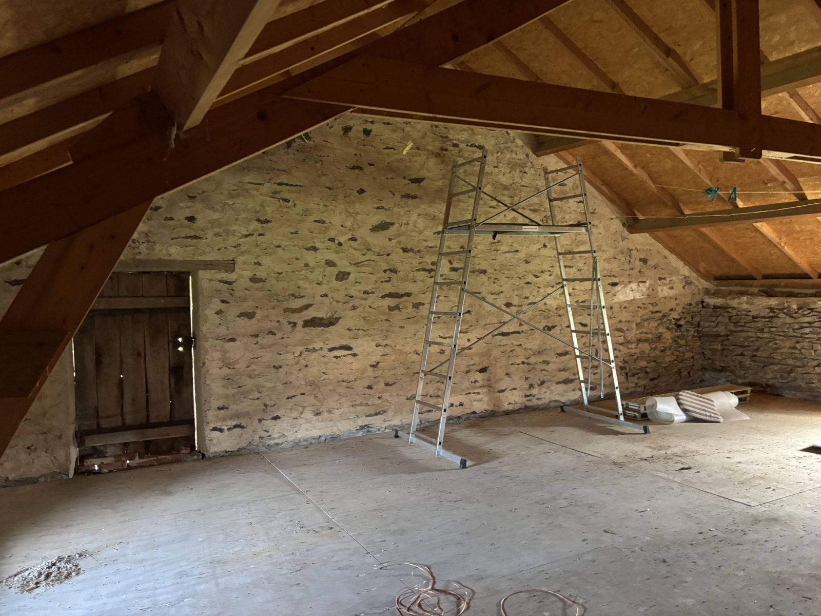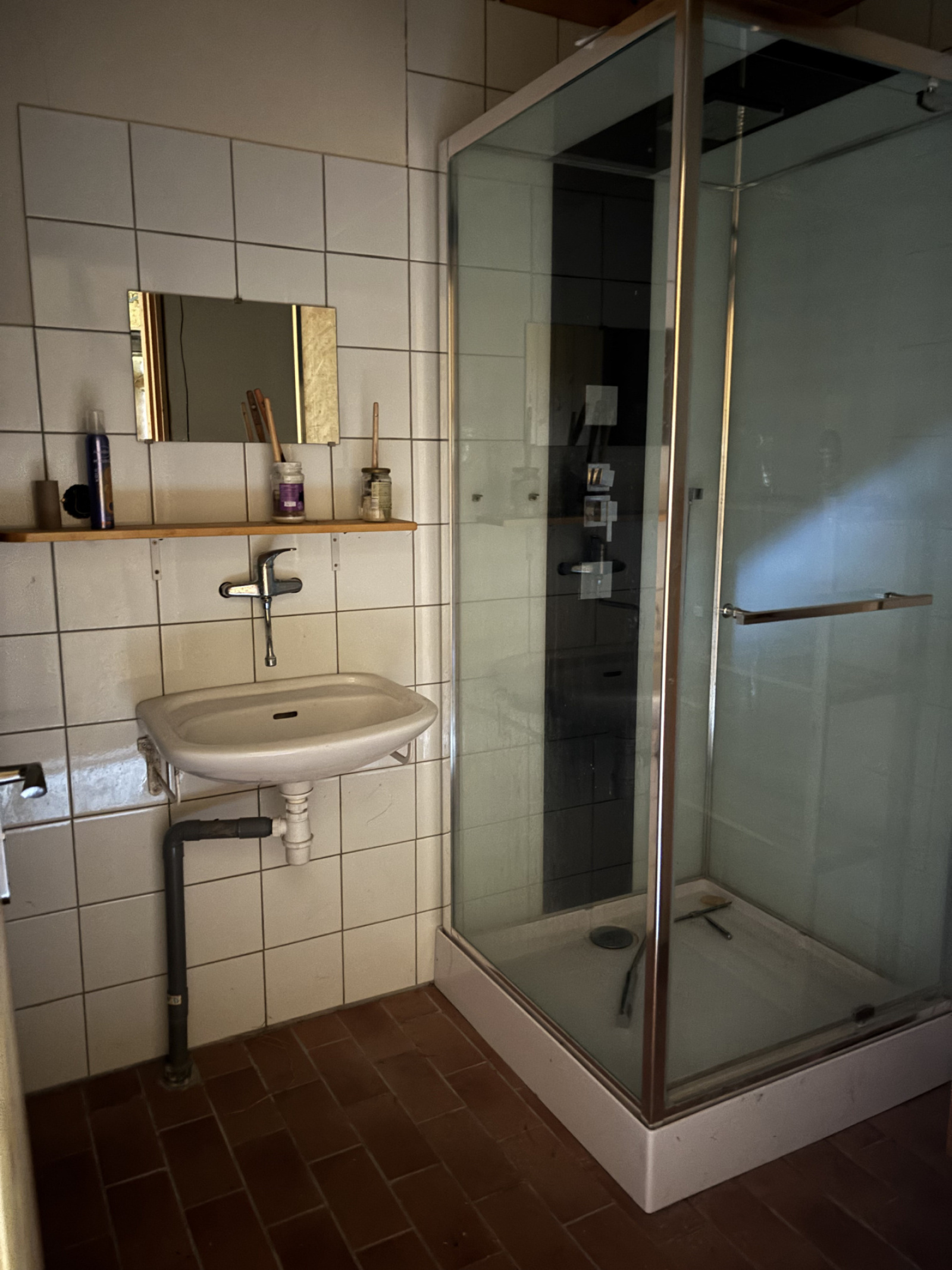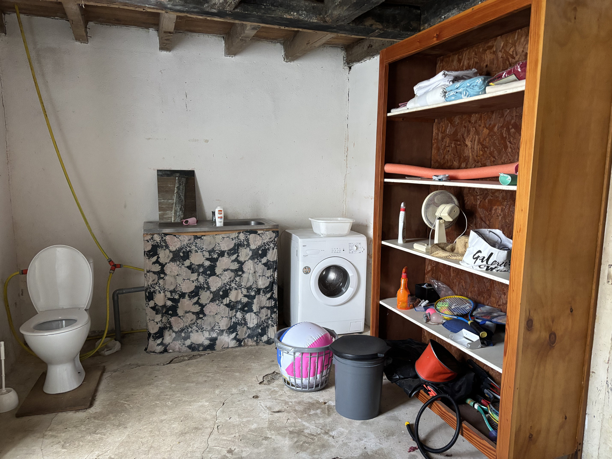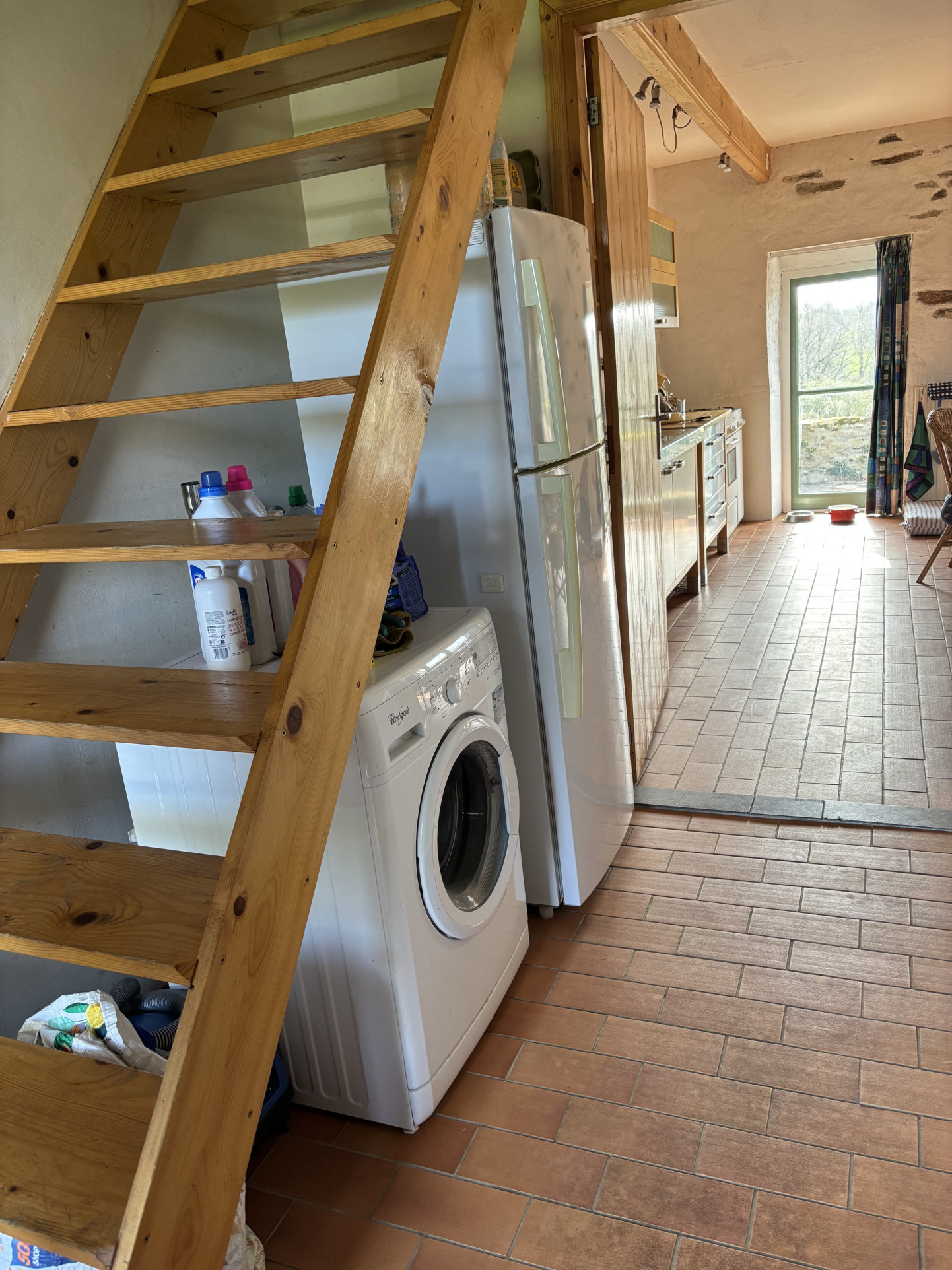 Une porte mène à un hall avec branchement pour la machine à laver, une porte vers la salle d’eau avec douche, toilettes et lavabo, et un endroit où un escalier mènera à l'étage supérieur. L'étage supérieur n'a pas encore été rénové, mais il offre beaucoup d'espace pour créer plusieurs chambres.