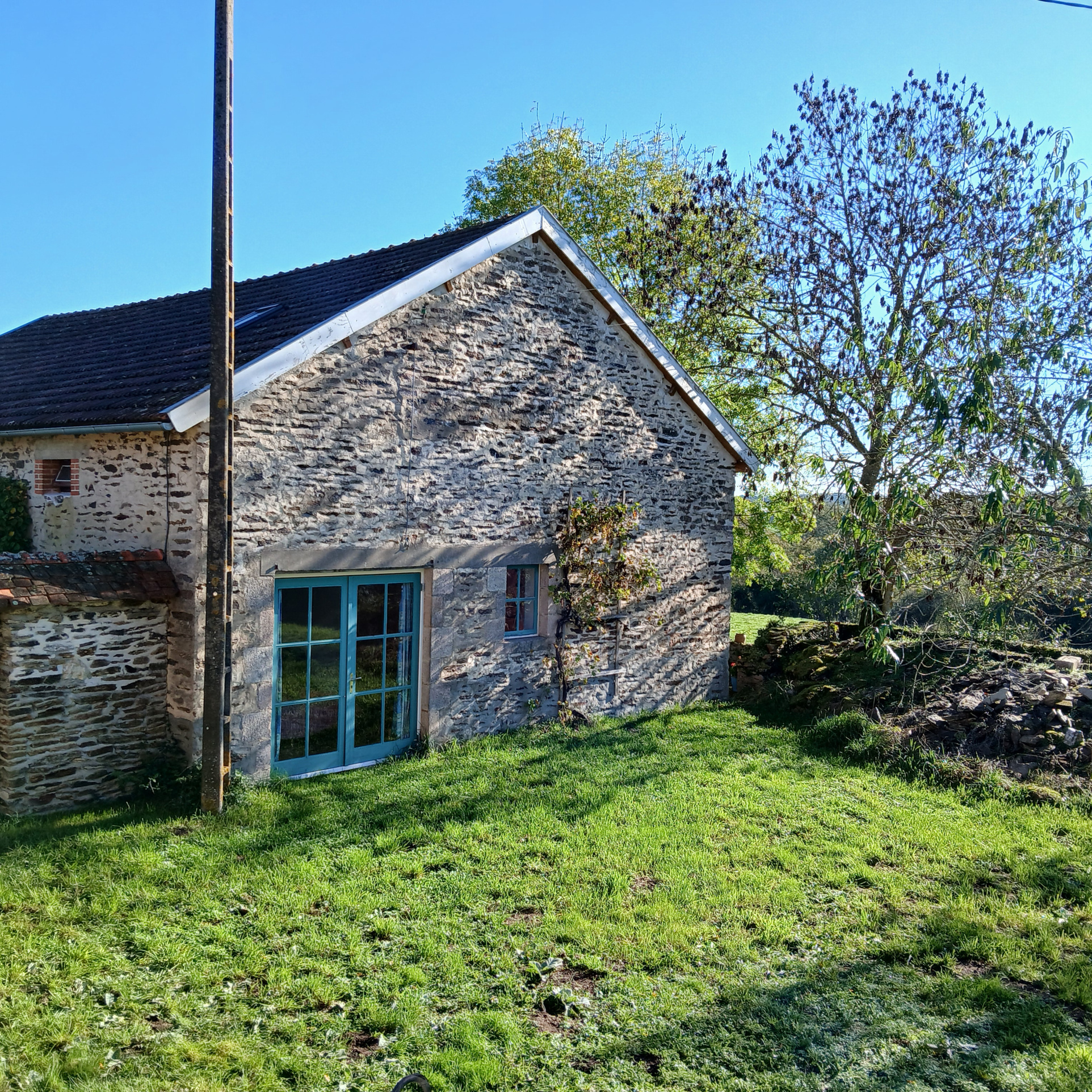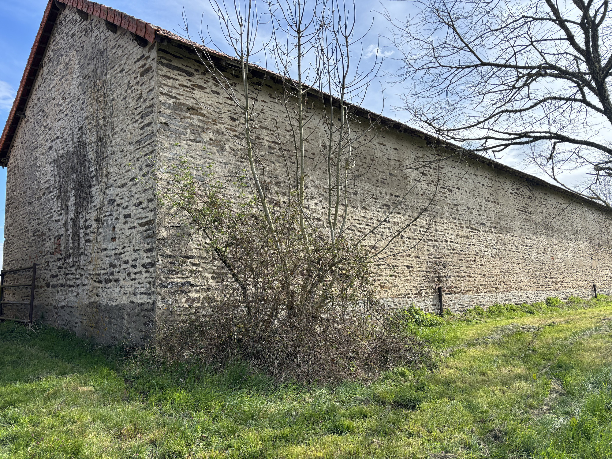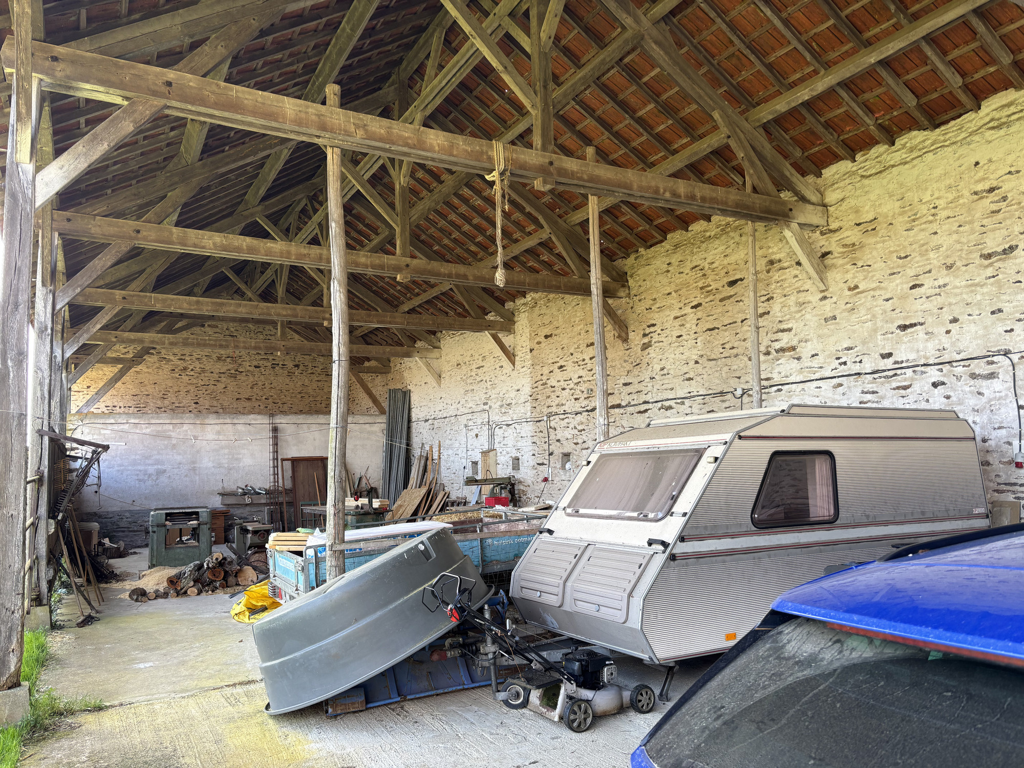 Depuis cette cour, un portail mène à une autre partie de la propriété où se trouve un grand hangar en pierre naturelle avec un sol en béton. Il y a de l'électricité et l'espace est utilisé comme atelier et pour les réunions d'été avec la famille et les amis.