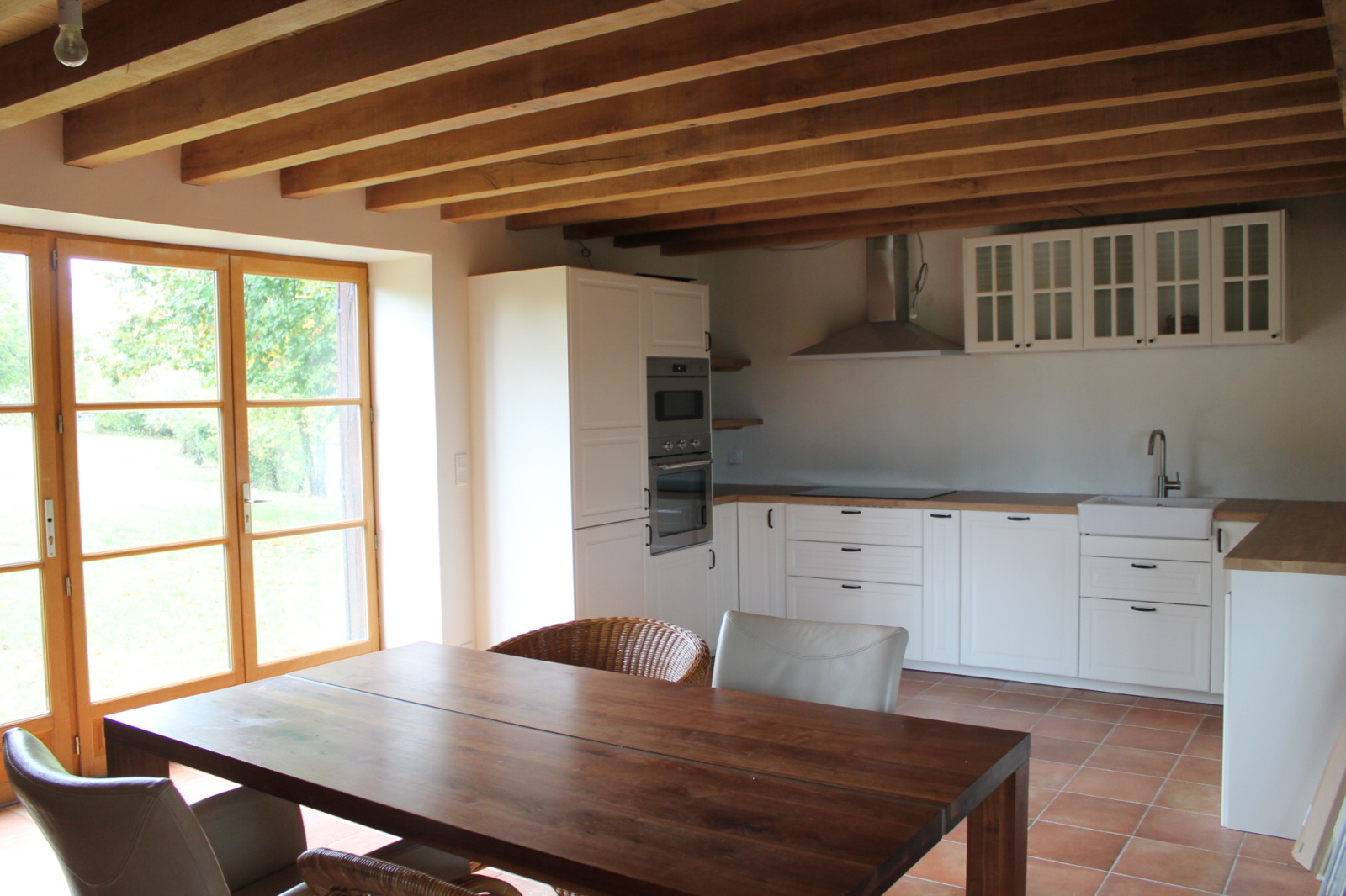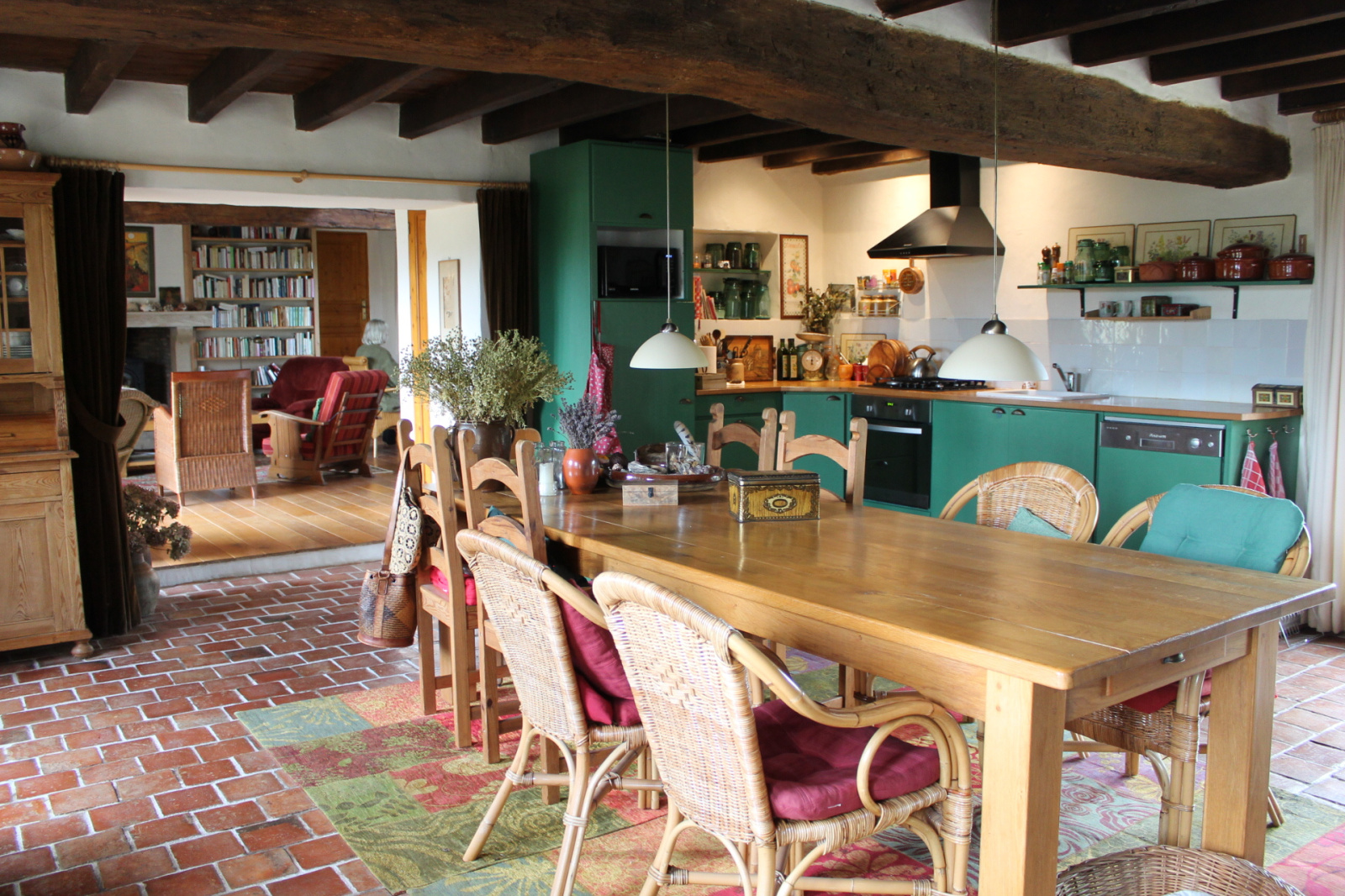 Par une marche, vous entrez dans la grande cuisine équipée, ouverte avec une grande table à manger, un sol en tomettes authentiques et des portes-fenêtres donnant sur la terrasse derrière la maison.