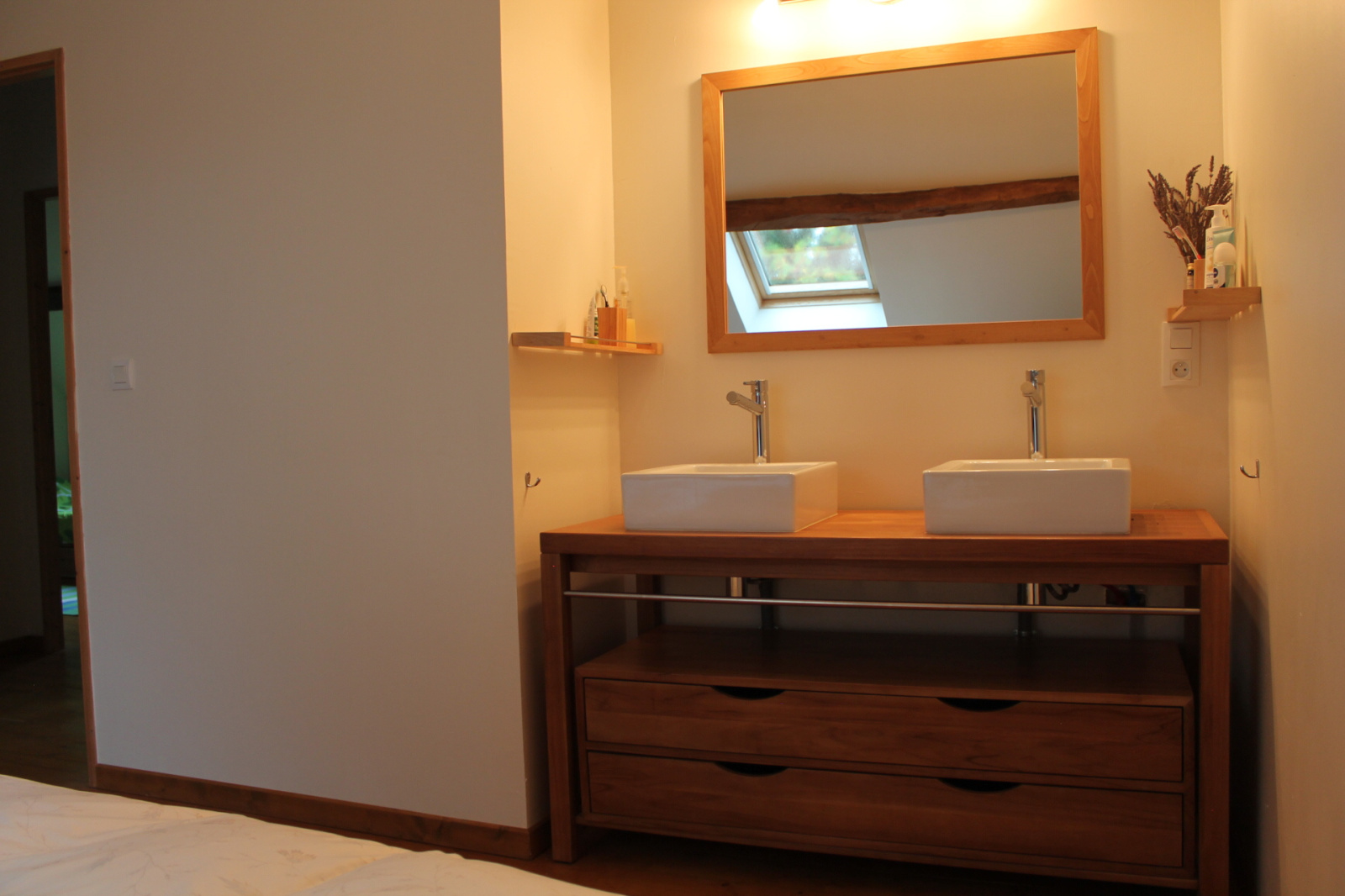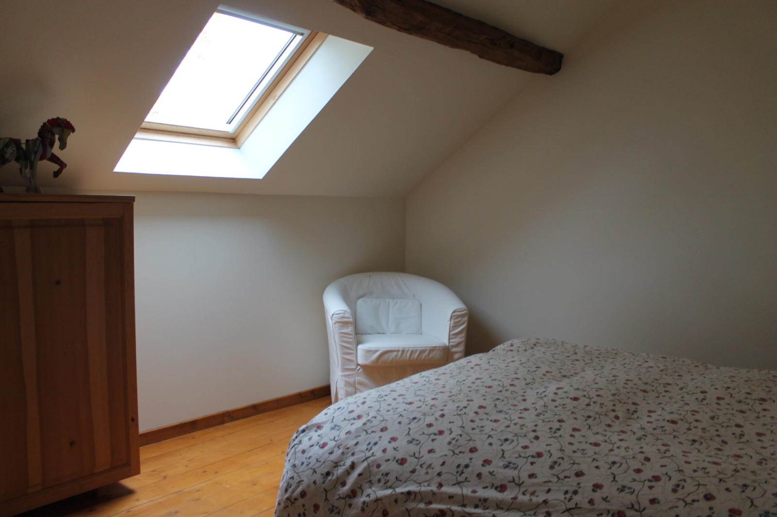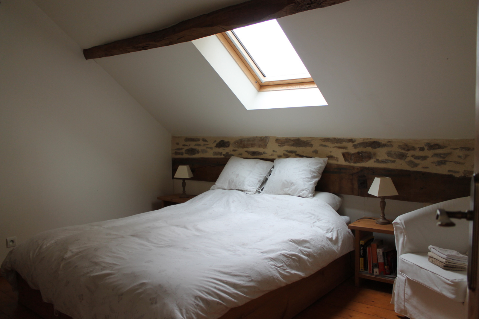 Une chambre principale avec double lavabos et une lucarne et deux autres chambres spacieuses.
