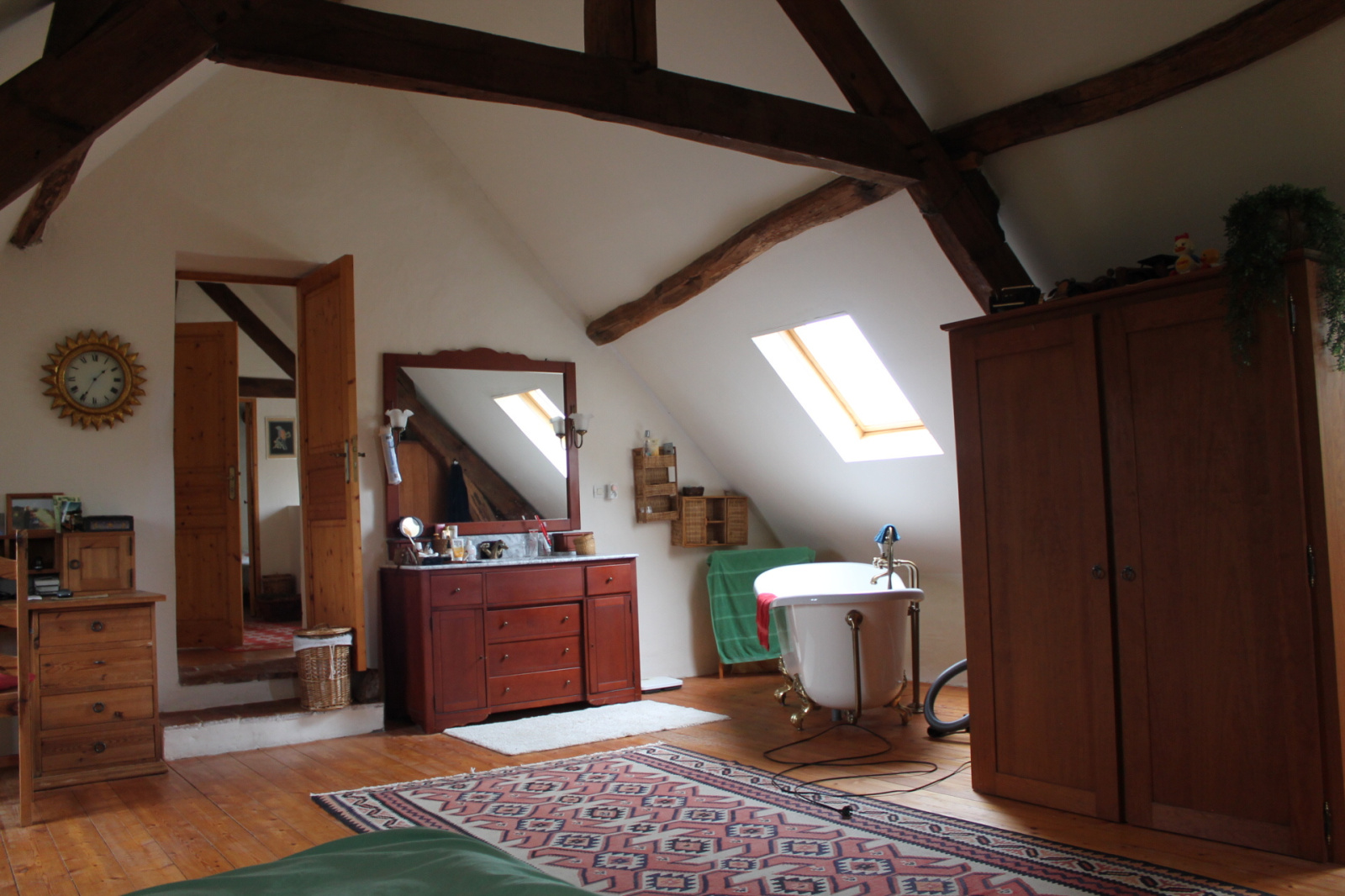 À l'étage supérieur, auquel on accède par un escalier en bois, se trouve une salle de bains spacieuse avec baignoire, cabine de douche et toilettes.