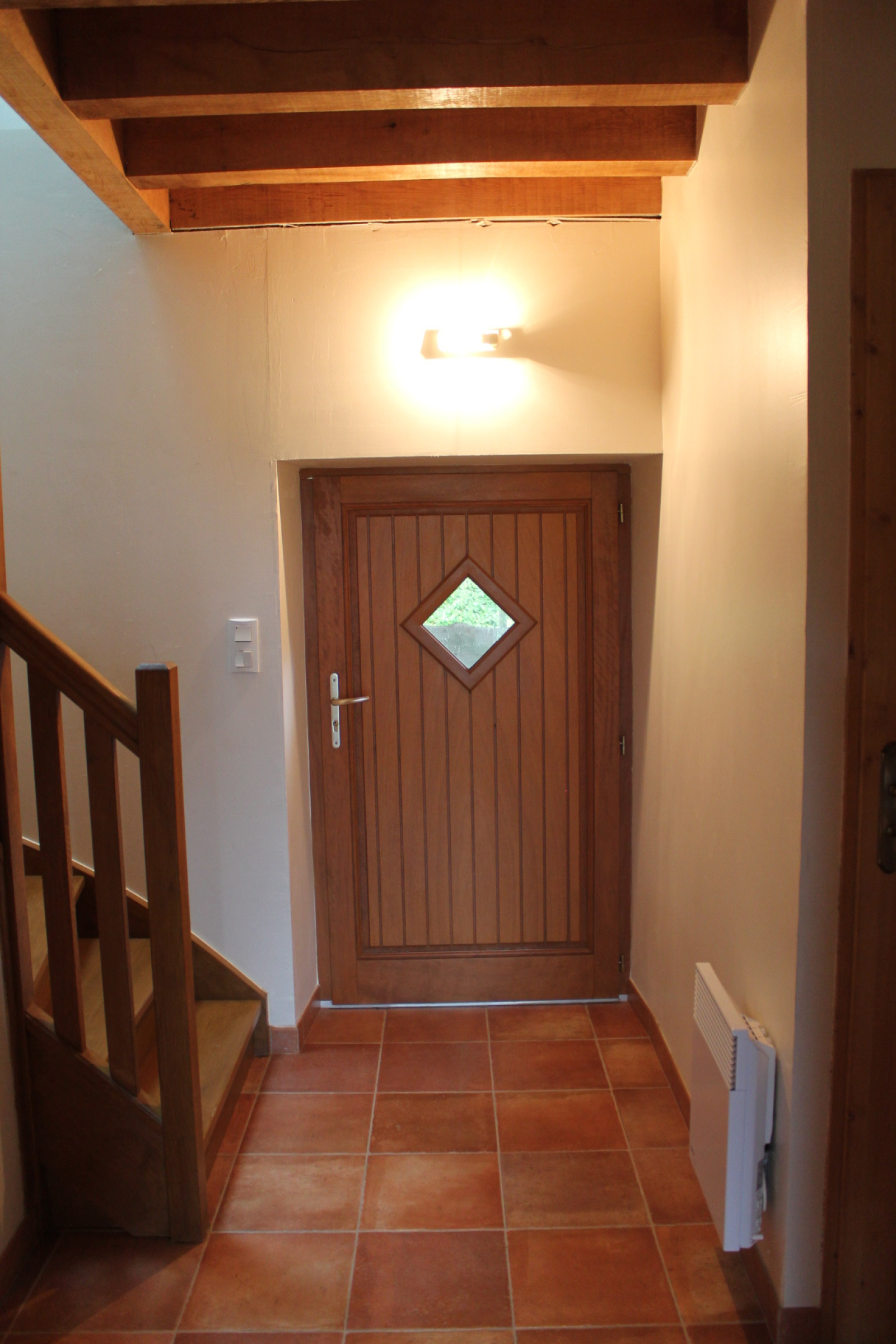 Le passage ouvert vous mène au salon confortable avec un plancher en chêne et un escalier en pierre menant à l'étage supérieur où vous trouverez sur votre gauche une chambre spacieuse avec 2 lucarnes, un lavabo et une baignoire dans la chambre. Sur le palier une salle l’eau avec un authentique sol en tomettes, des toilettes séparées et une deuxième chambre avec un lavabo. Tout l'étage supérieur est recouvert d'un plancher en bois.