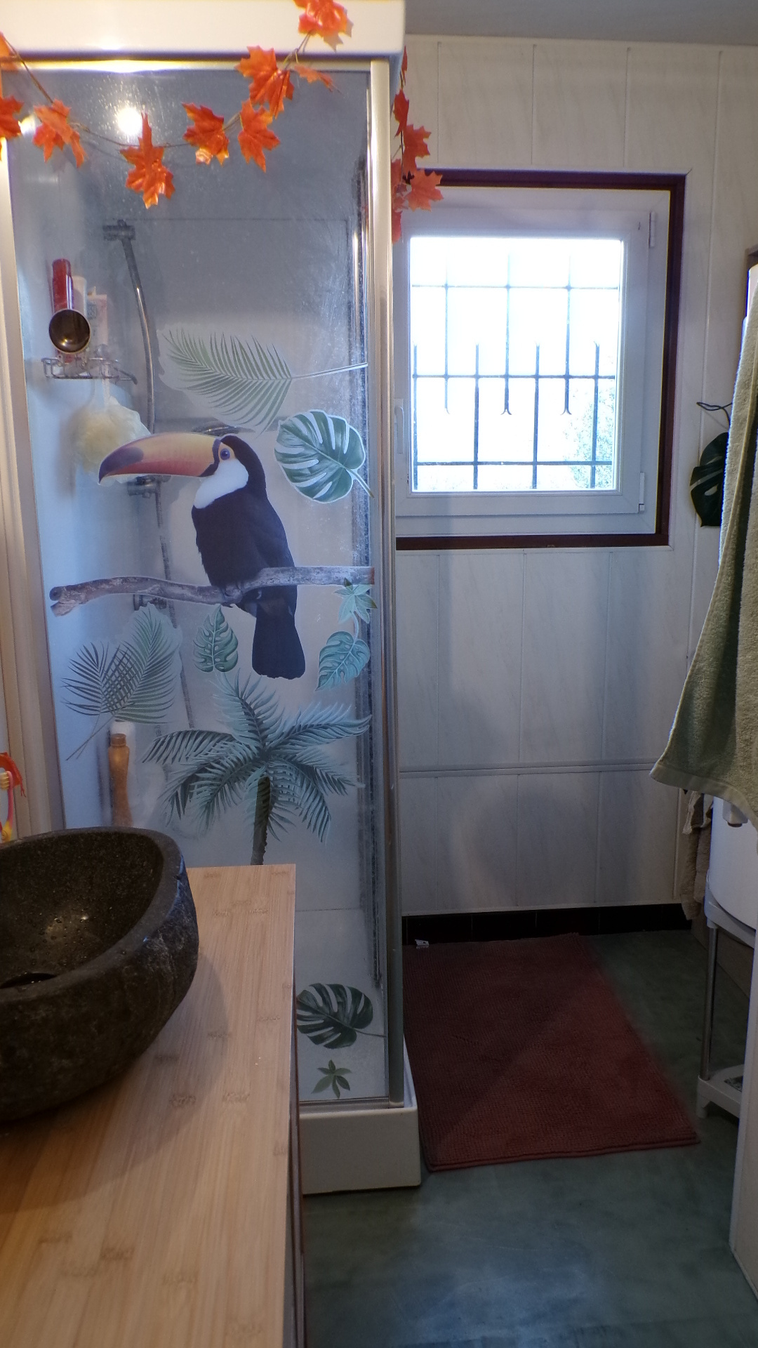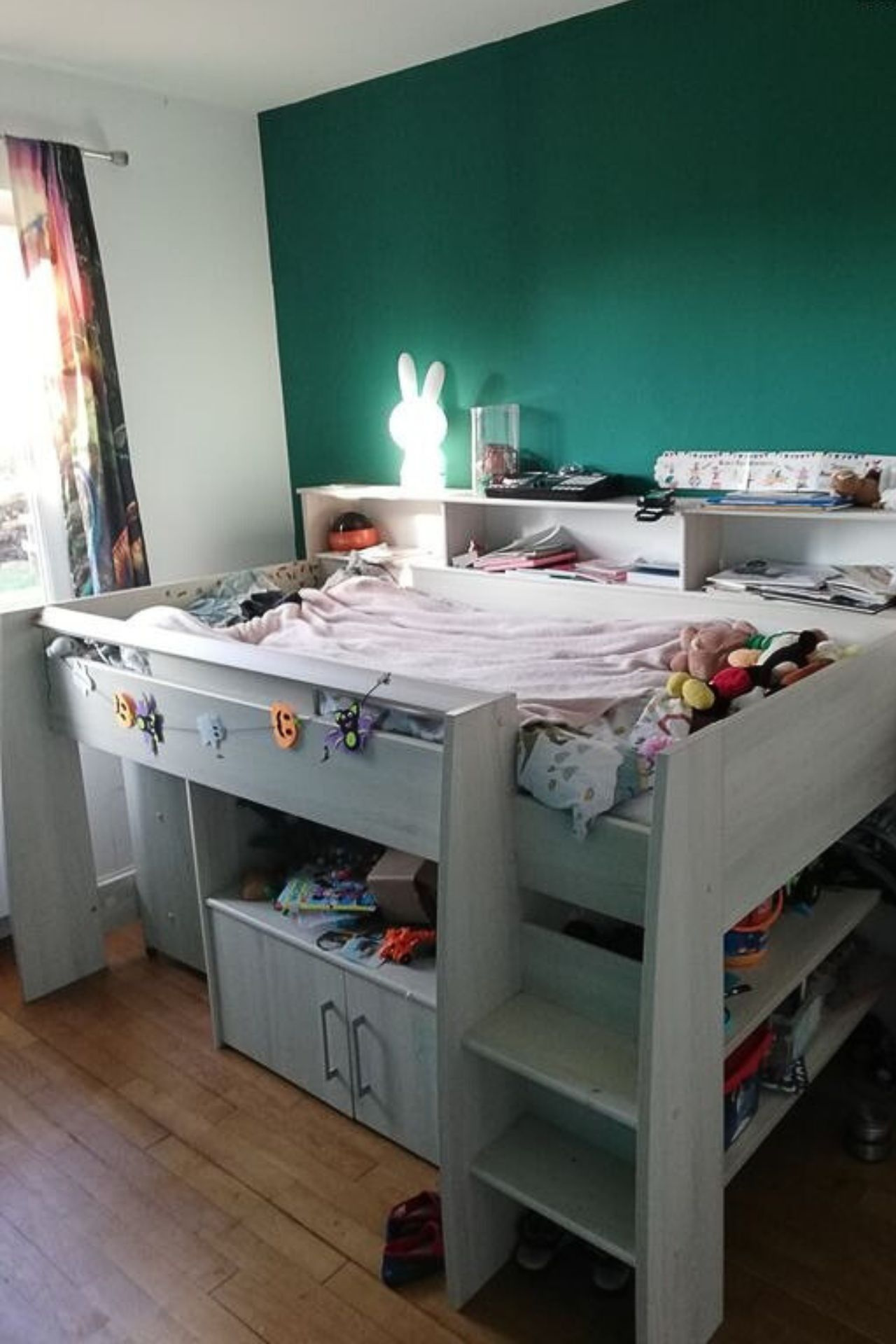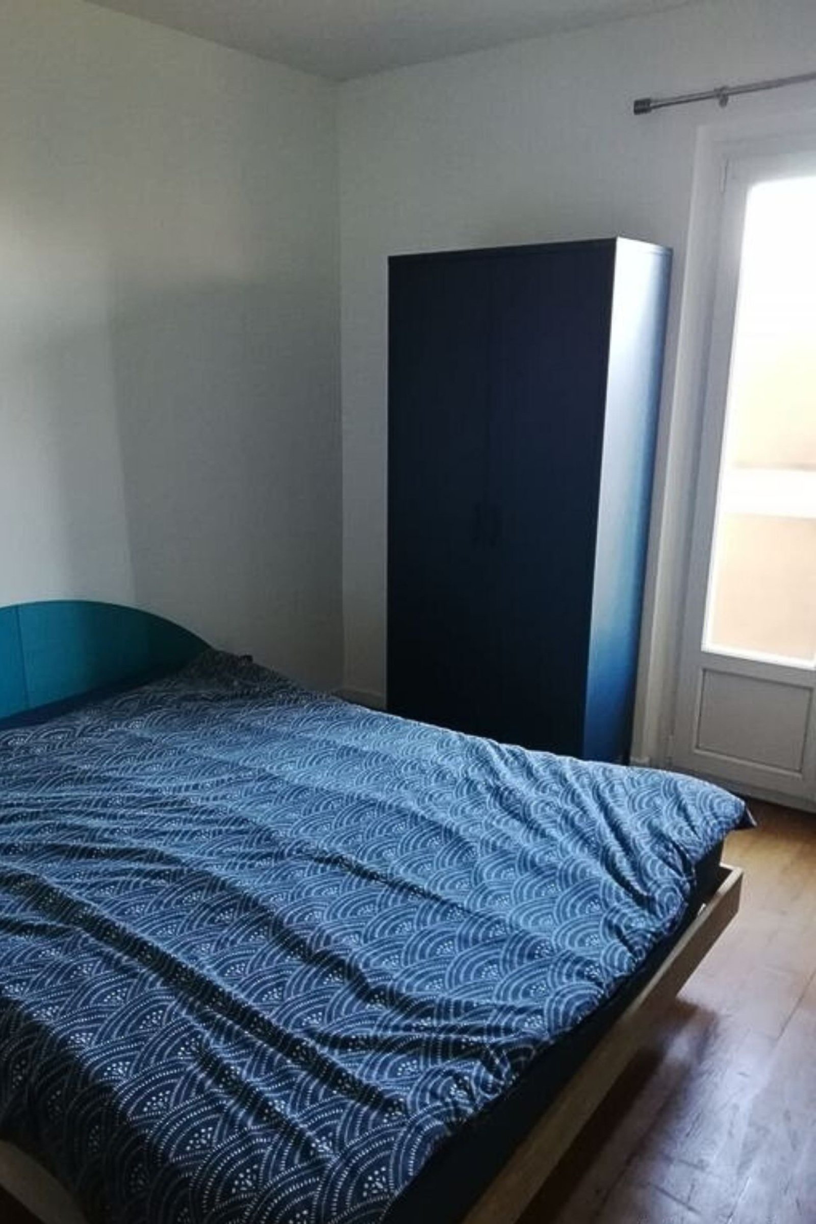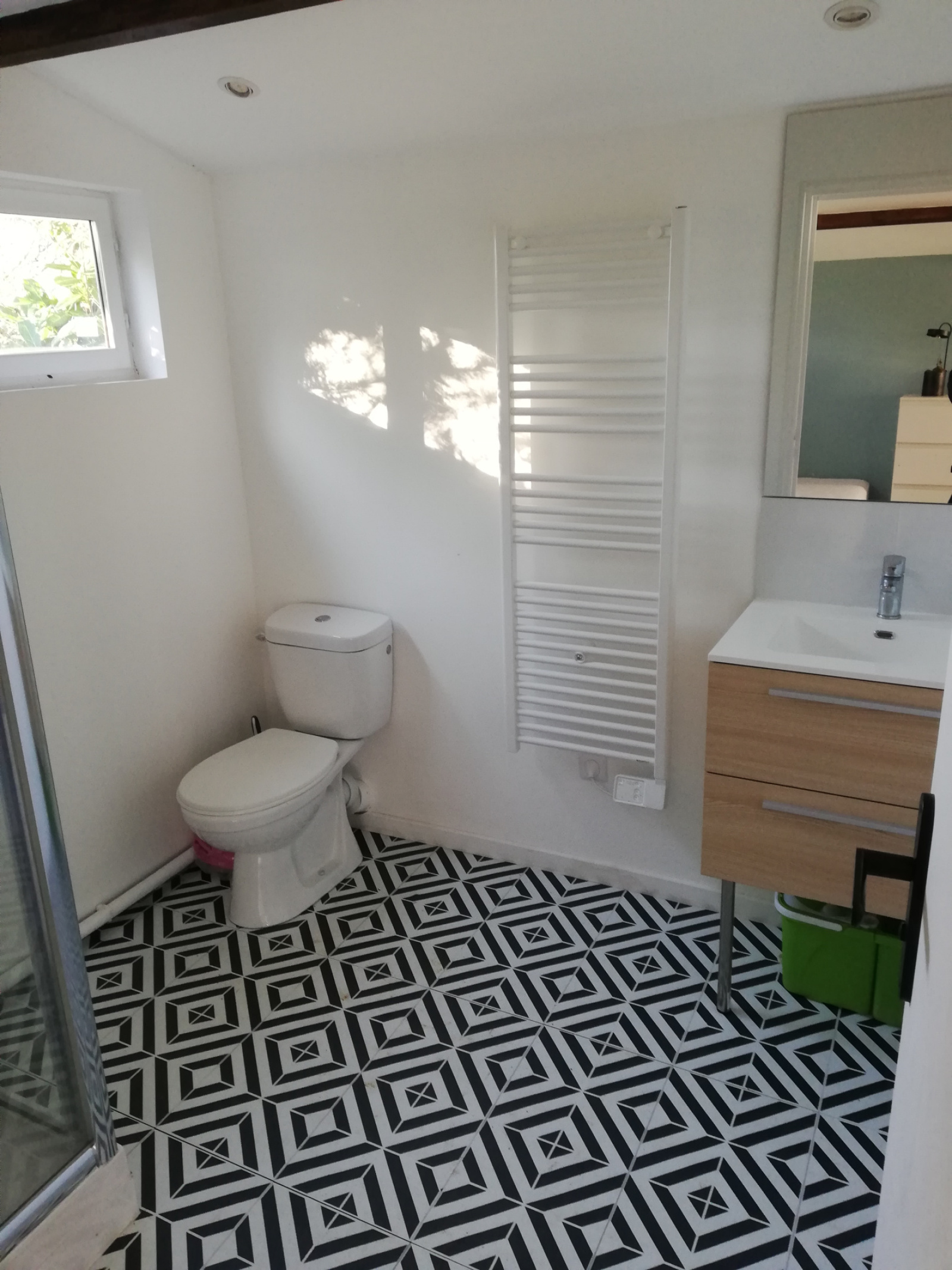 Un couloir dessert ensuite les autres pièces. Sur la droite, on trouve un placard de rangement, des toilettes séparées et une salle d’eau avec lavabo, cabine de douche, sèche-serviettes et branchement pour une machine à laver. Le ballon d’eau chaude y est également installé. Plus loin, une première chambre avec placards intégrés et radiateur électrique.