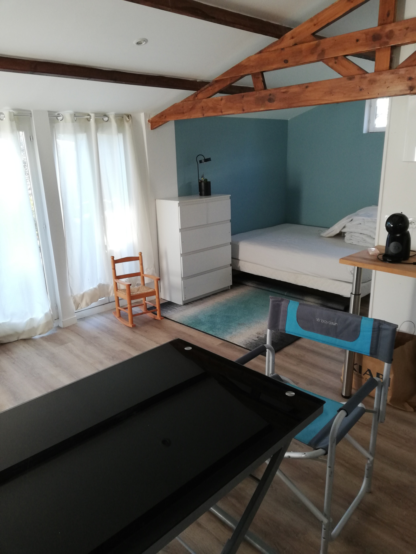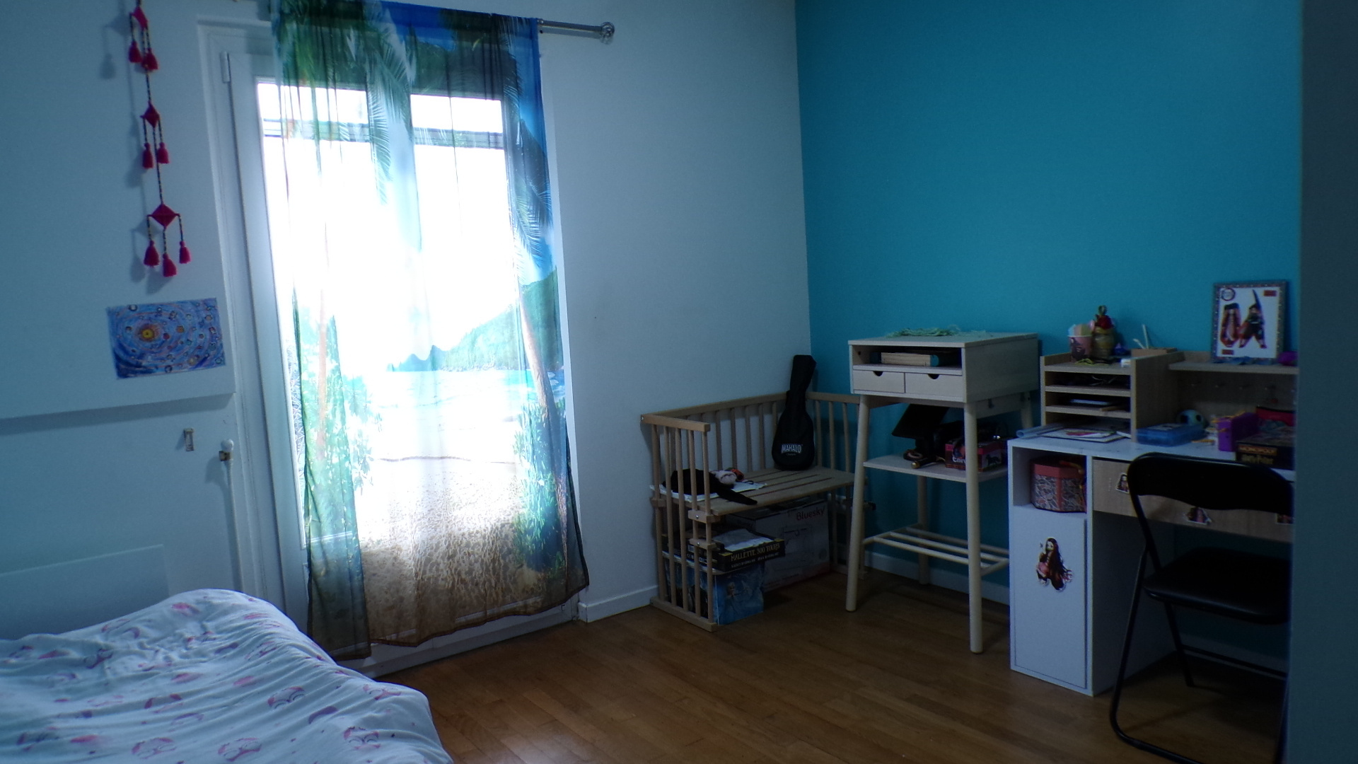 Sur la gauche du couloir, une deuxième chambre avec radiateur électrique et portes-fenêtres, ainsi qu’une troisième chambre, également avec portes-fenêtres et radiateur électrique. Les trois chambres disposent d’un magnifique parquet ancien en chêne.