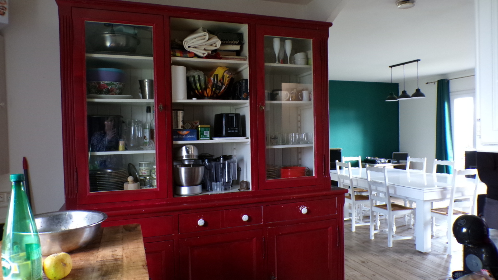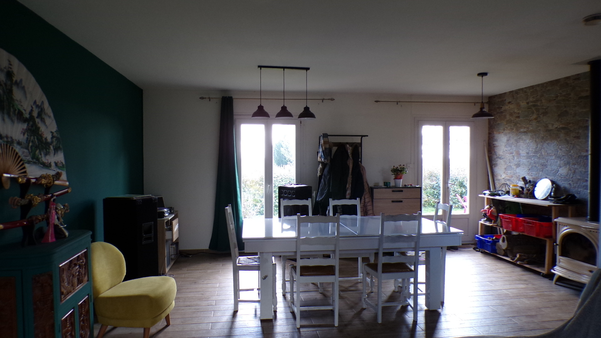 Quelques marches mènent à la porte d’entrée, qui s’ouvre sur un vaste séjour en forme de L. Celui-ci comprend un coin salon, un espace repas avec poêle à bois et bénéficie d’une belle luminosité grâce aux fenêtres et portes-fenêtres des deux côtés. Le sol est recouvert de carrelage imitation parquet.