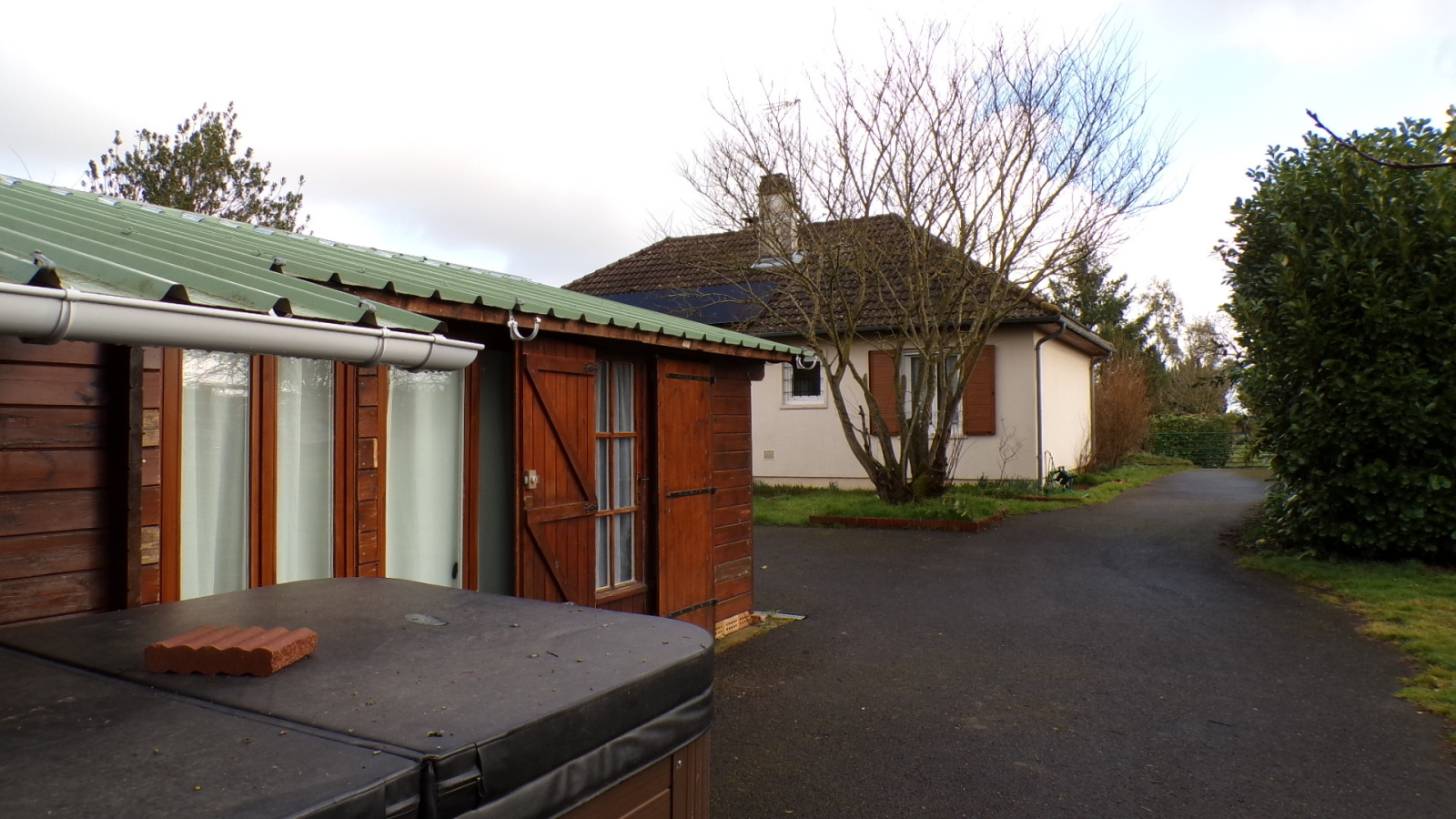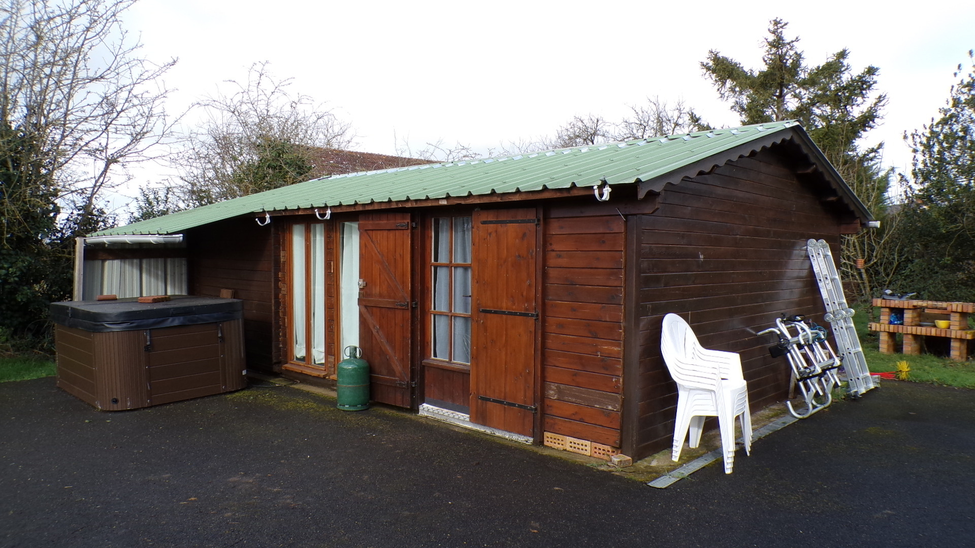 Dans le jardin, un chemin goudronné mène à l’arrière de la maison, où se trouve un charmant chalet en bois d’environ 32 m², entièrement rénové. L’entrée se fait dans une lumineuse pièce de vie comprenant une cuisine ouverte et un coin repas, un salon et un espace nuit. Le chalet est chauffé par des radiateurs électriques et dispose d’une salle d’eau avec lavabo, cabine de douche, toilettes et sèche-serviettes. Un placard à l’entrée et un branchement pour une machine à laver sont également présents. Toutes les fenêtres sont en double vitrage, à l’exception des portes-fenêtres. Idéal pour accueillir famille et amis ou pour générer un revenu locatif.
