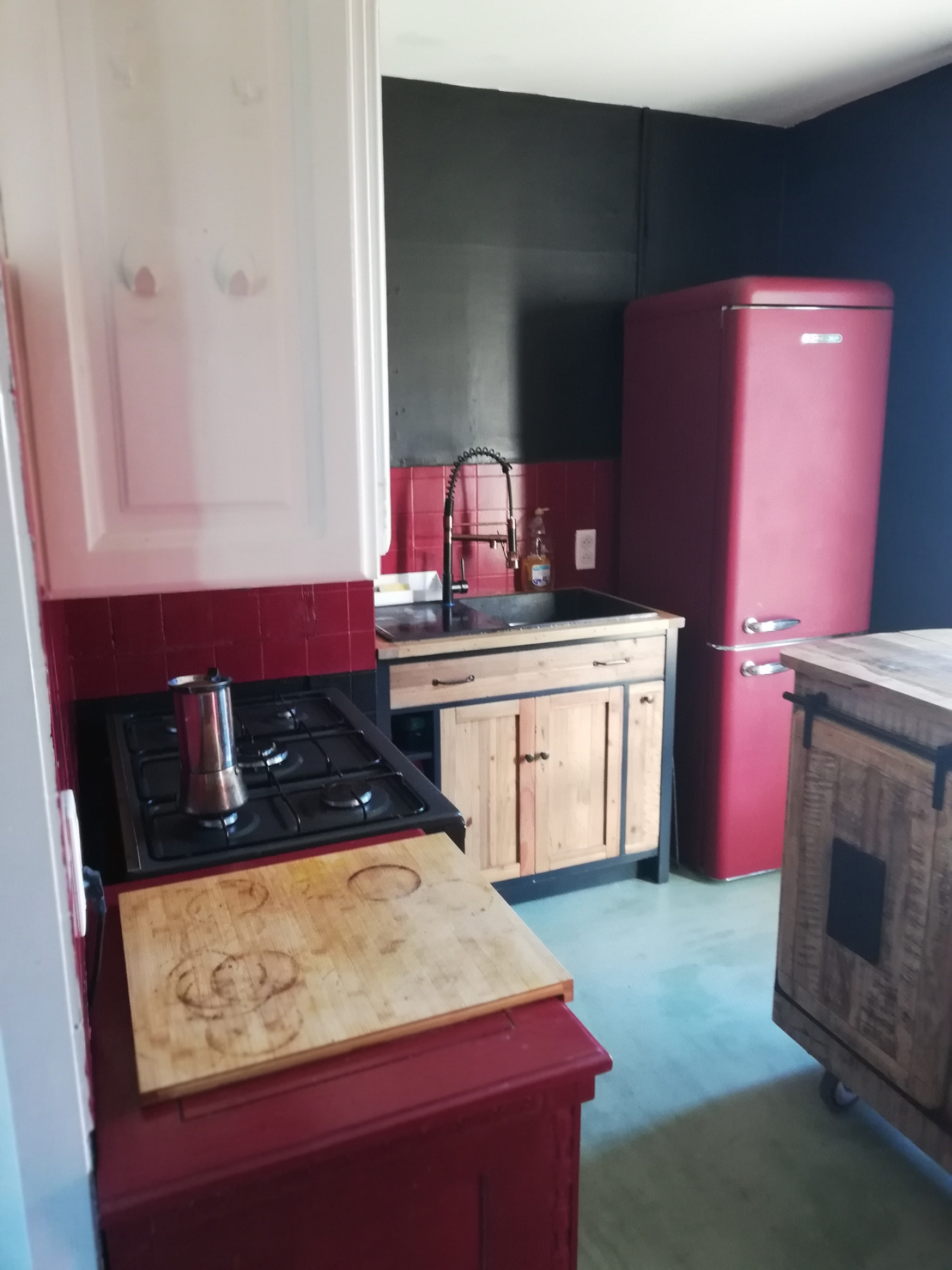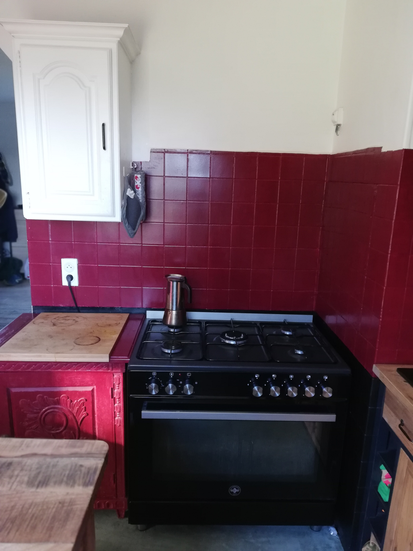 Depuis cette pièce, une grande ouverture mène à la cuisine, équipée de plaques de cuisson à gaz, d’un four électrique et d’une porte donnant accès à l’arrière de la maison.