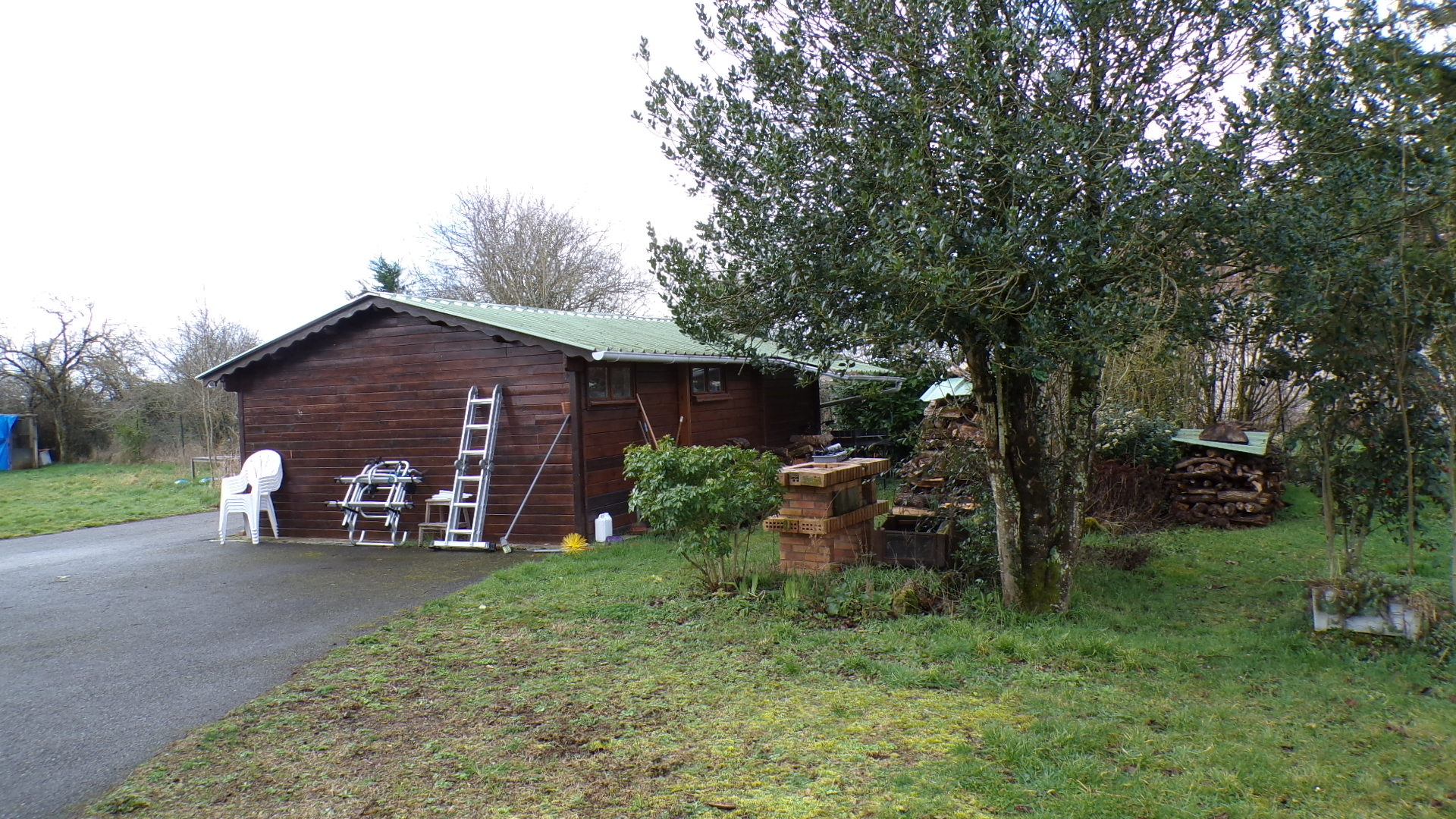 À gauche de la maison se trouve un vaste espace arboré, avec une espace de stationnement bétonné pouvant accueillir un véhicule de grande taille, comme un camping-car.