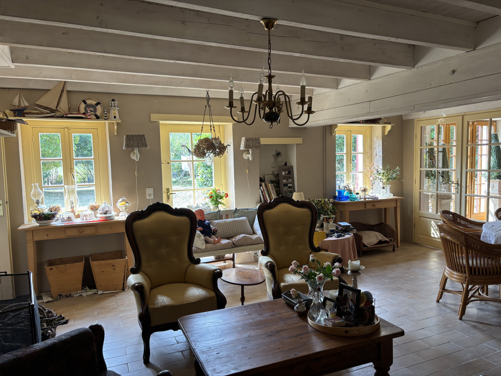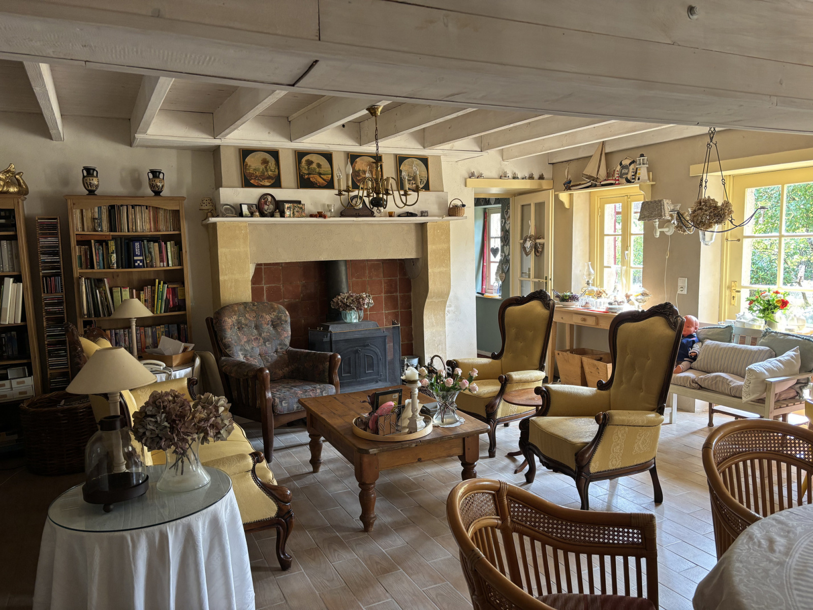 À gauche de l'entrée se trouve un passage vers le salon, divisé en salon et salle à manger, très lumineux, avec un beau carrelage, un plafond avec poutres apparentes et un poêle à bois. Des portes-fenêtres mènent à un couloir qui donne accès à l'extérieur et à une deuxième chambre avec sa propre porte extérieure. Vous y trouverez également des toilettes supplémentaires et une deuxième salle de bains avec double lavabo et une douche spacieuse.