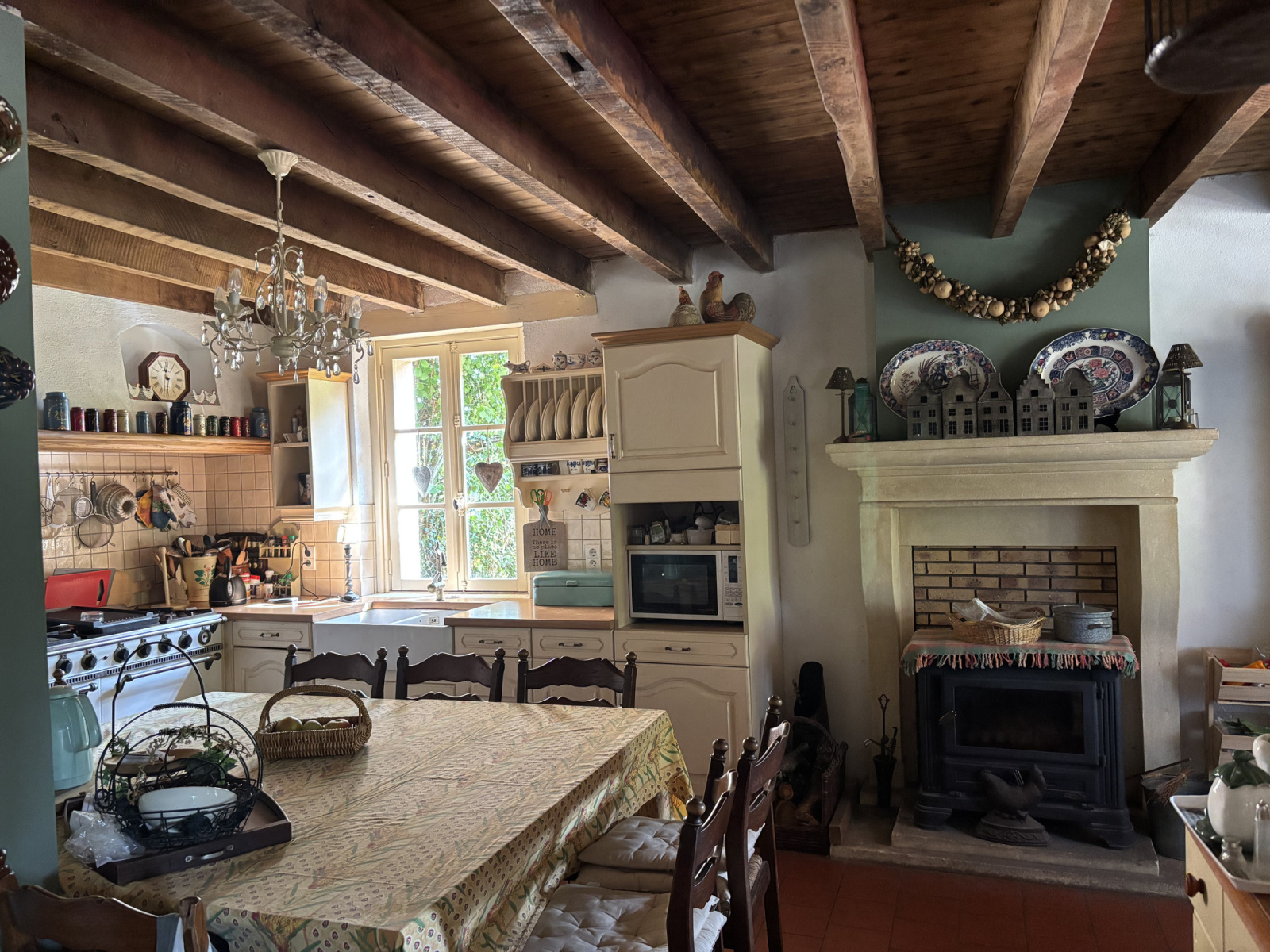 Sur la droite, vous entrez dans la grande cuisine, équipée d'une cuisinière à gaz Godin, d'un poêle à bois, d'un beau carrelage, d'un plafond avec poutres apparentes, d'un escalier menant à l'étage supérieur et d'un placard encastré très pratique. De là, l'escalier mène à la première chambre spacieuse avec vue sur la campagne environnante.