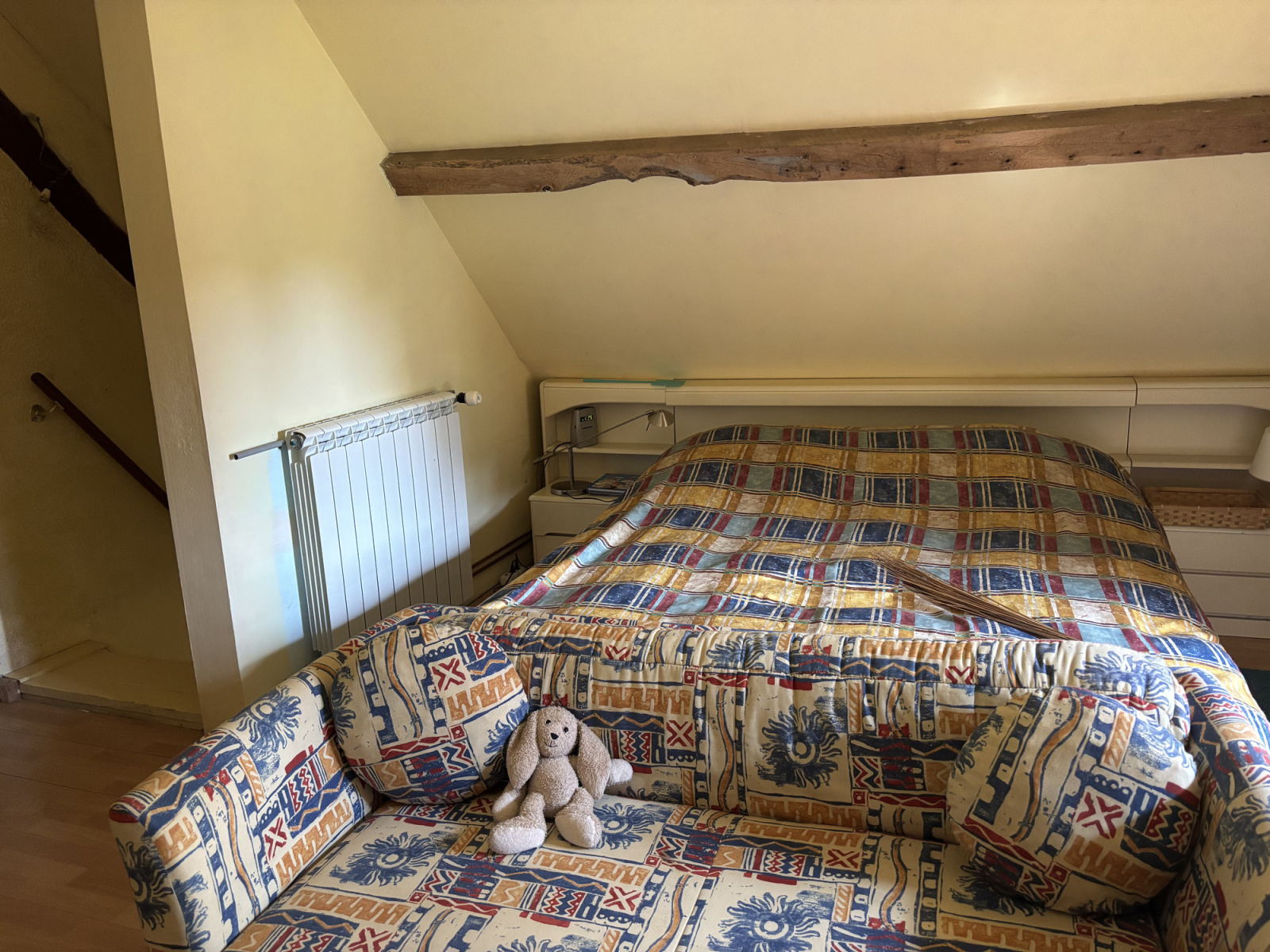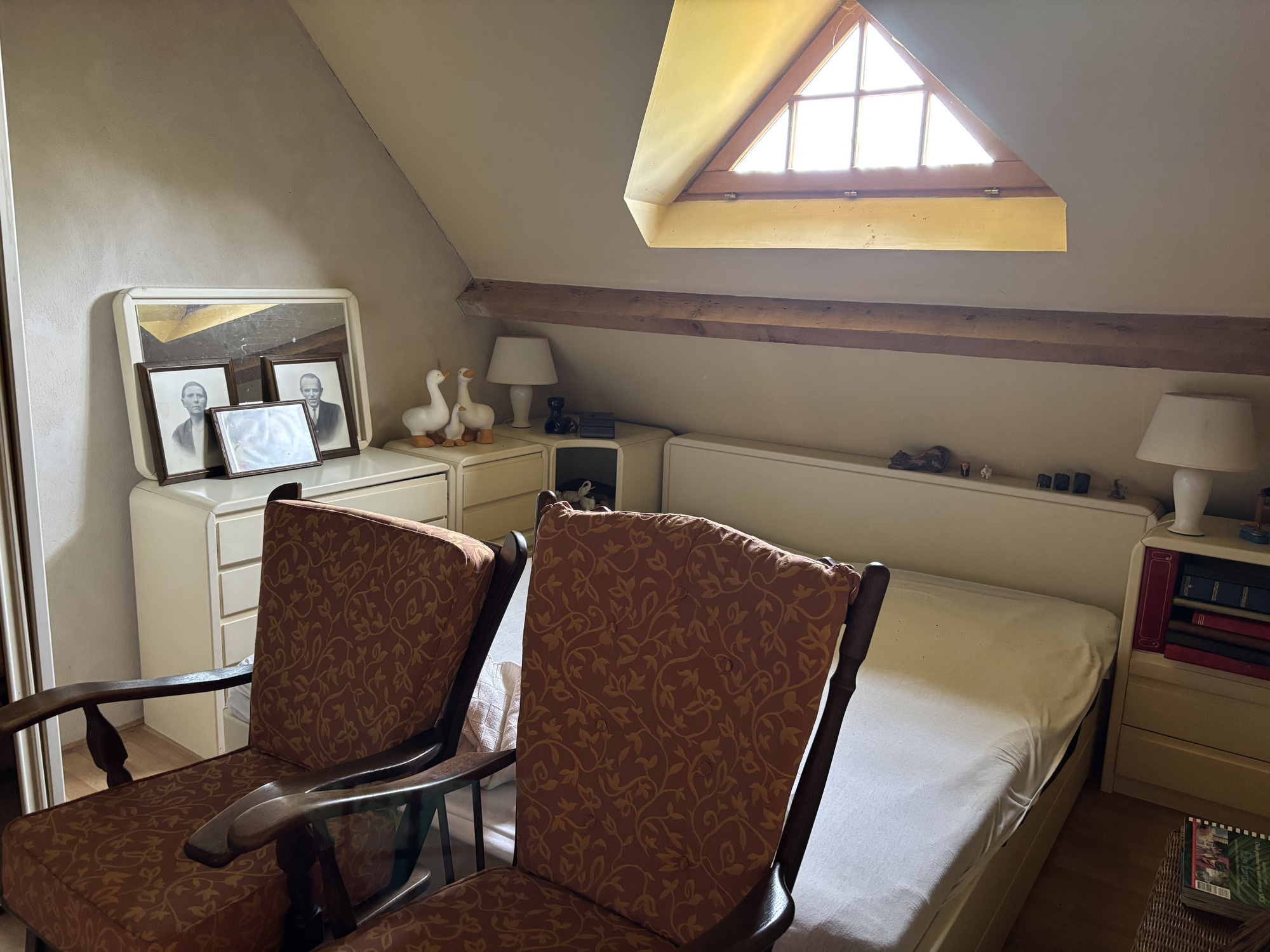 Depuis ce hall, un escalier mène à l'étage supérieur avec un palier et un grand placard, où se trouvent une troisième chambre à droite et une quatrième chambre spacieuse avec lucarne à gauche.