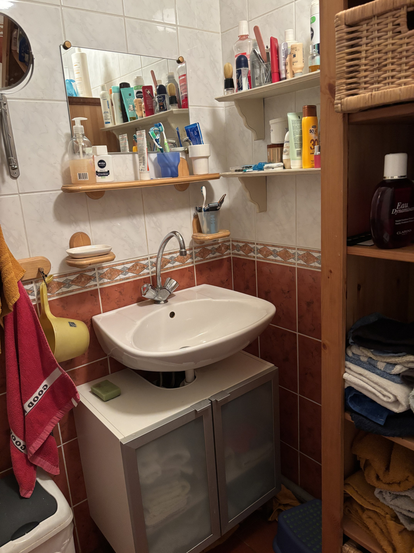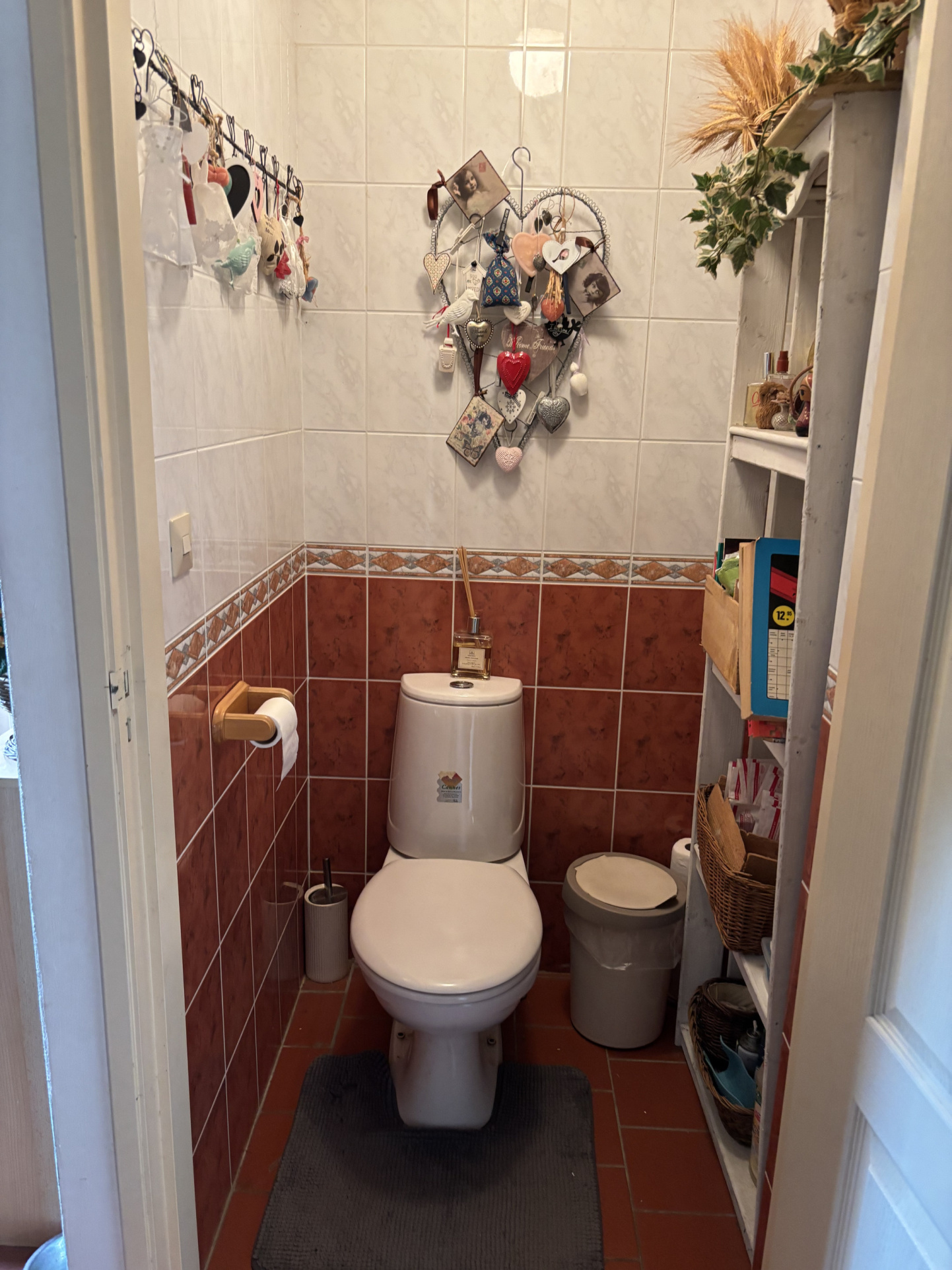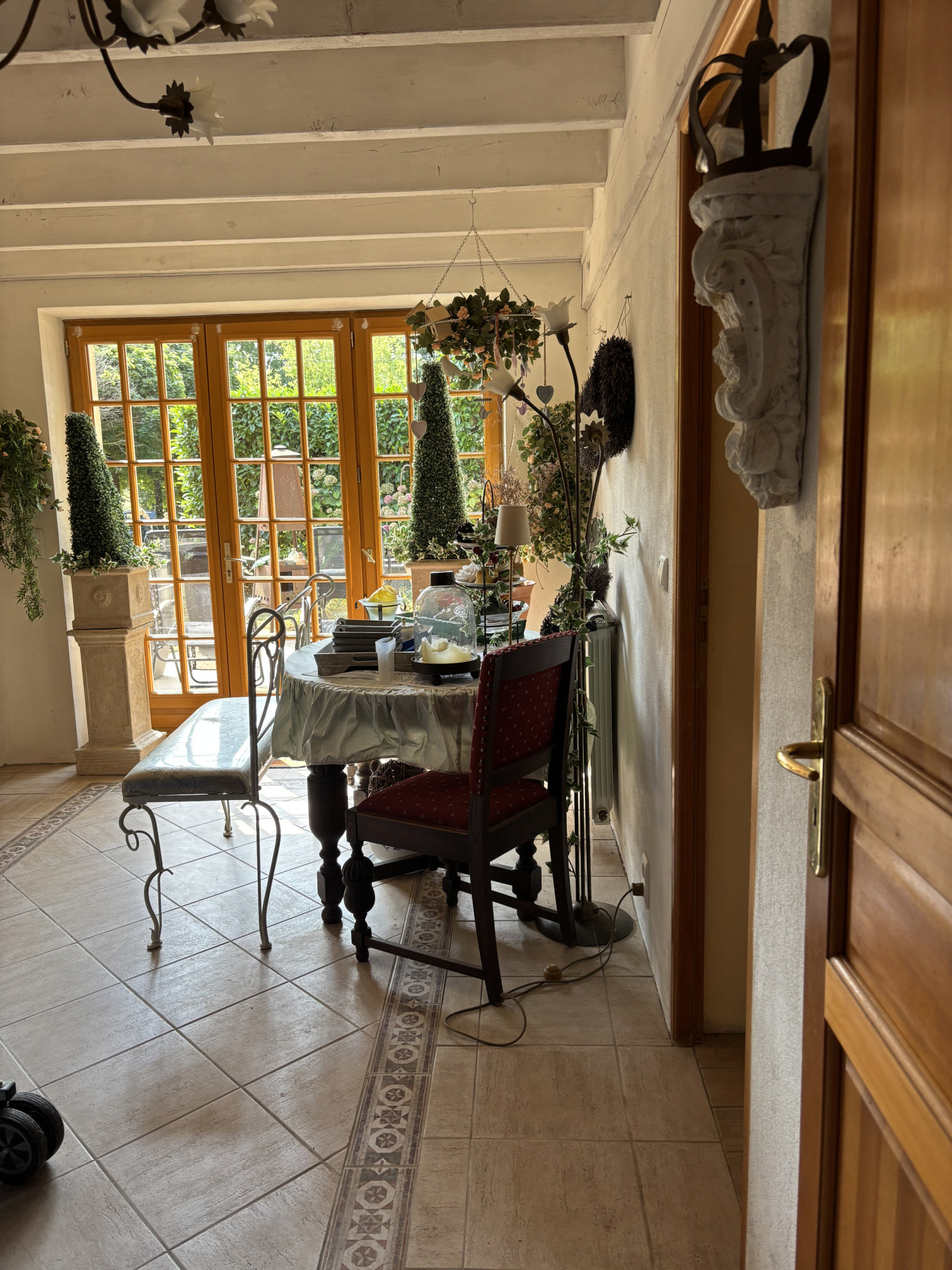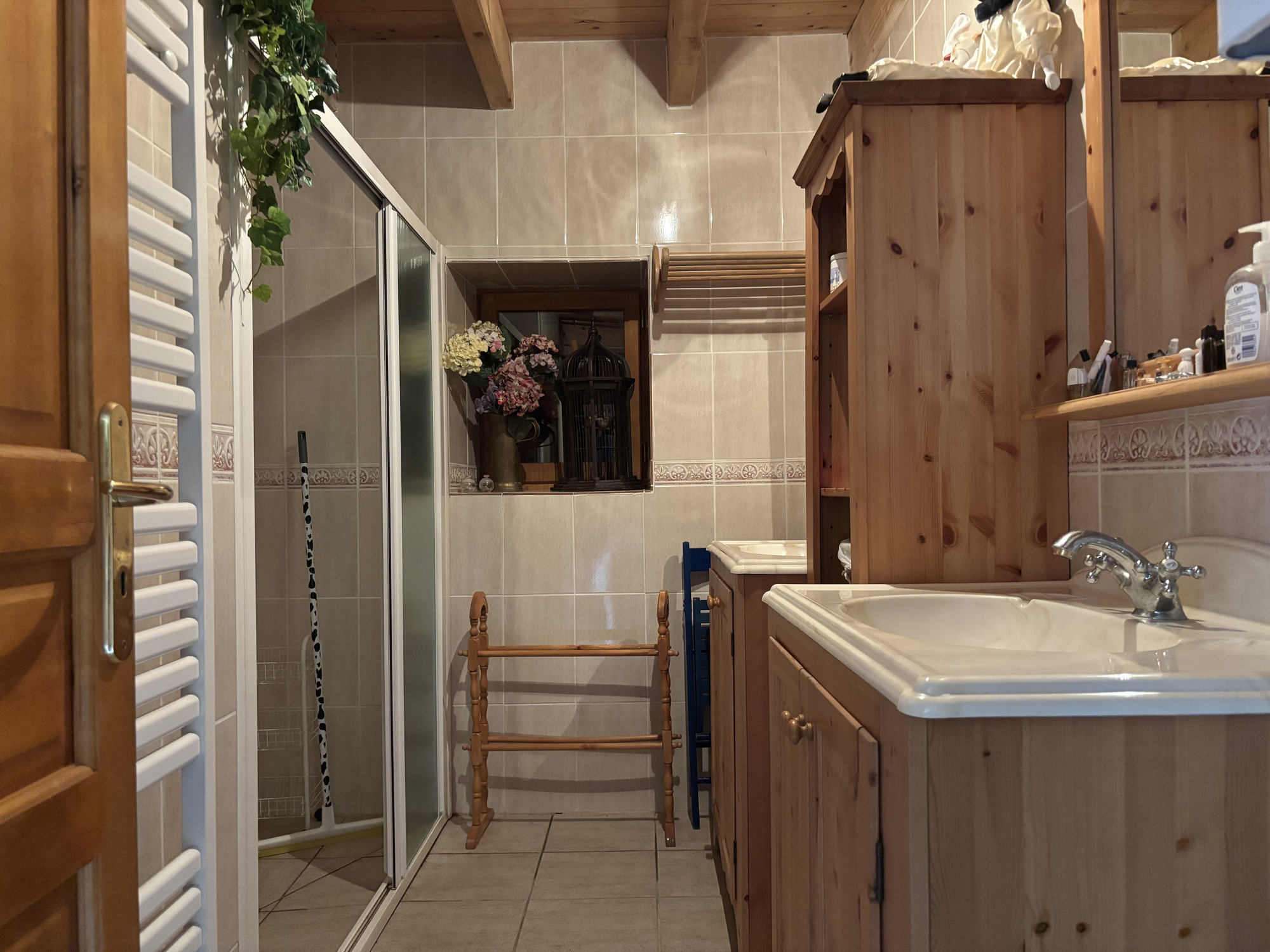 La véranda donne accès à un petit hall qui dessert différentes pièces. À gauche, vous trouverez des toilettes séparées, une porte donnant accès à la chaudière à gaz pour le chauffage central et la salle de bains avec douche, lavabo et raccordement pour la machine à laver.